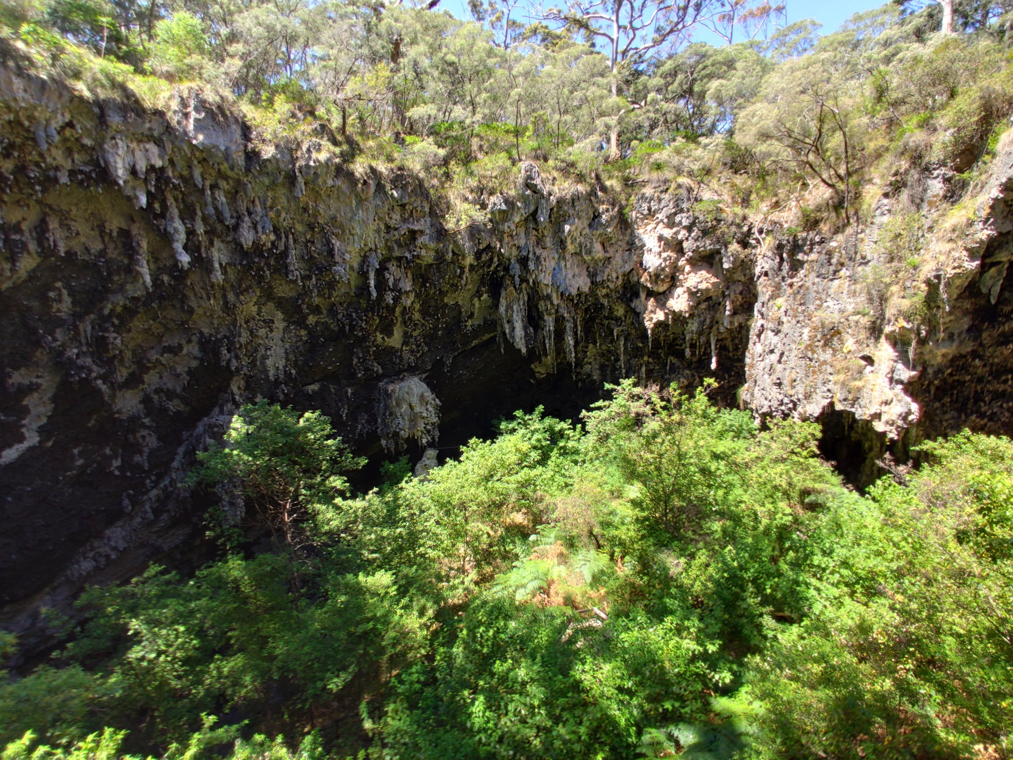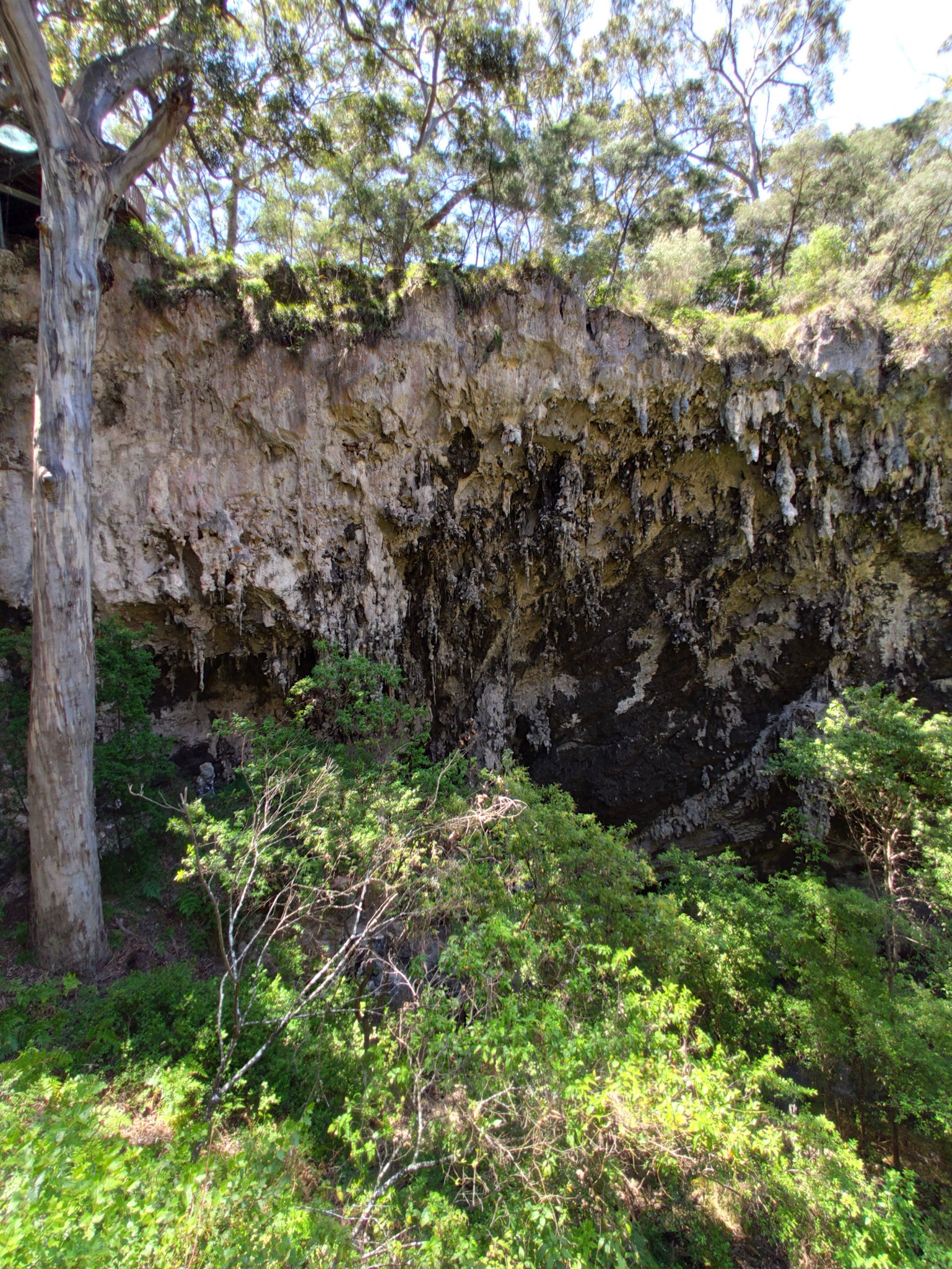 Oben führt die Caves Road durch imposanten Karri Wälder und durch geometrische angeordnete Weinreben, aber viele Dolinen (Einbrüche) künden dem Farmer oder Fachmann schon an, was darunter liegen wird.