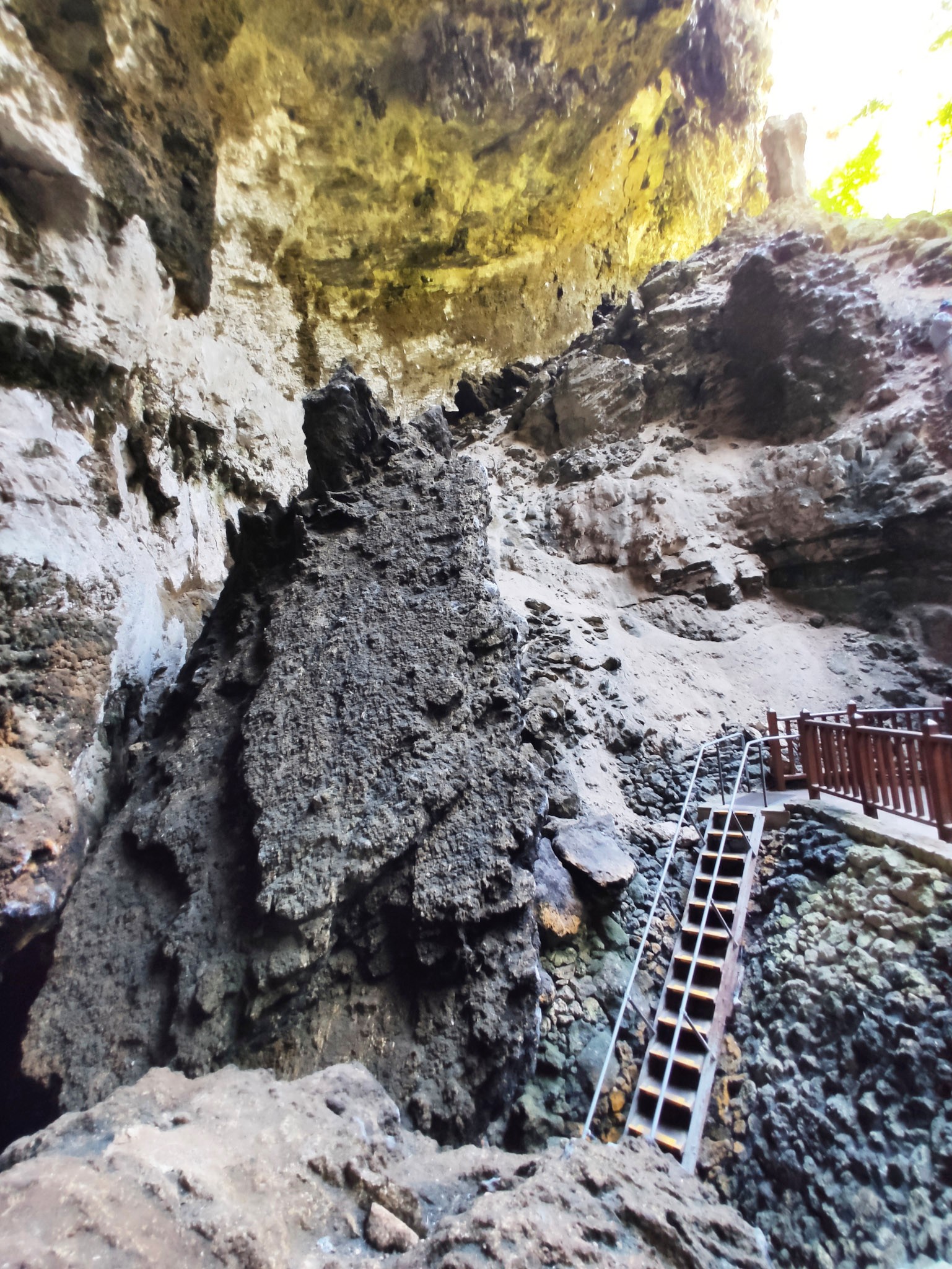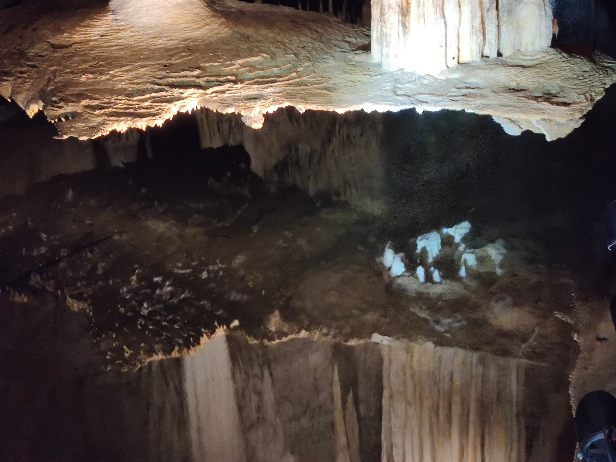 Schon kurz hinter dem Hängenden Tisch ist die Höhle zu Ende. Eine lange Bank ist dort aufgestellt, wo unsere kleine Besuchergruppe nun alle Platz nehmen soll. Unser Guide, der durch viel Witz und Sarkasmus glänzte, wurde nun still. Er schaltete das Licht für einen Moment ganz aus. Für wenige Momente umgibt uns tiefstes Schwarz und Stille. Nur ab und zu durchschnitten von Wassertropfen, die es sich nicht nehmen, und weitere Stalaktiten bauen und danach irgendwo glucksend in den See fallen. Irgendwo schleicht sich als ganz leichter Schimmer auch etwas Tageslicht in die Höhle.