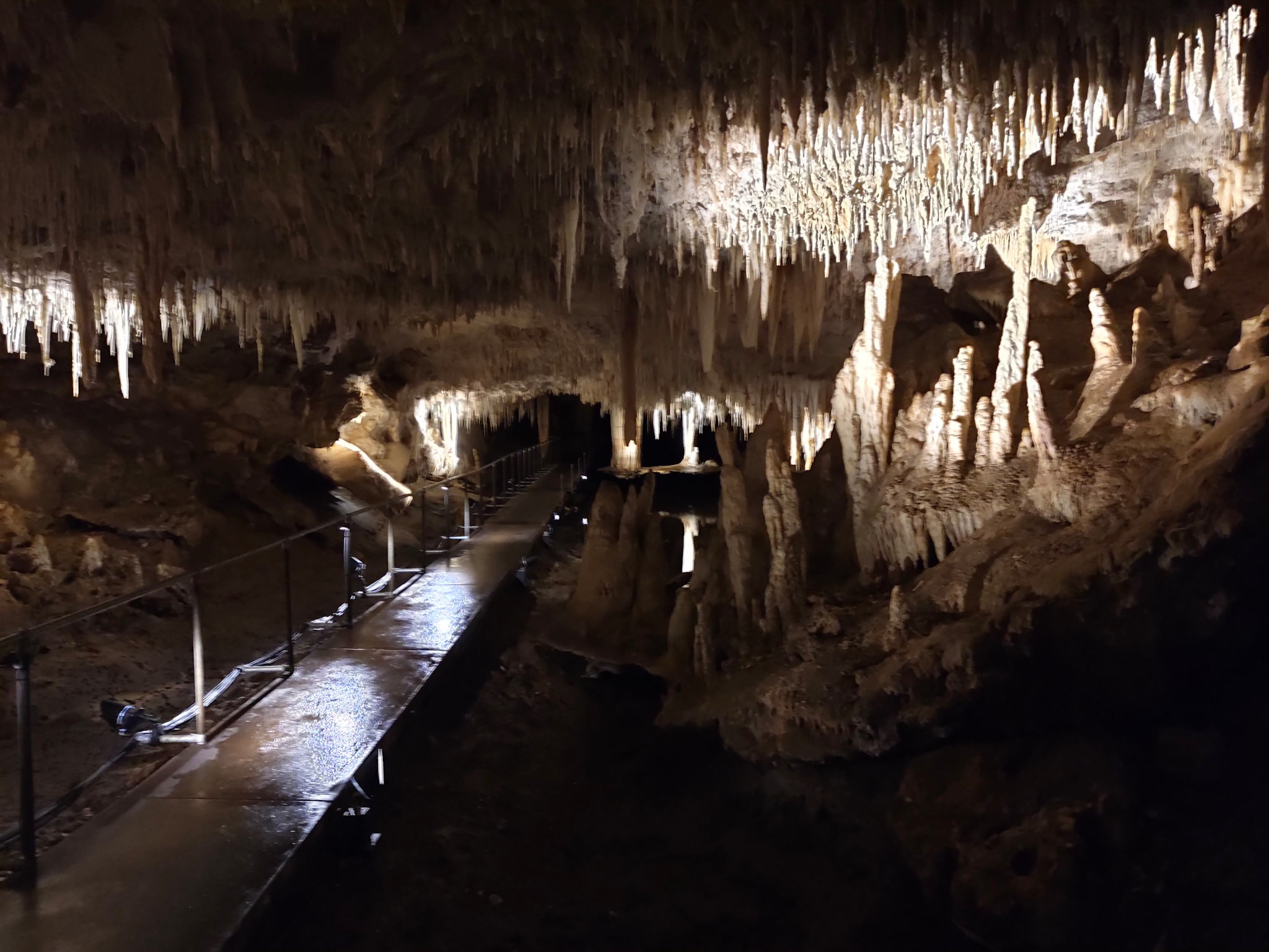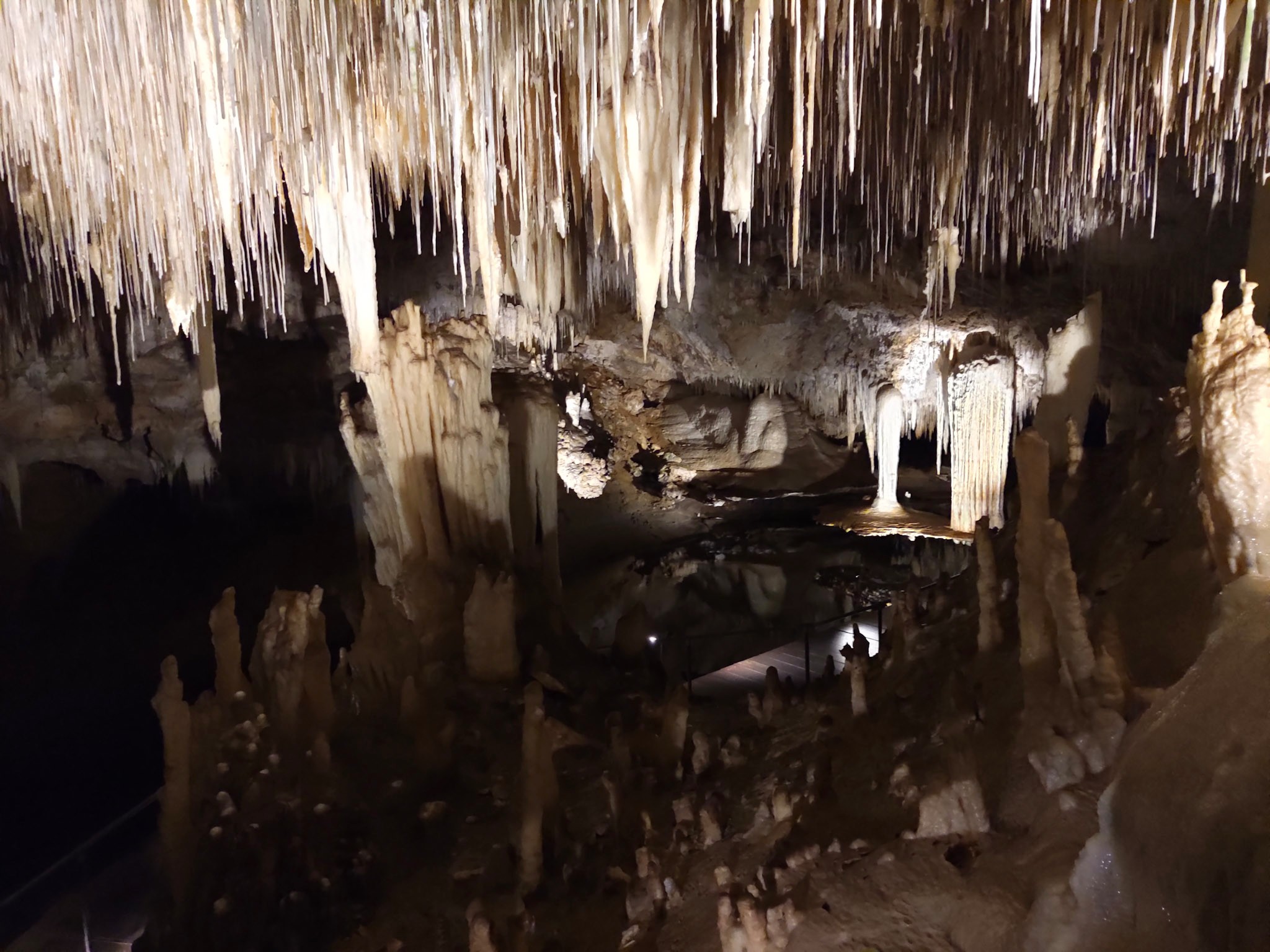 Lake Cave ist die tiefste der öffentlich zugänglichen Höhlen. Die 325 Stufen führen in eine Tiefe von 62 Metern zum Grund der Tropfsteinhöhle. Inklusive einer etwas engeren „Kopfweh“ Passage. Sie wurde so benannt, weil sich auf ihrem Grund ein See gebildet hat, der aus einem Bach gebildet wird, welcher auf seinem Weg zum Ozean hier durch fliesst. Das ruhige, klare, spiegelglatte Wasser reflektiert die wunderschönen weissen Kristallformationen, die von der Decke herunter wachsen. Man sieht an den Wänden, wie hoch dieser Bach bei Regenwetter gehen kann.