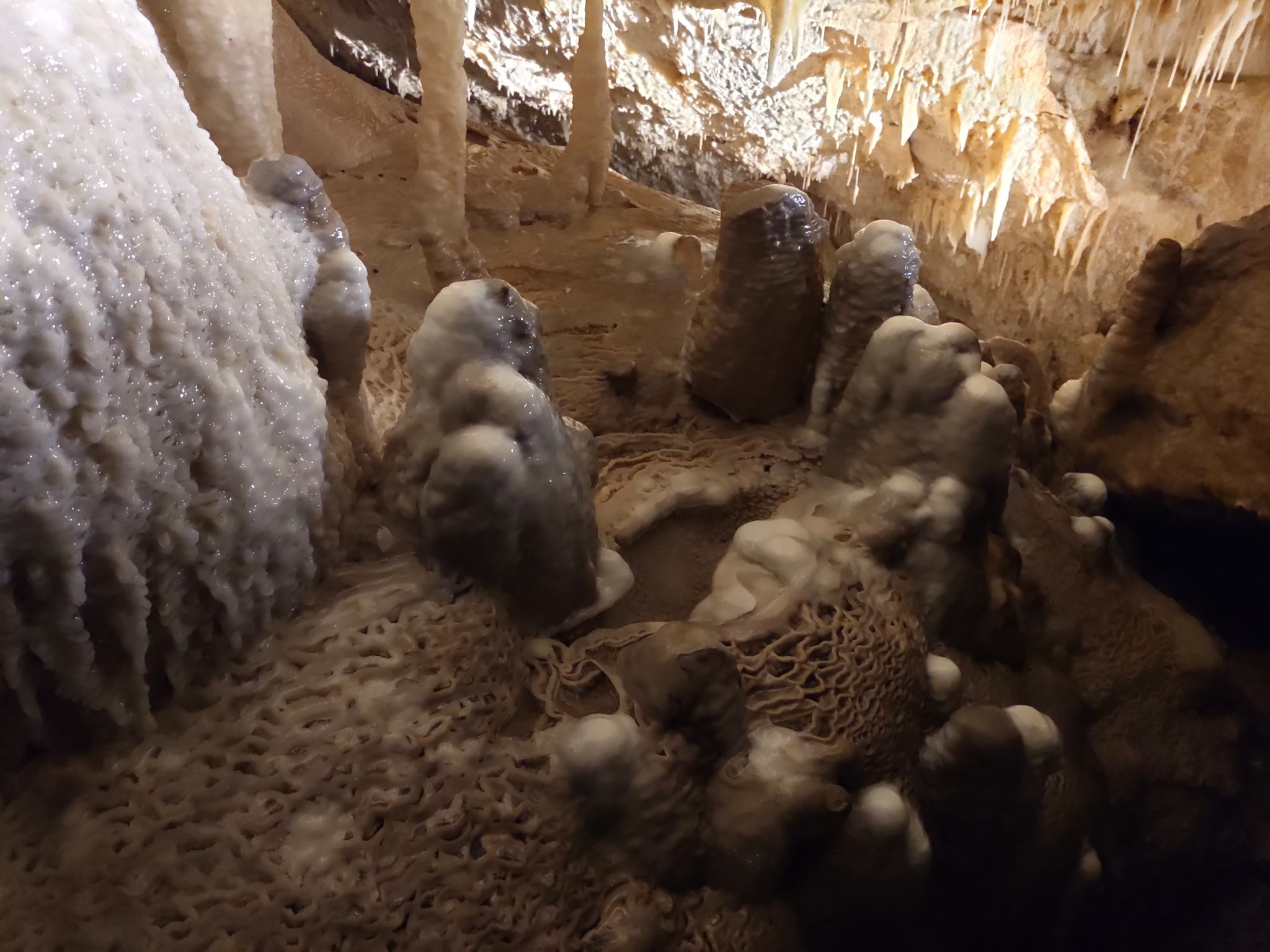 Wassertropfen haben diese Kalksteinschicht (Lime) über viele Jahrtausende jedoch sehr langsam aufgelöst und haben im Untergrund mehr oder weniger einen riesigen Emmentalerkäse gebildet: Zerbrechliche Kalkstein-Karsthöhlen mit einer Landschaft aus harten, die Fantasie anregenden Tropfsteingebilden.