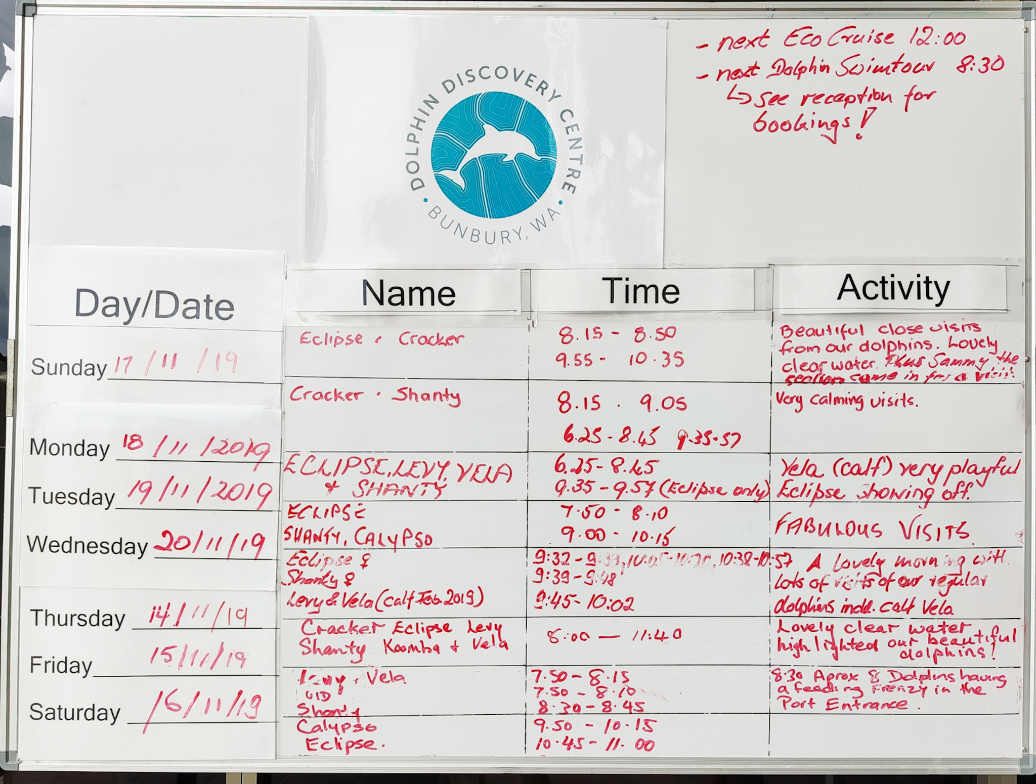 - Organisierte Schwimm/Schnorcheltouren zu den Delfinen mit dem lizenzierten Boot und mit beigestellten Wetsuits zu den Delfinen (meistens beim „Cut“ – findet im November jeweils am Morgen statt)