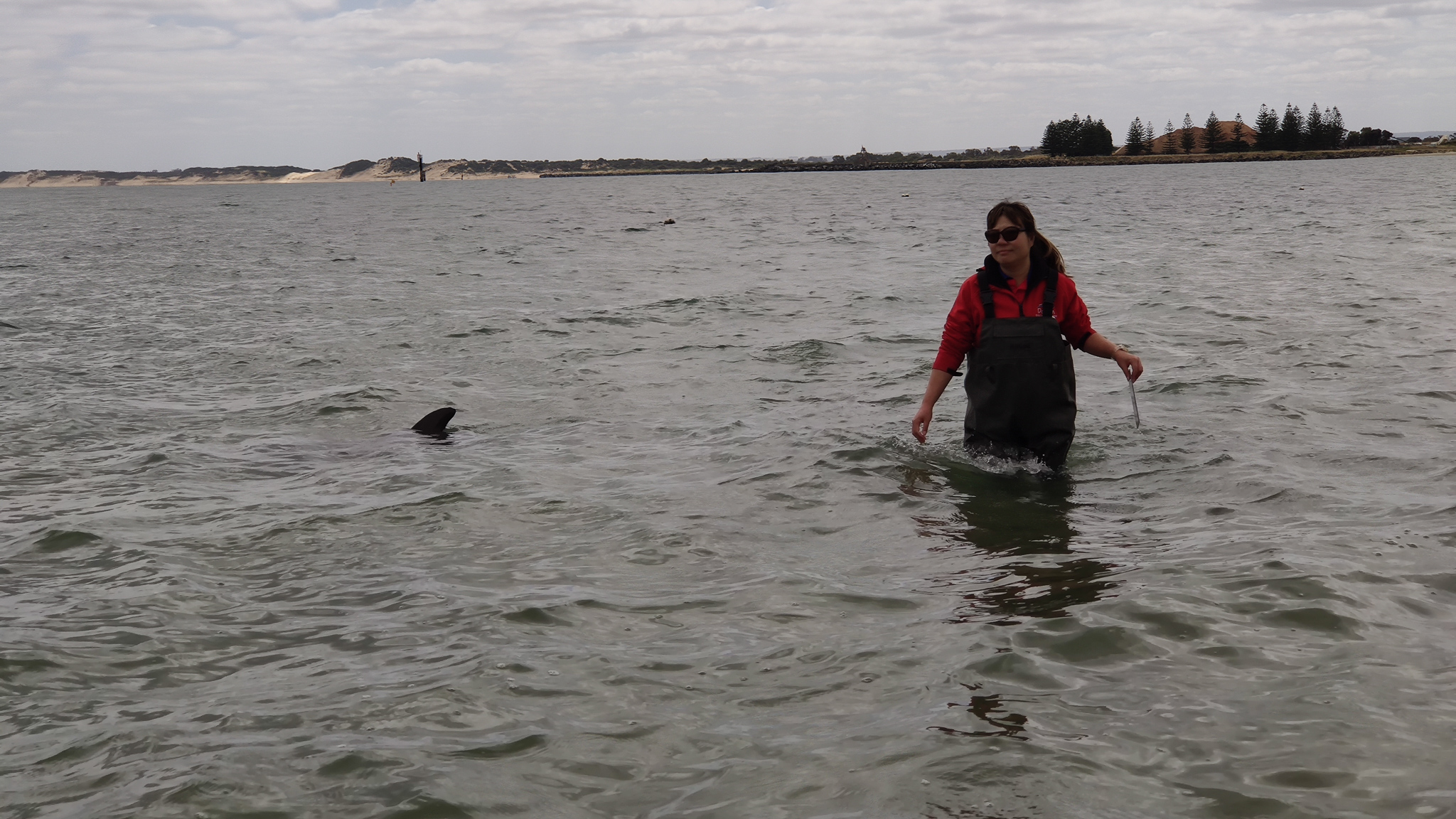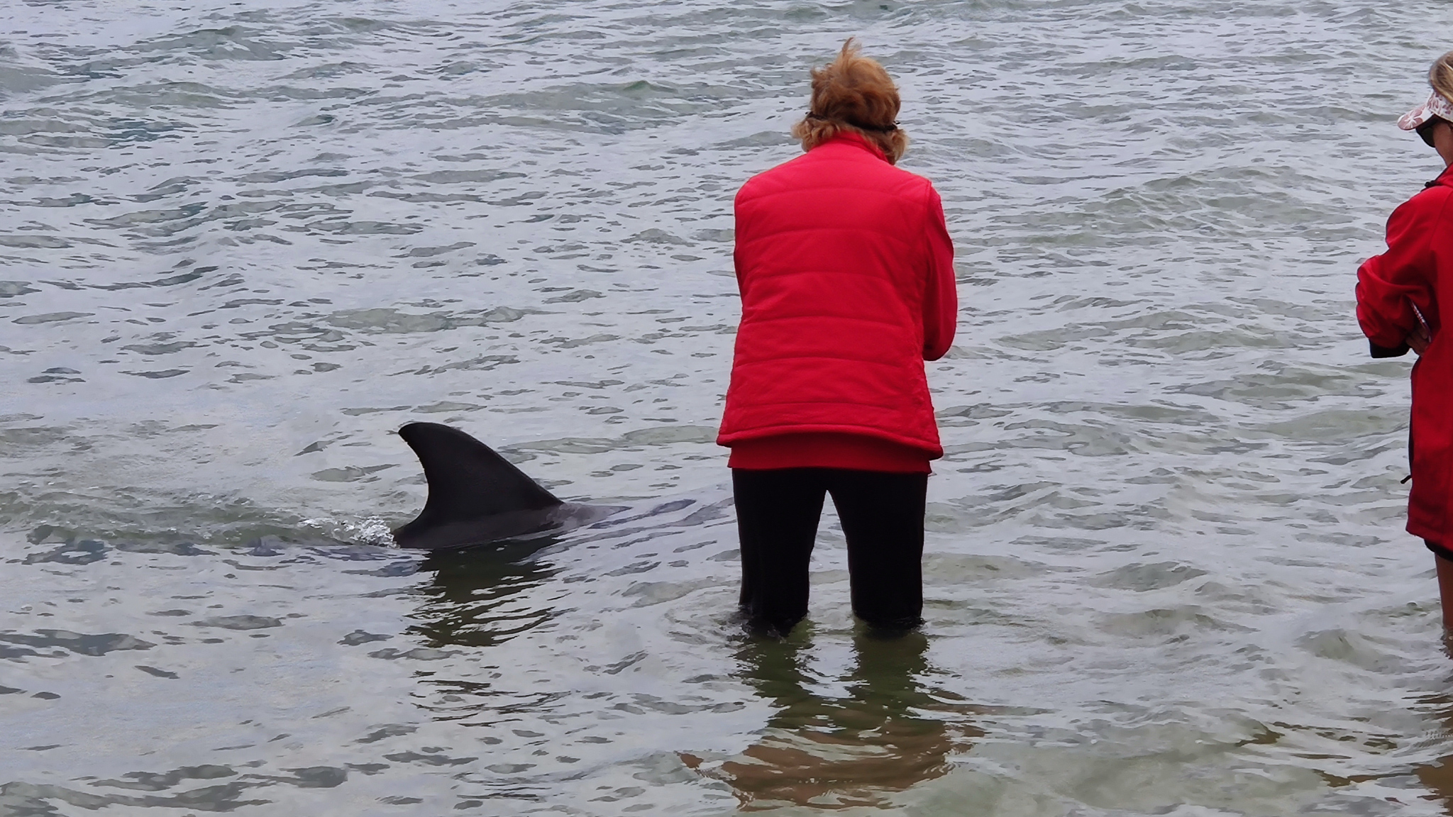 Wieder auf dem Weg zum Discovery Center sah ich, dass nochmals ein Besuch der Delfinmutter mit Jungem ablief. Dieses Mal habe ich nur vom trockenen Strand zugeschaut. Und kurz nach dieser Interaktion kam noch ein weiterer Delfin an. Das war ja richtig Hochbetrieb.