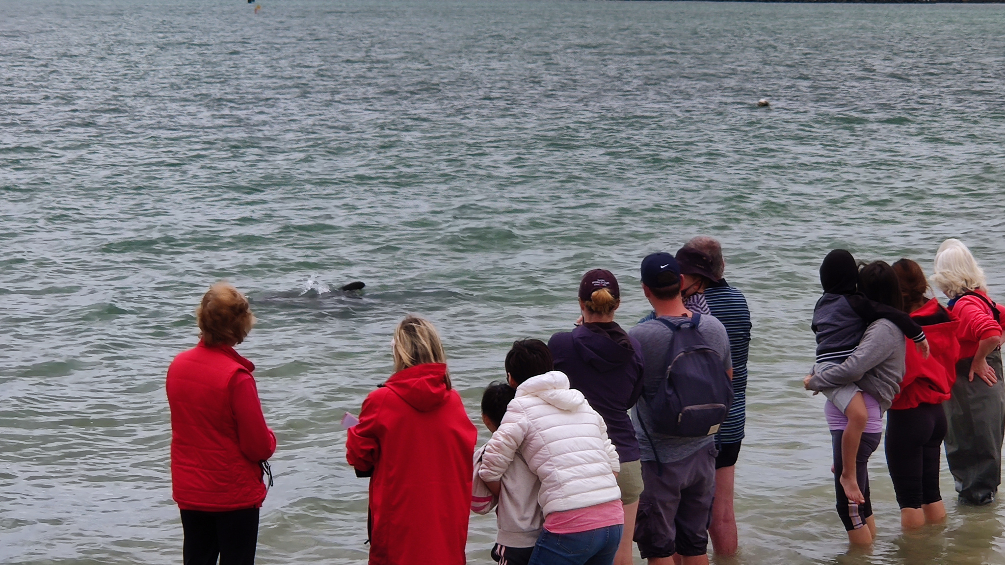 Aber ich hatte Zeit und wartete auf der Bank bei der Treppe zum Strand. Und dann kam die Delfinmutter und ihr 6-monatiges Kleines doch noch einmal vorbei. Auch ich liess es mir nicht nehmen, und krempelte meine kurze Hose rauf und stand auch in die Reihe ins Wasser. Die Delfinmutter nahm sich sehr viel Zeit und wir standen ziemlich lange im Wasser. Ich wurde bis zum Hintern nass, genoss aber den freiwilligen Besuch der beiden Delfine sehr.