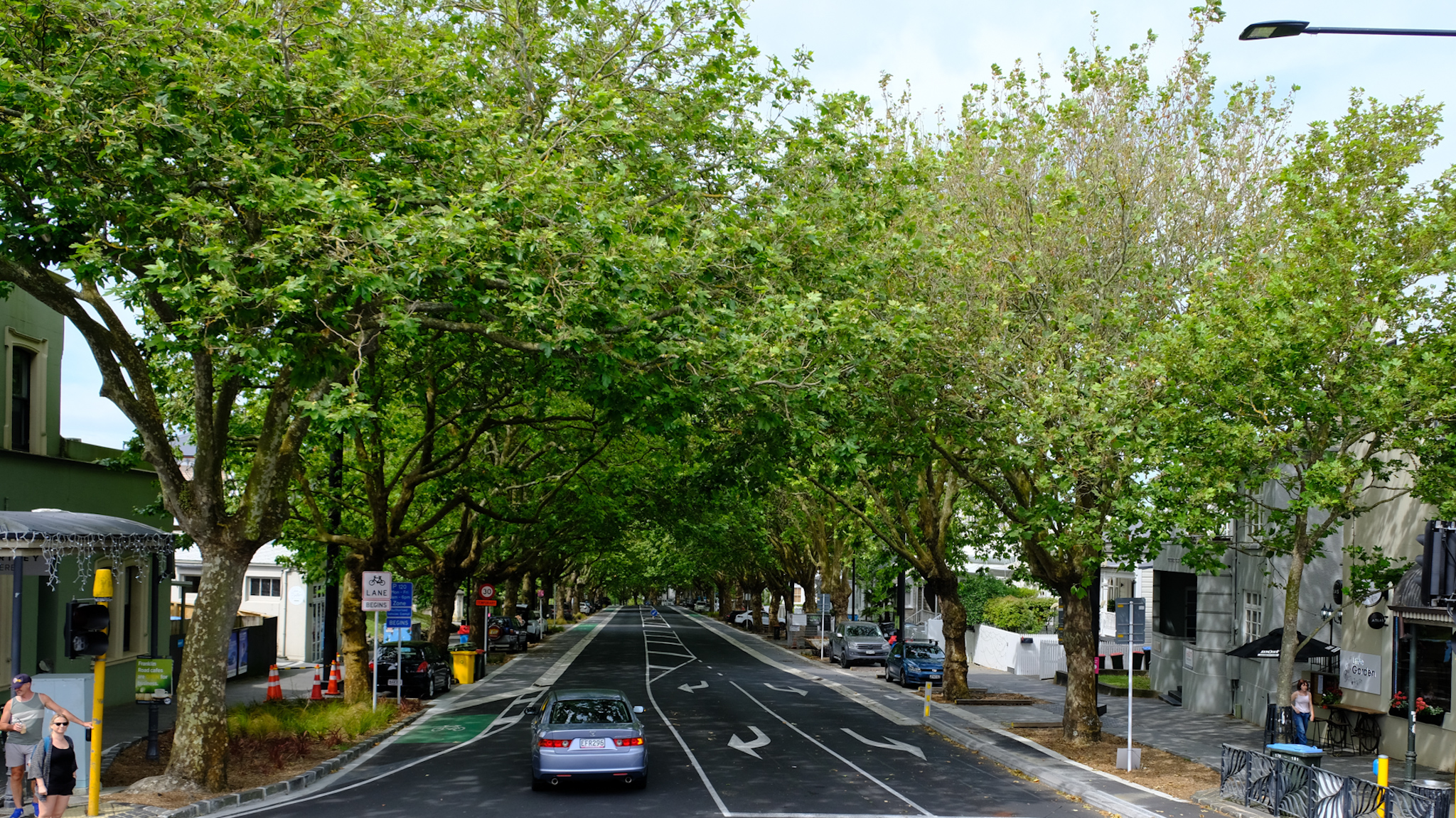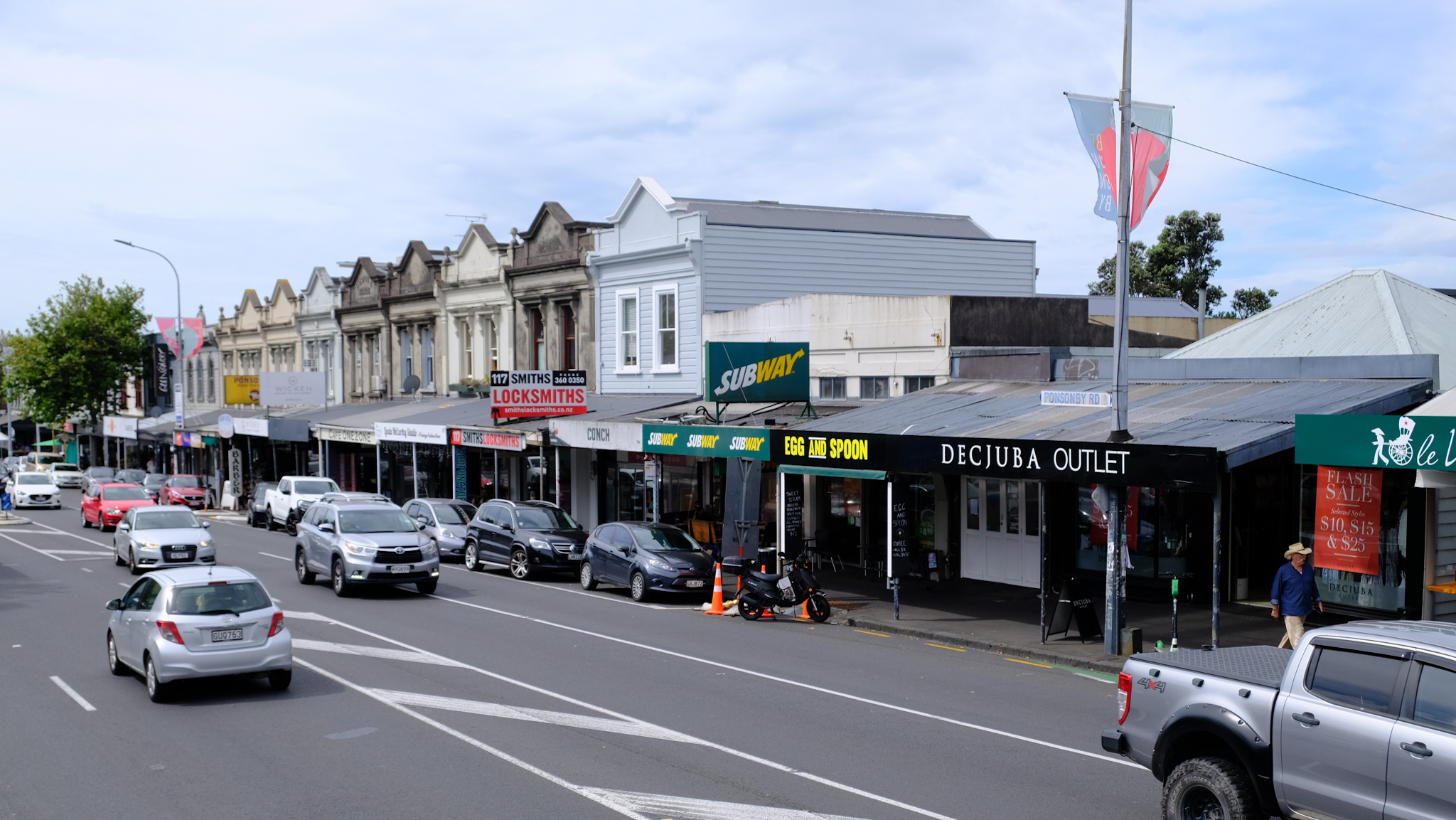 Wir fahren entlang der Karangahape Road (K-Road genannt), welche eine der bekanntesten Strassen Aucklands ist. Im 19. Jahrhundert wohnten hier vorwiegend reiche Kaufleute, im Laufe der Jahre entwickelte sich die Strasse zu einer eher schmuddeligen Vergnügungsmeile. Von den Bemühungen, der K-Road ein moderneres Gesicht zu geben, ist bisher wenig zu spüren, allerdings ist die Straße heute weniger anrüchig als hip: Es gibt trendige Cafés, Hippie-Läden, Secondhandshops, kleine internationale Garküchen und vor allem ein ausgeprägtes Nachtleben. Ein buntes Völkchen trifft sich hier, vor allem am Wochenende ist auf der K-Road viel los.