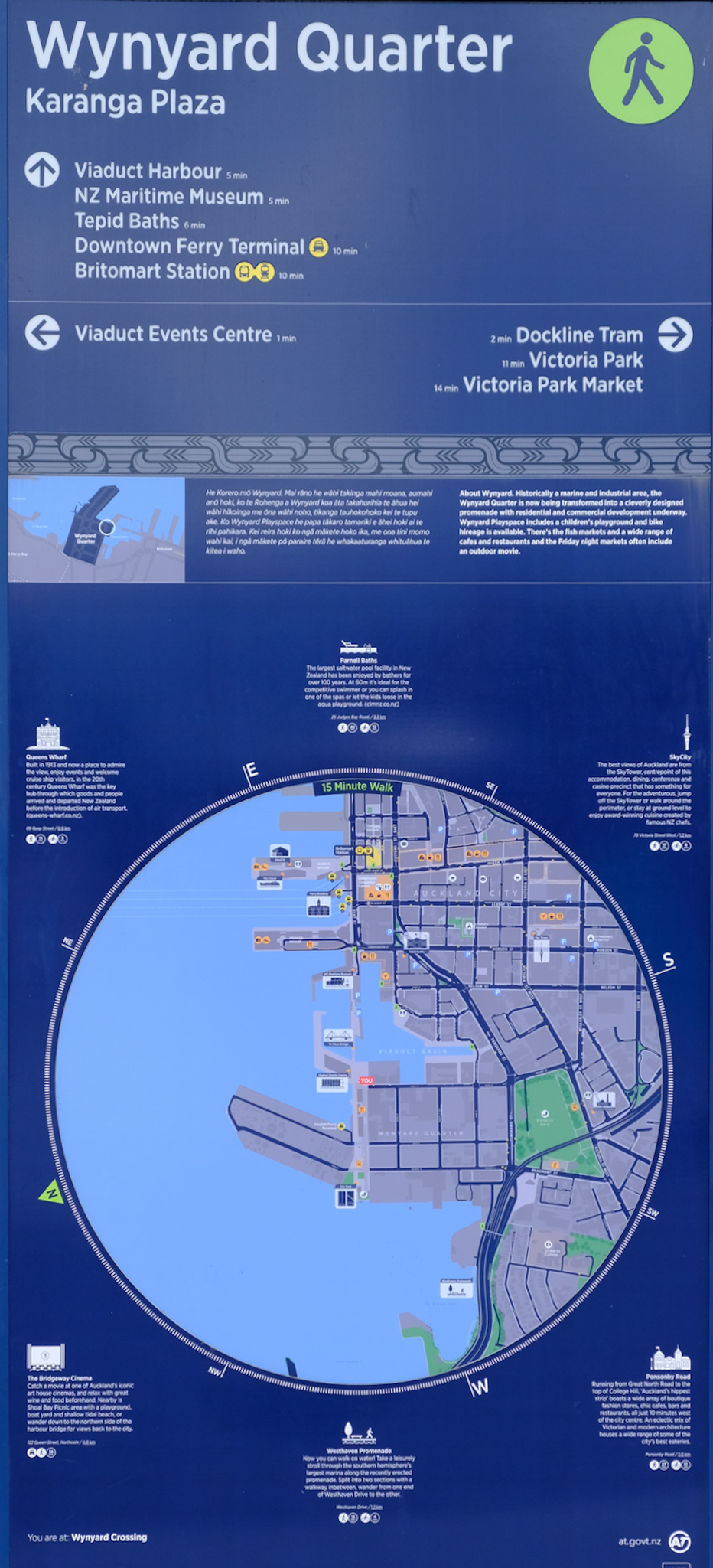 Nach einem fünfeinhalb-stündigen Nachtflug und 5 Stunden Zeitdifferenz bin ich um 6 Uhr morgens von Perth in Auckland gelandet. Die Immigration ging rasch und freundlich, aber sehr streng (Wanderschuhe auspacken, X-Ray) vonstatten, sodass ich schon kurz nach 7 Uhr in meinem Appartement mitten im CBD (Avani Auckland Metropolis, sehr empfehlenswert) angekommen war. Der Sky Bus ist so früh am Morgen und nur mit 3 Passagieren sehr schnell in der City. Nach dem Einchecken musste ich zuerst noch den Kühlschrank füllen und mir ein Frühstück zubereiten. Nach einer kleinen Pause war mein Biorhythmus dann gegen Mittag wieder einigermassen auf Tagbetrieb eingestellt. So machte ich mich auf zur Queen Street und zum Quai, um zu schauen, auf was ich Lust hätte. Am Quai, respektive am Ort der ehemaligen Britomart Station erwartete mich eine riesige Baustelle: Es wird bis 2024 eine neue Stadtbahn mit dem ersten Untergrund-Bahnhof von Neuseeland gebaut. Rundherum herrschen weitere Bautätigkeiten.