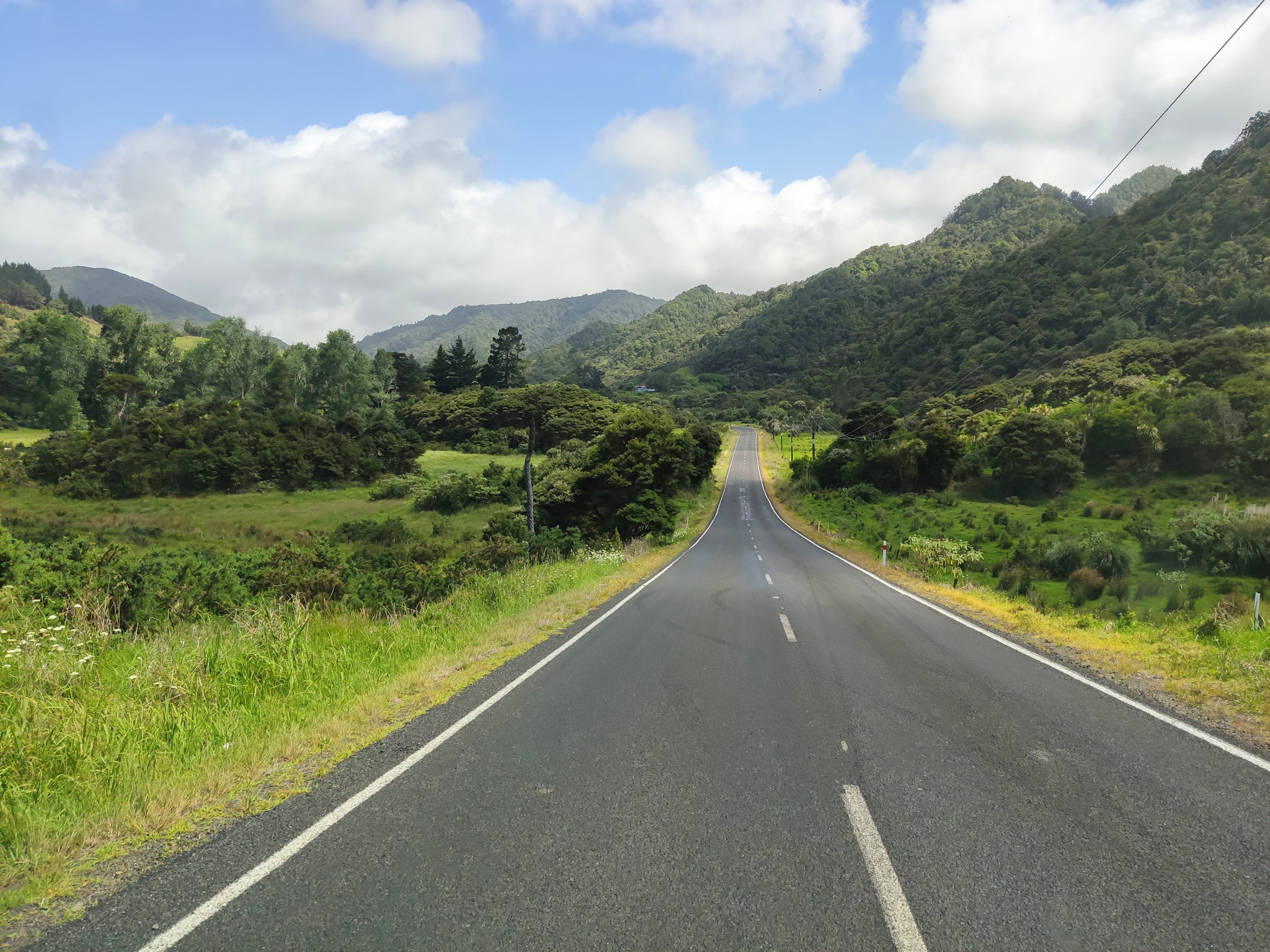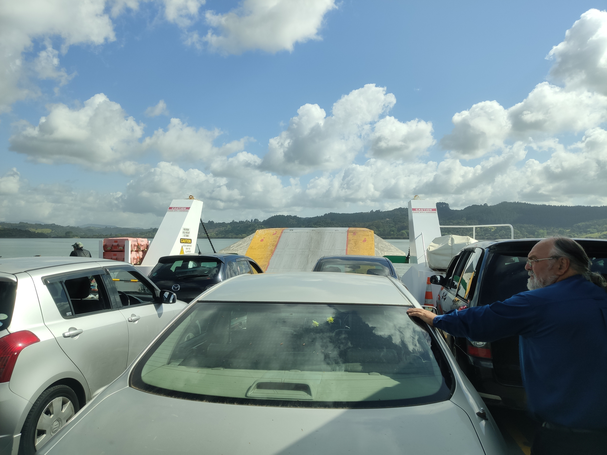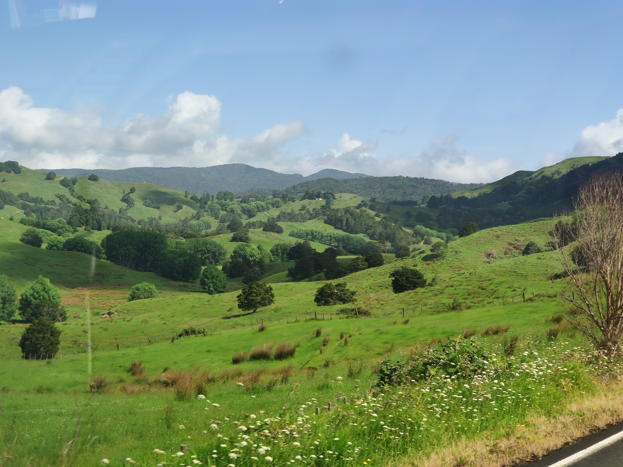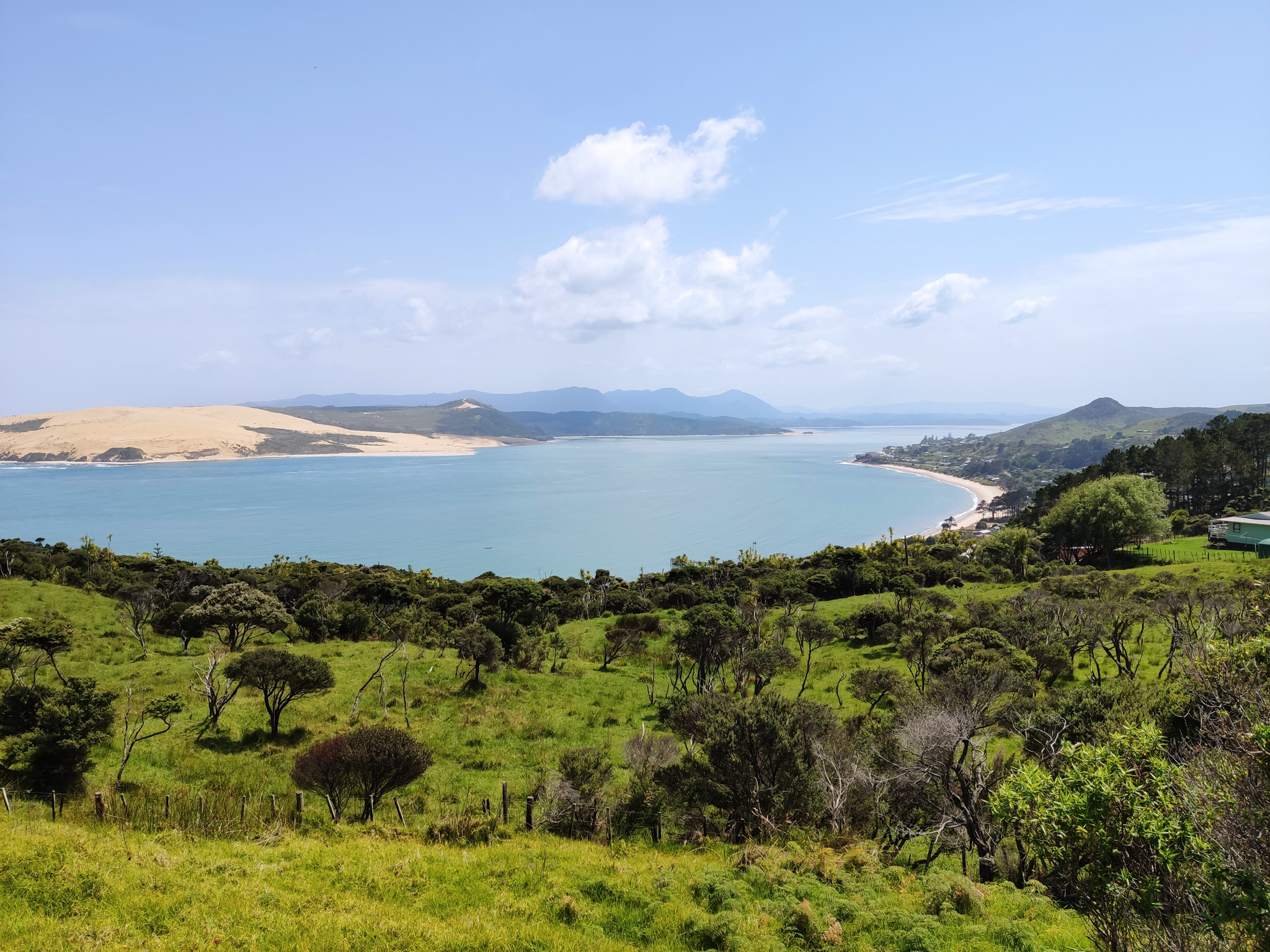 … und bin danach über die grünen Hügel nach Rawene gefahren, um dort die Fähre zu nehmen und über weitere grüne Hügel und Täler nach Ahipara zu gelangen.