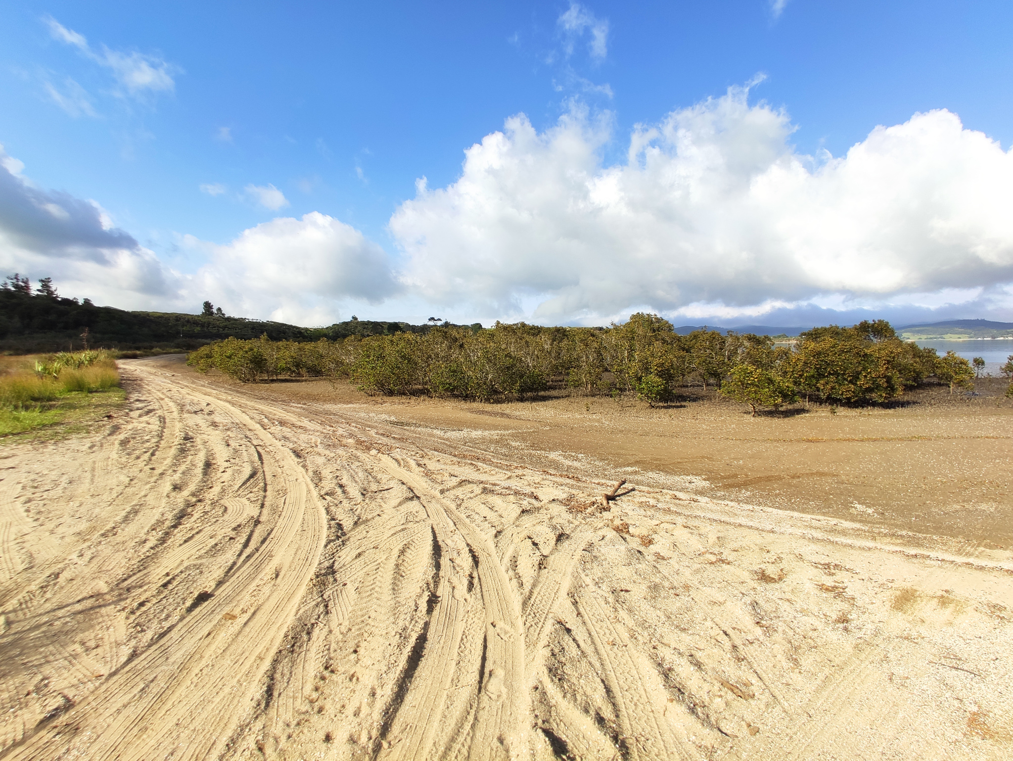 Ich machte dann im Kauri Coast Top 10 Holiday Park einen Übernachtungshalt. Der Caravan Park ist sehr idyllisch an zwei sich vereinenden Flüssen gelegen. Ein Pfad (mit ausführlicher Beschreibung vieler Pflanzen) führt durch den Park. Ein Exponat ist übrigens der Silberfarn, der ikonische Nationalfarn der Neuseeländer. Spannend sind auch die Neophyten, welche auf den Bäumen wuchern und die riesigen Liliengewächse (irrtümlicherweise Flachs genannt), deren Blätter zum Flechten benutzt wurden. Nachts kann man unter der Brücke Glühwürmchen bestaunen (ich habe keine gesehen) oder neuseeländische Aale im Fluss beobachten. Ein tolles und sehr gepflegtes Idyll. Der Holiday Park steht übrigens altershalber zum Verkauf.