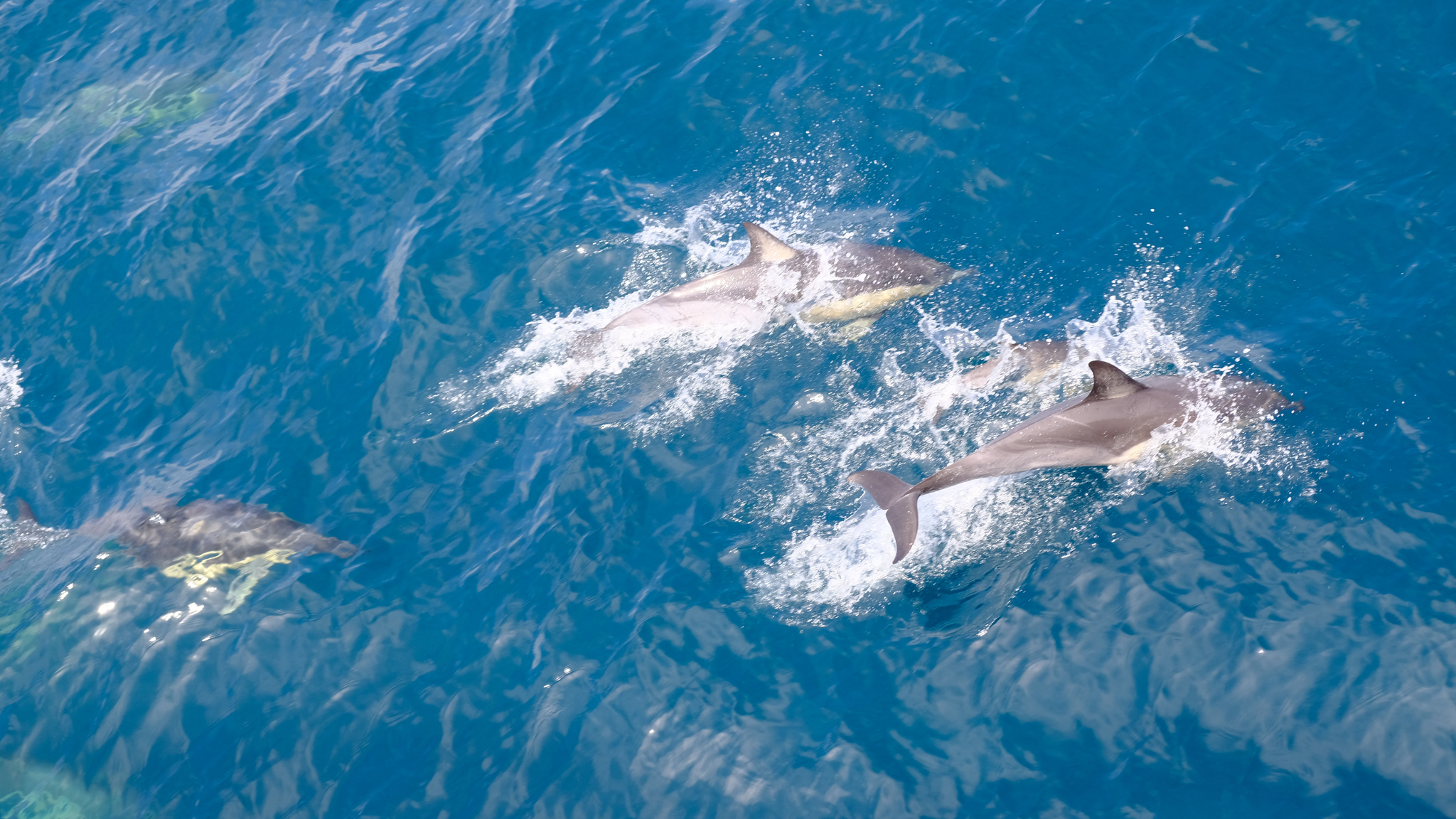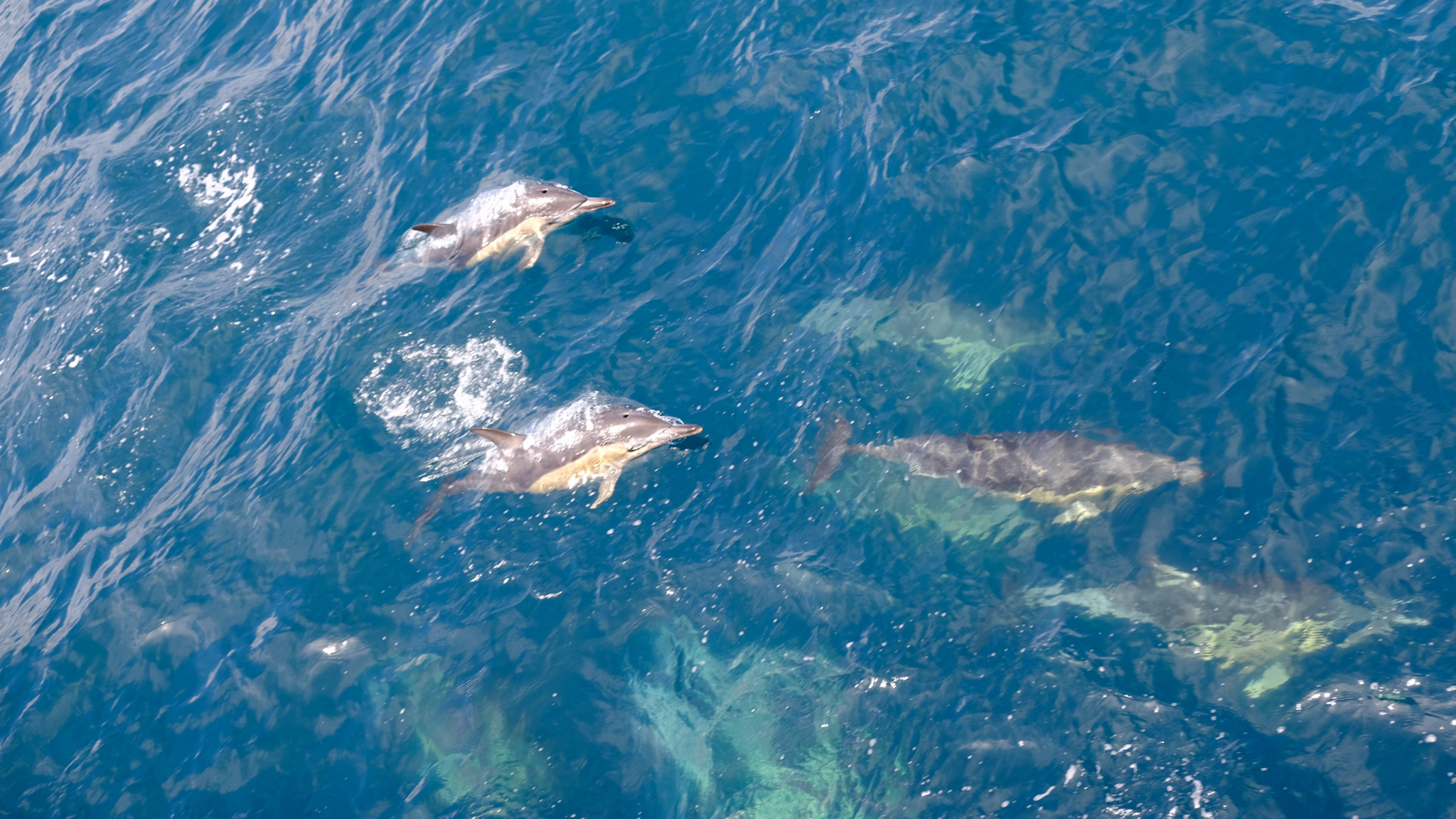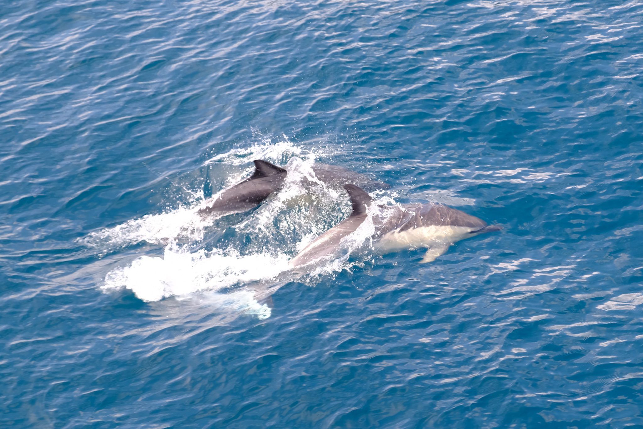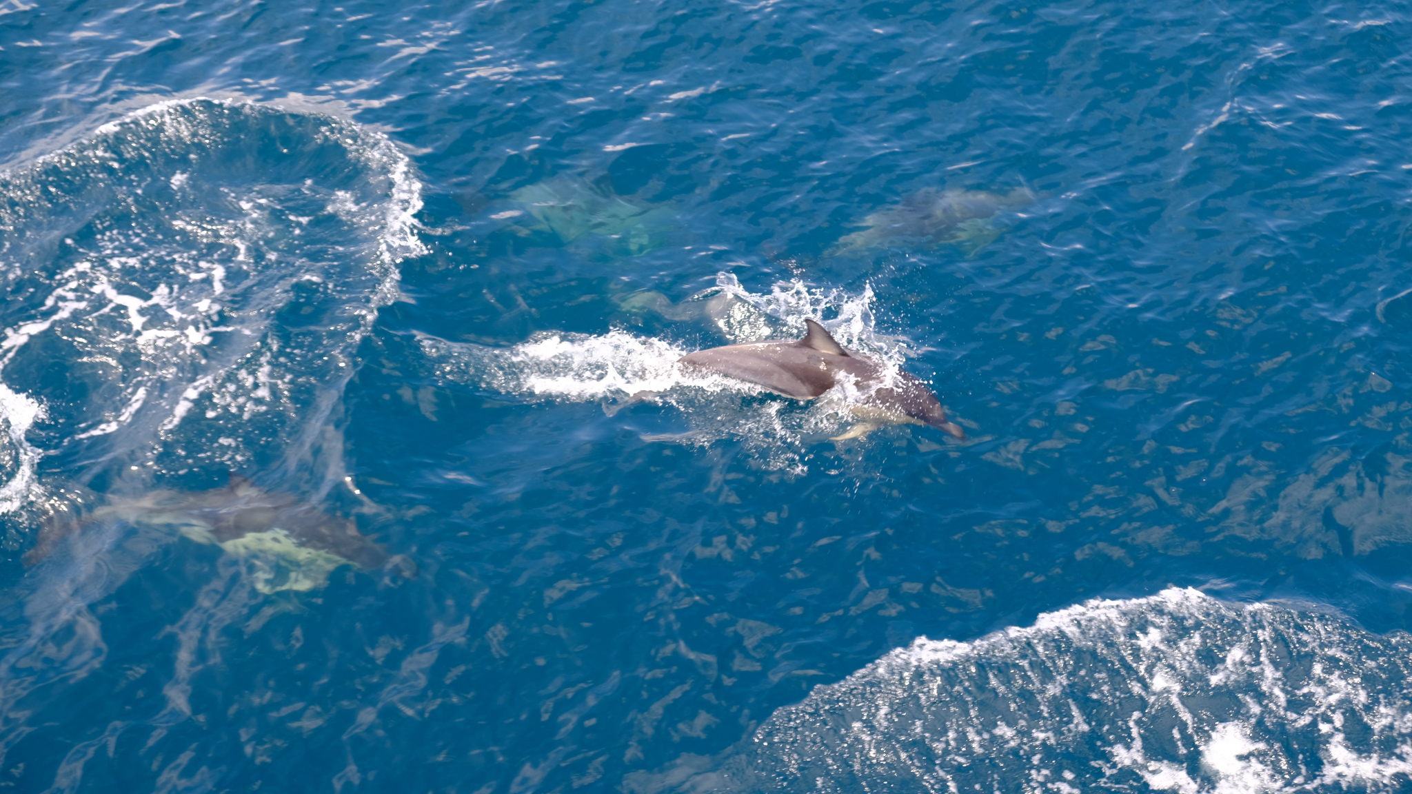 Das zweite Schiff, welches nur zum „Hole in the Rock“ fährt, hatte tatsächlich eine Gruppe von Delfinen. Die sicher 40-50 Tiere umfassende Gruppe von schön gefärbten, gewöhnlichen Delfinen umkreiste unser Schiff in allernächster Nähe. Ich konnte vom Observation Deck aus ein paar Schöne Fotos machen. Diese Delfinart kommt eher selten in der Bucht vorbei. Ich habe noch nie so viele Delfine beisammen gesehen! Das war ein äusserst beeindruckendes Erlebnis!