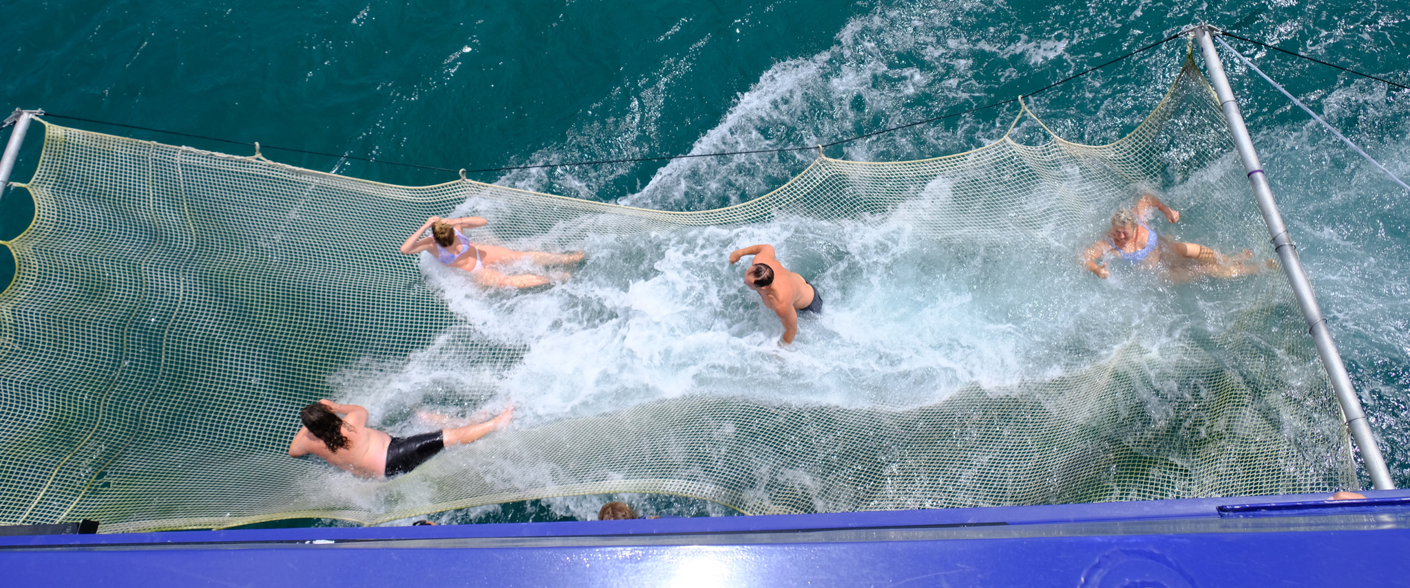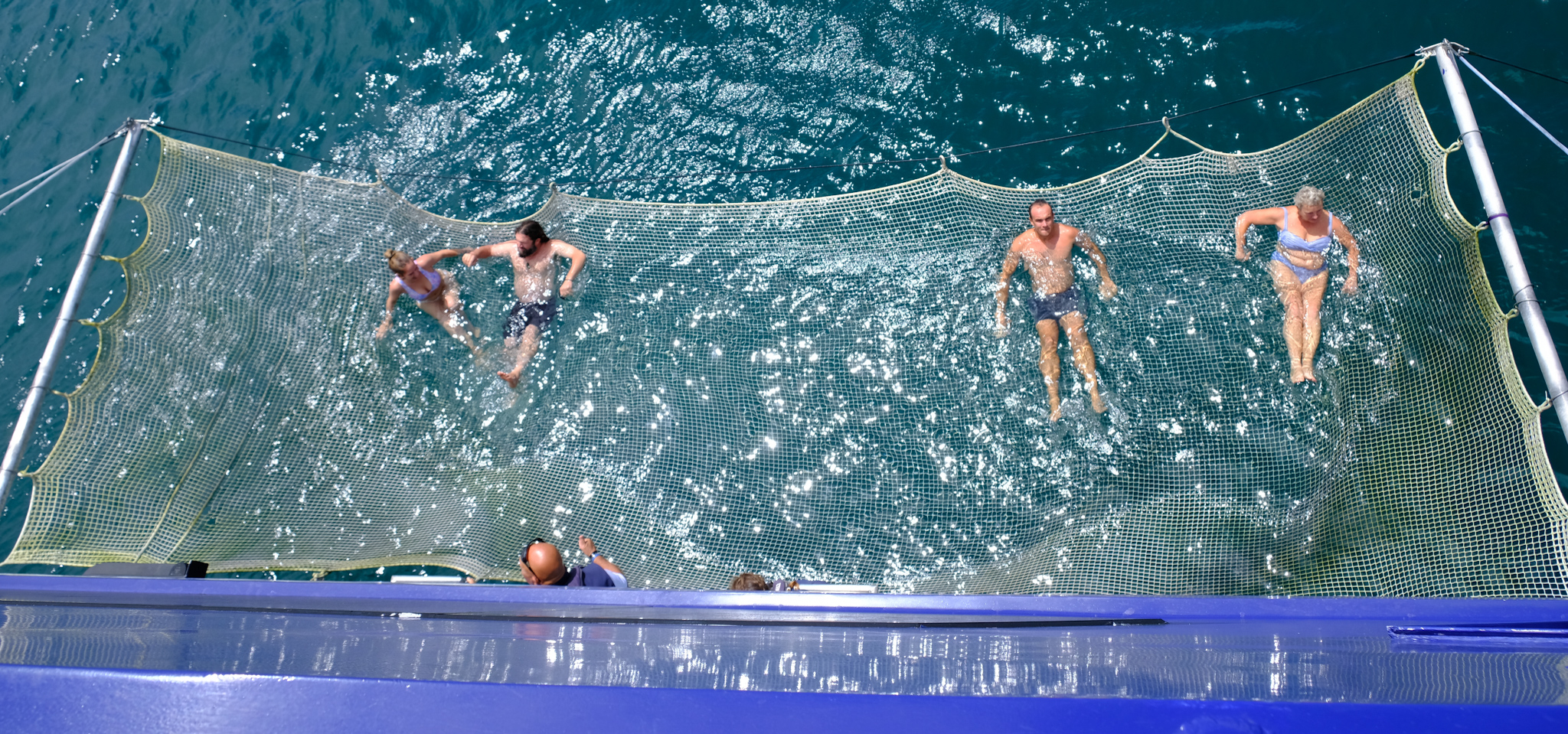 An einer geschützten Stelle zwischen den Insel hat die Crew noch dass Boomnet ausgefahren und 4 Gäste haben die Gelegenheit für ein Bad genutzt. Der Skipper ist vor und zurück gefahren, was ziemliche Strömung und Sprudel für die Baden den bedeutete.