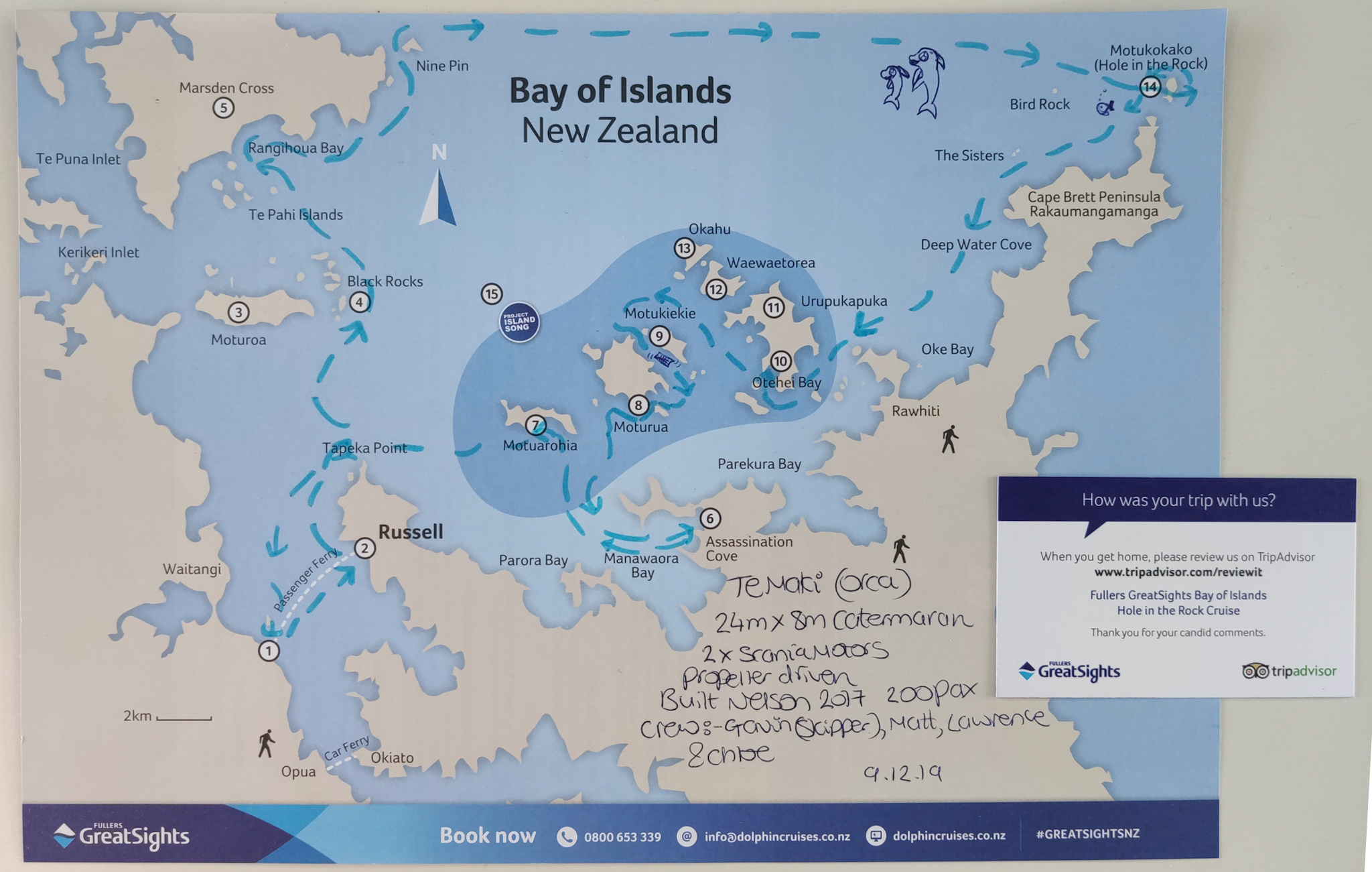 Es waren total nur etwa 30-40 Gäste, somit hatten wir auf allen Decks nach der Abfahrt um 09:30 und dem Anfahren von Russel, wo weitere Gäste zustiegen, sehr viel Platz.