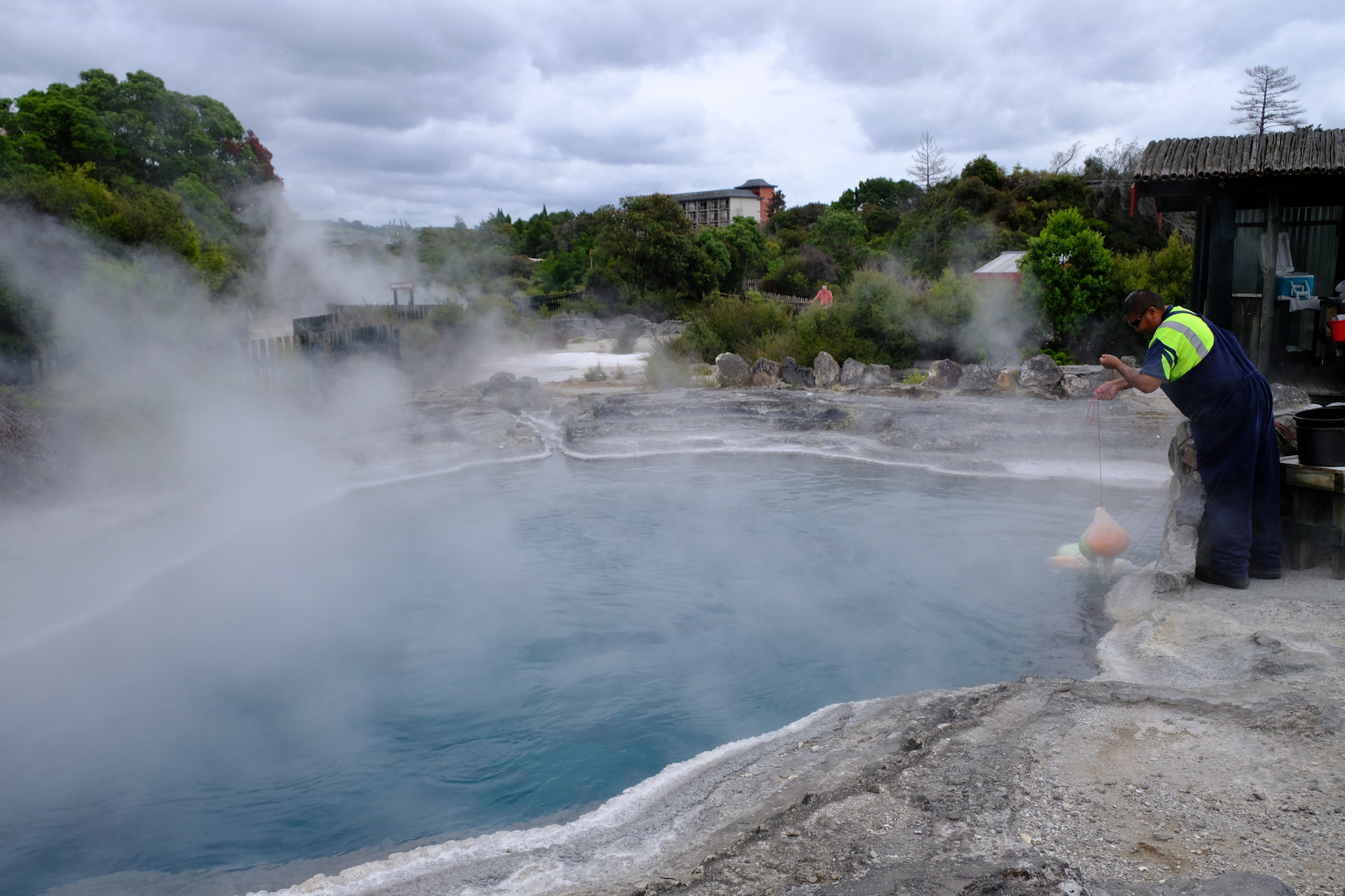 Ich fand es sehr interessant, tatsächlich live zu sehen wie die Bewohner Hāngi-Mahlzeiten in den kommunalen Dampfboxen zubereiten und Mais (vor allem für die Touristen) im sprudelnden Wasser der geothermischen heissen Pools kochen – so wie sie es seit Generationen tun. Am Morgen füllen die Bewohner ihrer Mahlzeiten (in Alufolie oder -boxen) in die Dampfbox und holen sie nach der Arbeit fertig gekocht wieder heraus.