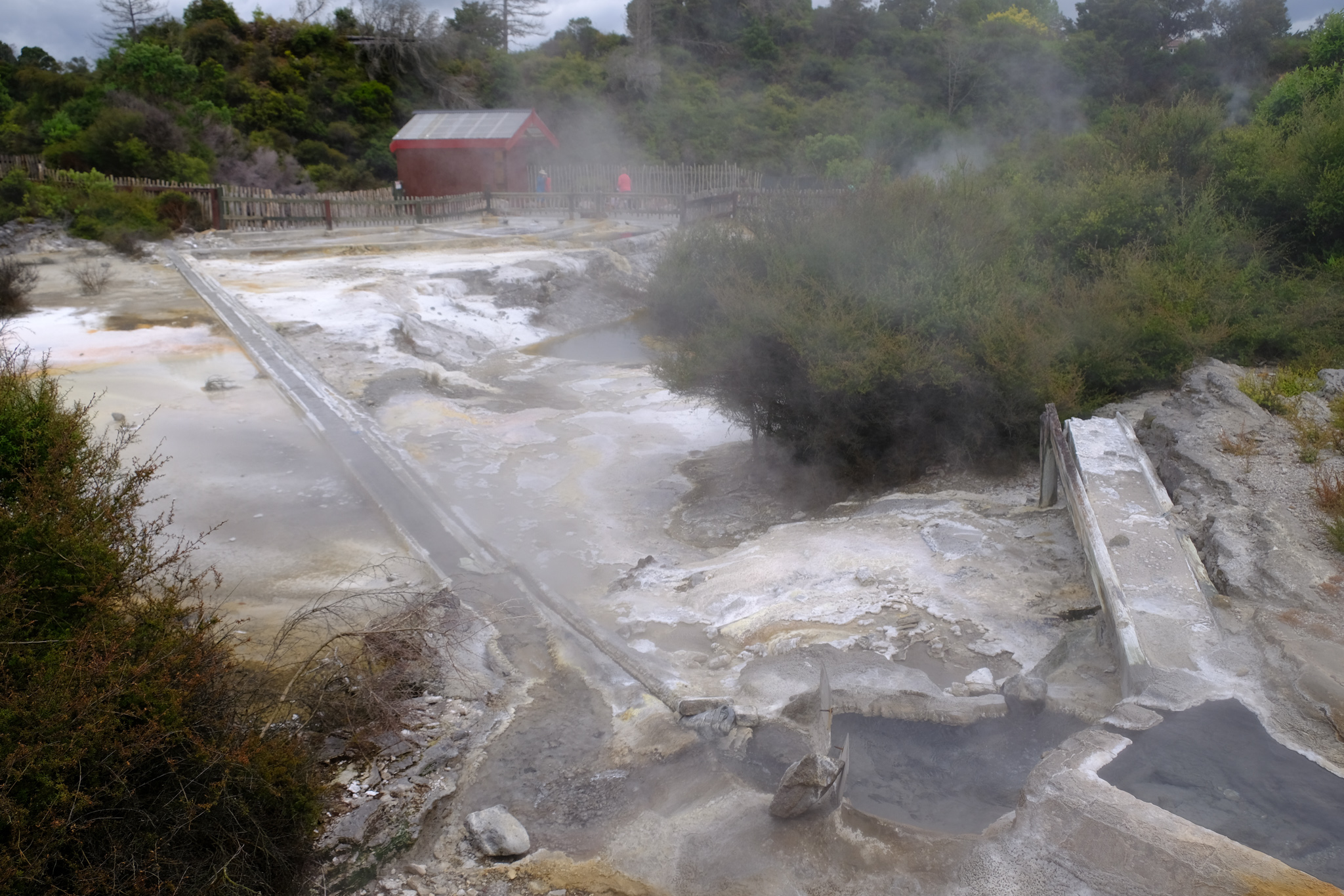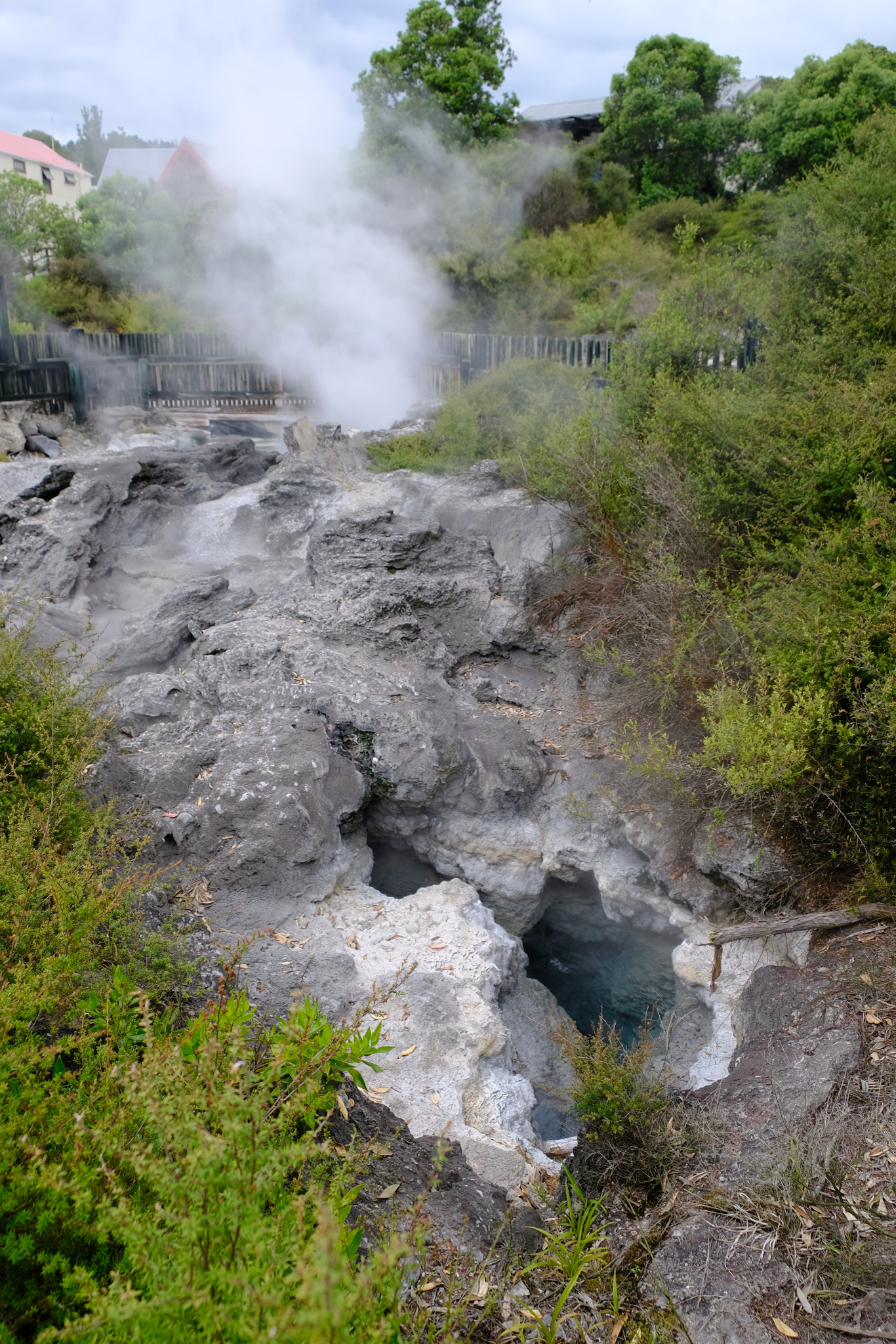 Weitere Oberflächenmerkmale des Whakarewarewa Village sind saure Flüssigkeiten, die in warme, schlammige Becken fliessen, kochendes alkalisches Wasser, Dampf- und Gasflüsse und Bereiche mit dampfendem Boden, die mit eingestürzten Erdwärmelöchern verbunden sind.