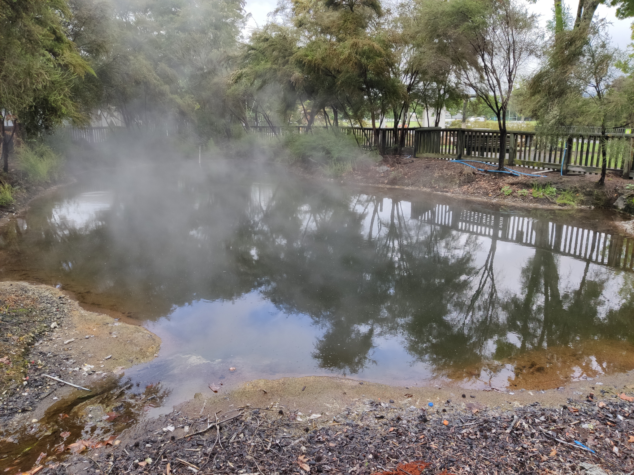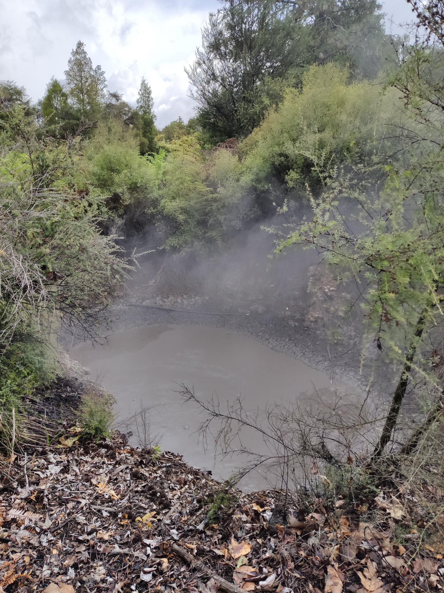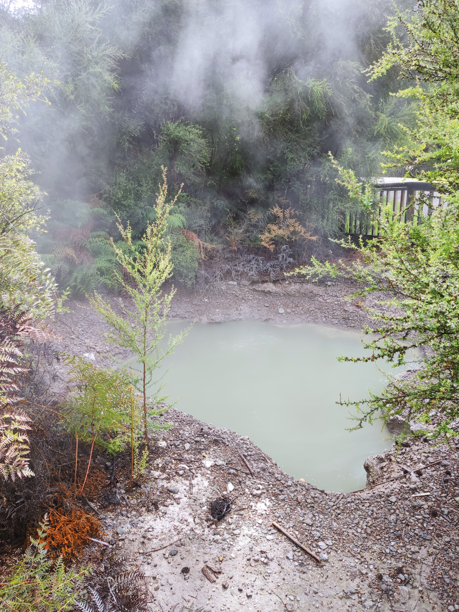 Zuerst habe ich aber noch das thermische Feld mitten in Rotorua besucht. Im Kuirau Park kann man an mehreren Orten Wasser Gasbläschen und blubbernden Schlamm beobachten. Auch hier ist der Schwefelgeruch nicht zu verfehlen.