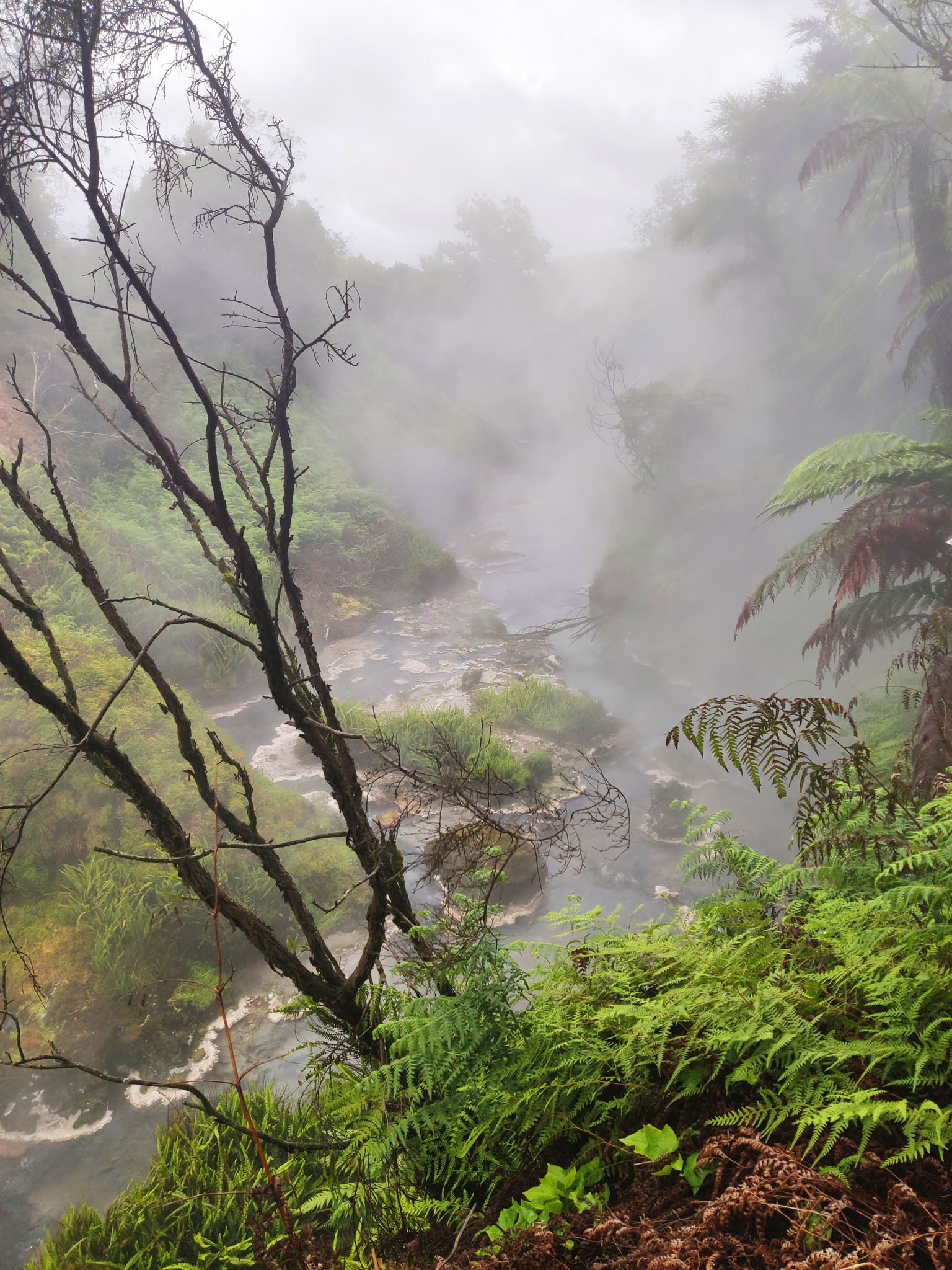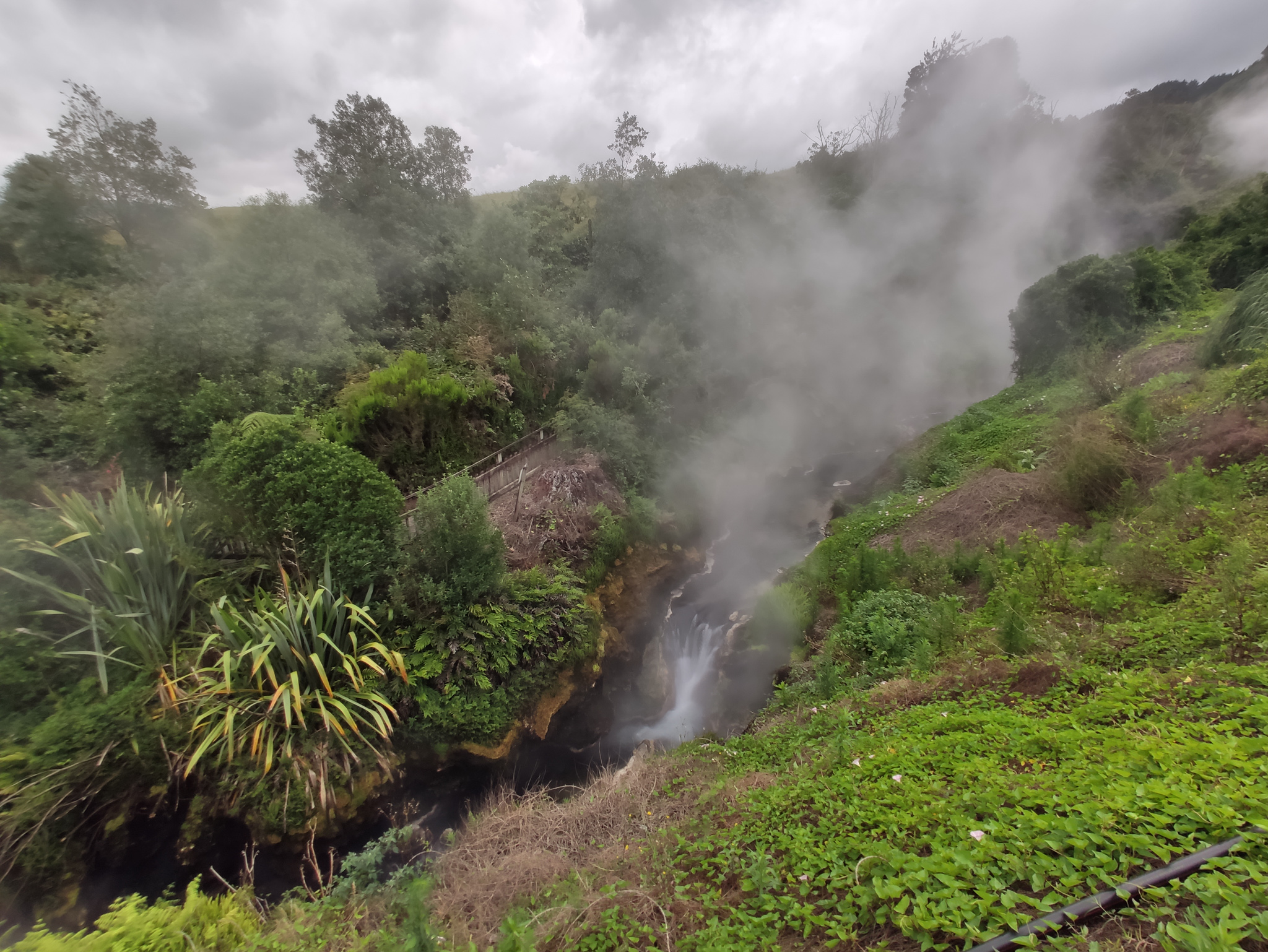 Der kochende Bach Otamakokore schlängelt sich dann etwa drei Kilometer flussabwärts. Die Wassertemperatur beginnt bei 98°C und kühlt sich auf etwa 50 bis 60°C ab, bevor sie sich mit einem viel grösseren Kaltwasserstrom verbindet.