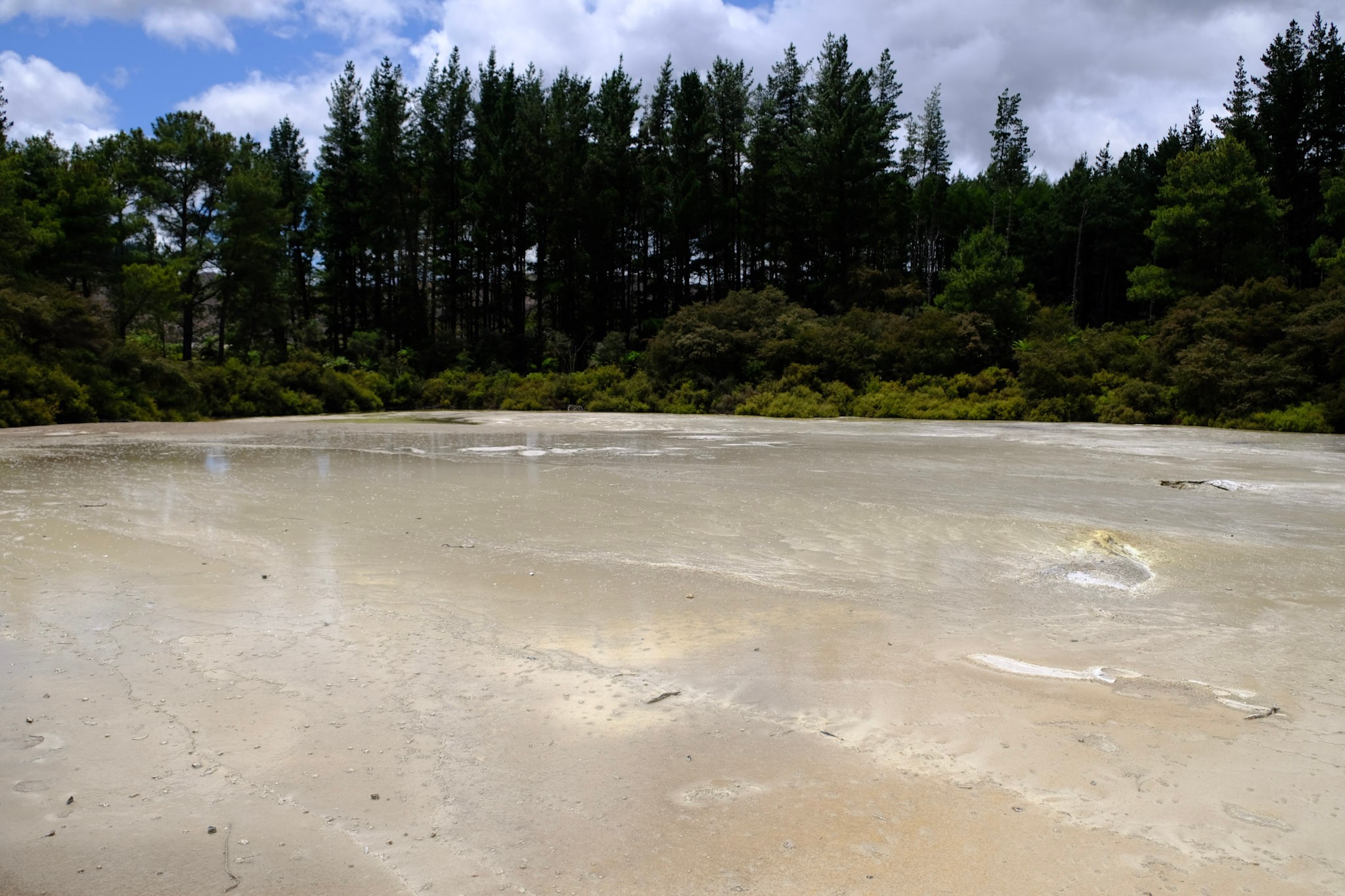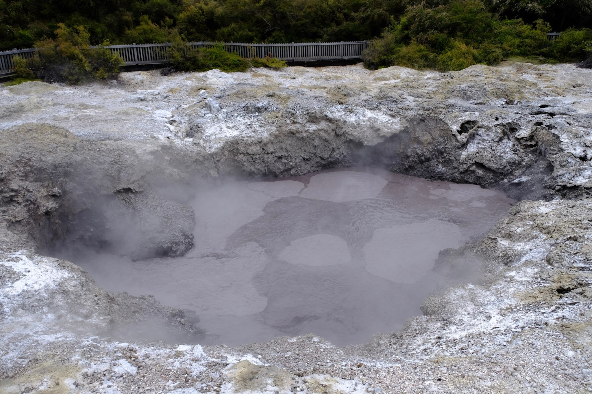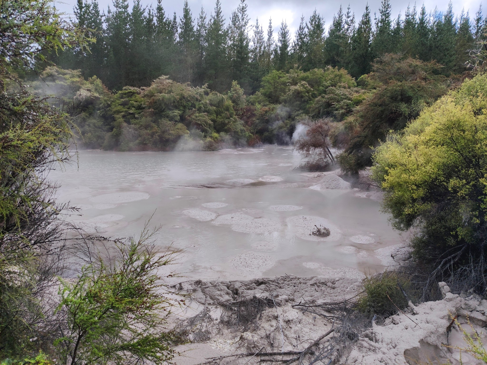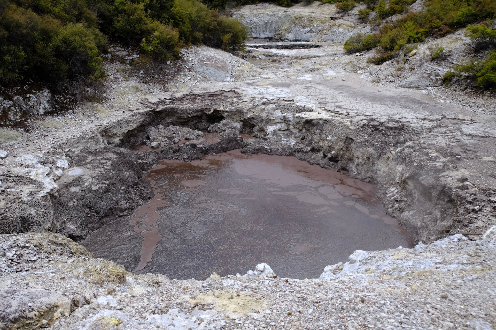 Als erstes mache ich bei den Mud-Pools einen Halt. Die Waiotapu-Schlammbecken erschienen an der Oberfläche, als die Seite eines alten Schlammvulkans wegerodiert war. Sie zeigen einen kontinuierlichen Zustand langsamer, sanfter Eruption eines aktiven Vulkans. Gase und Dampf aus dem Untergrund sprudeln ständig an die Oberfläche und bilden sich verändernde Blasenmuster. Wenn man einen garantierten Blick auf eine geothermische Reaktion ergattern möchte, dann sind die Schlammbecken ein guter Stopp. Diese Eruption findet kontinuierlich statt. Das Blubbern ist echt magisch!
