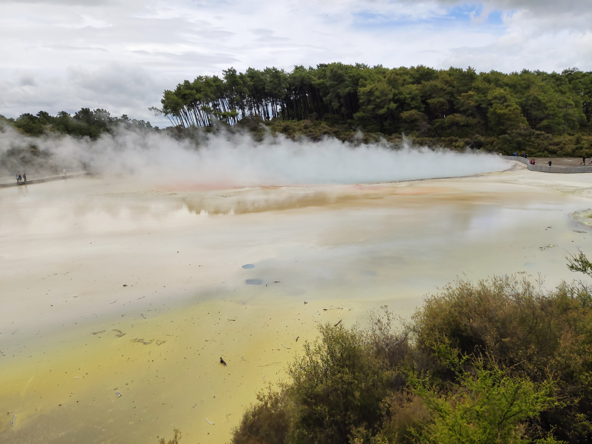Als erstes (und letztes) kann man die Waiotapu Vulkankrater bestaunen. Aufgrund der langen und sehr volatilen Vulkangeschichte der Region – einschliesslich des Mt. Tarawera, der 1886 explosionsartig ausbrach, ein ganzes Dorf begrub und die Landschaft permanent veränderte – gibt es im ganzen Gebiet viele Vulkankrater zu erkunden.