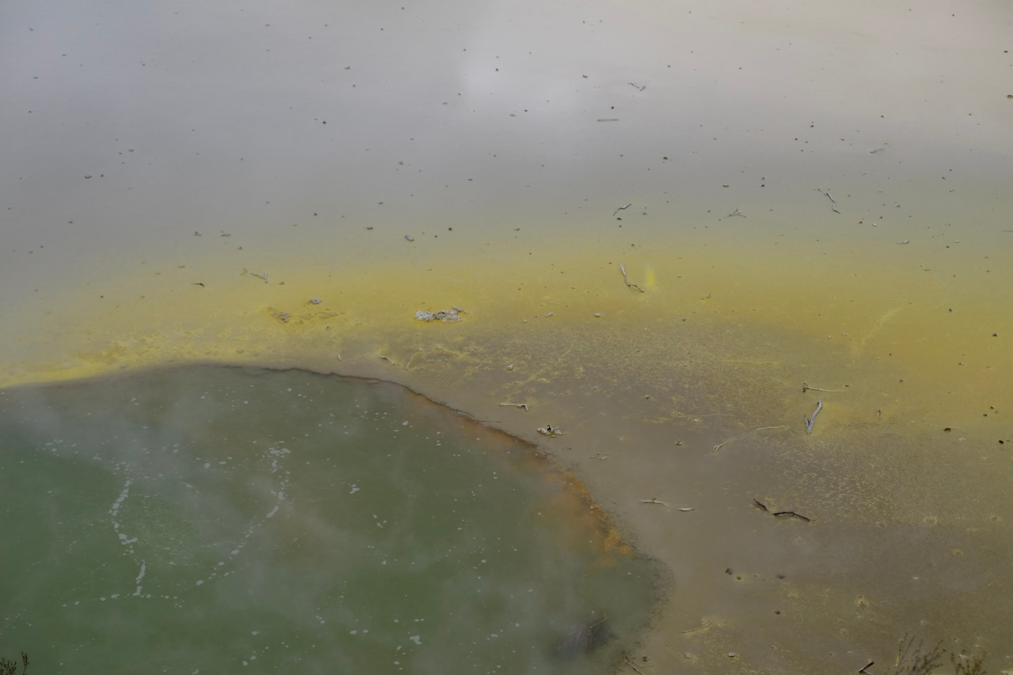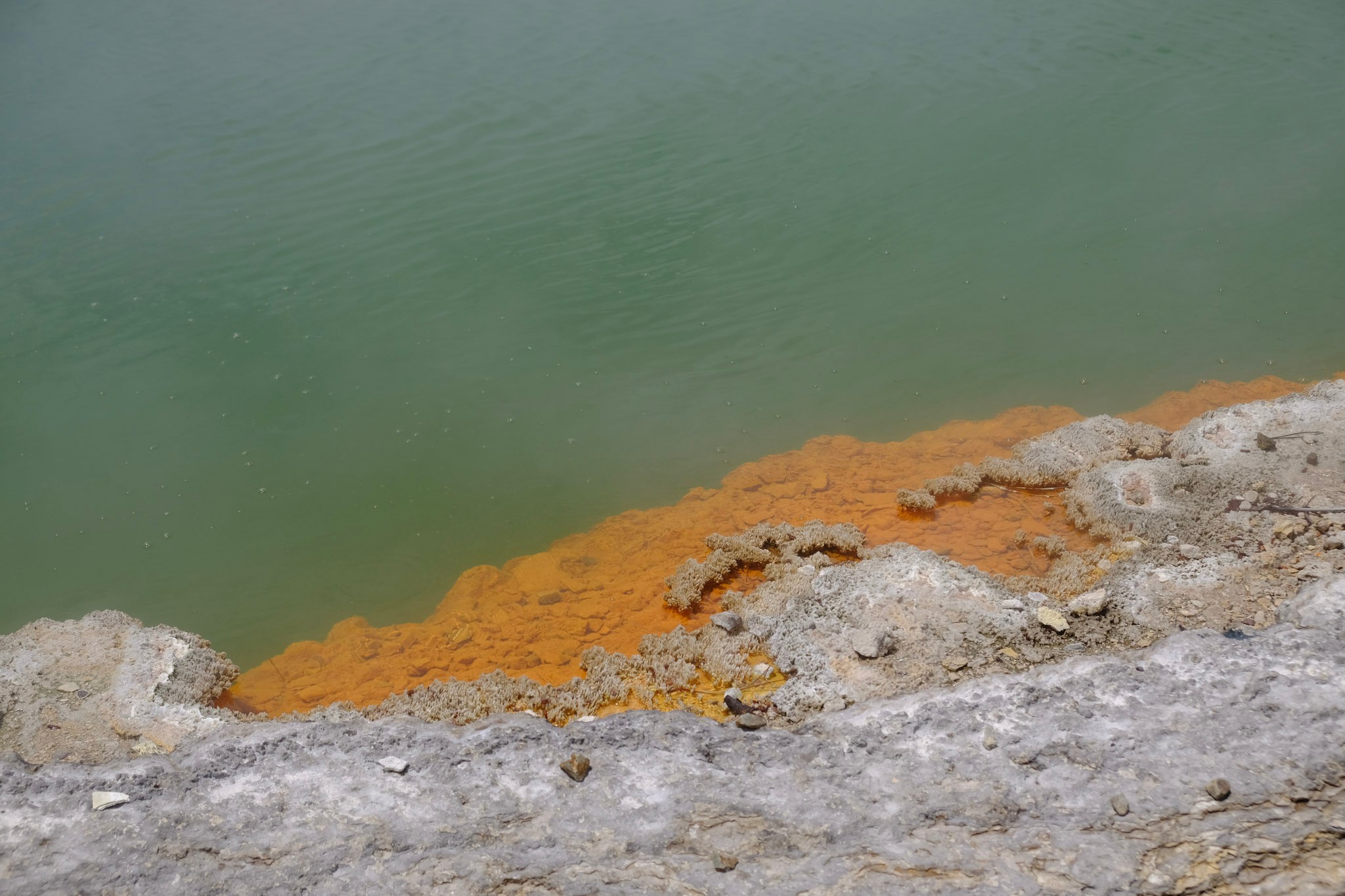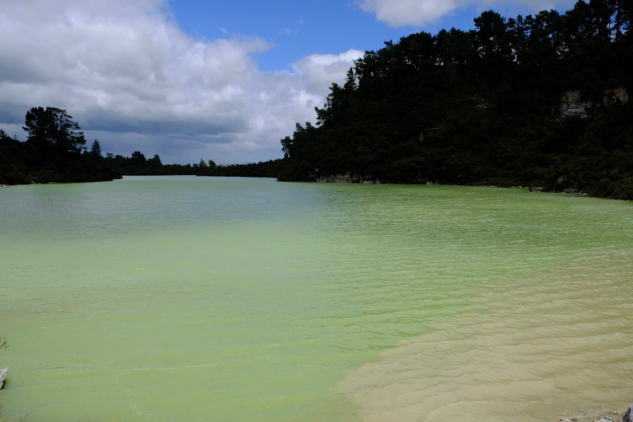 Der Krater Anga Whanariki hat schöne Schwefelkristallformationen an der Kraterwand, doch dann folgt nochmals ein farbliche Highlight zum Schluss des Weges: Roto Karikitea ist mit Wasser aus dem Champagner-Pool gefüllt und die übernatürliche wirkende Farbe stammt von Lichtbrechungen aufgelöster Mineralien im Wasser. Der Ph-Wert des Wasser ist 2, also extrem sauer. Die Wassertemperatur liegt bei rund 14°C.