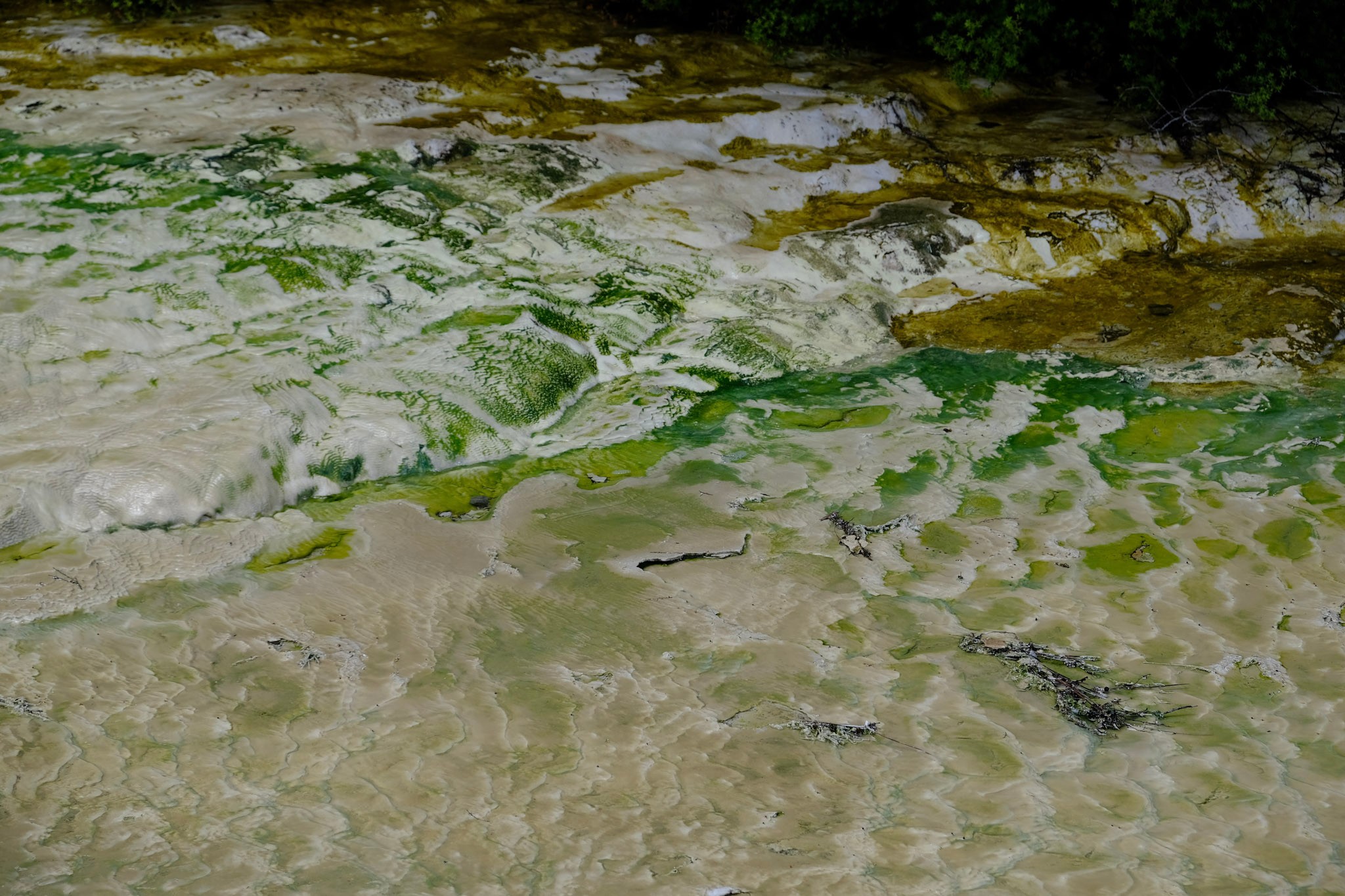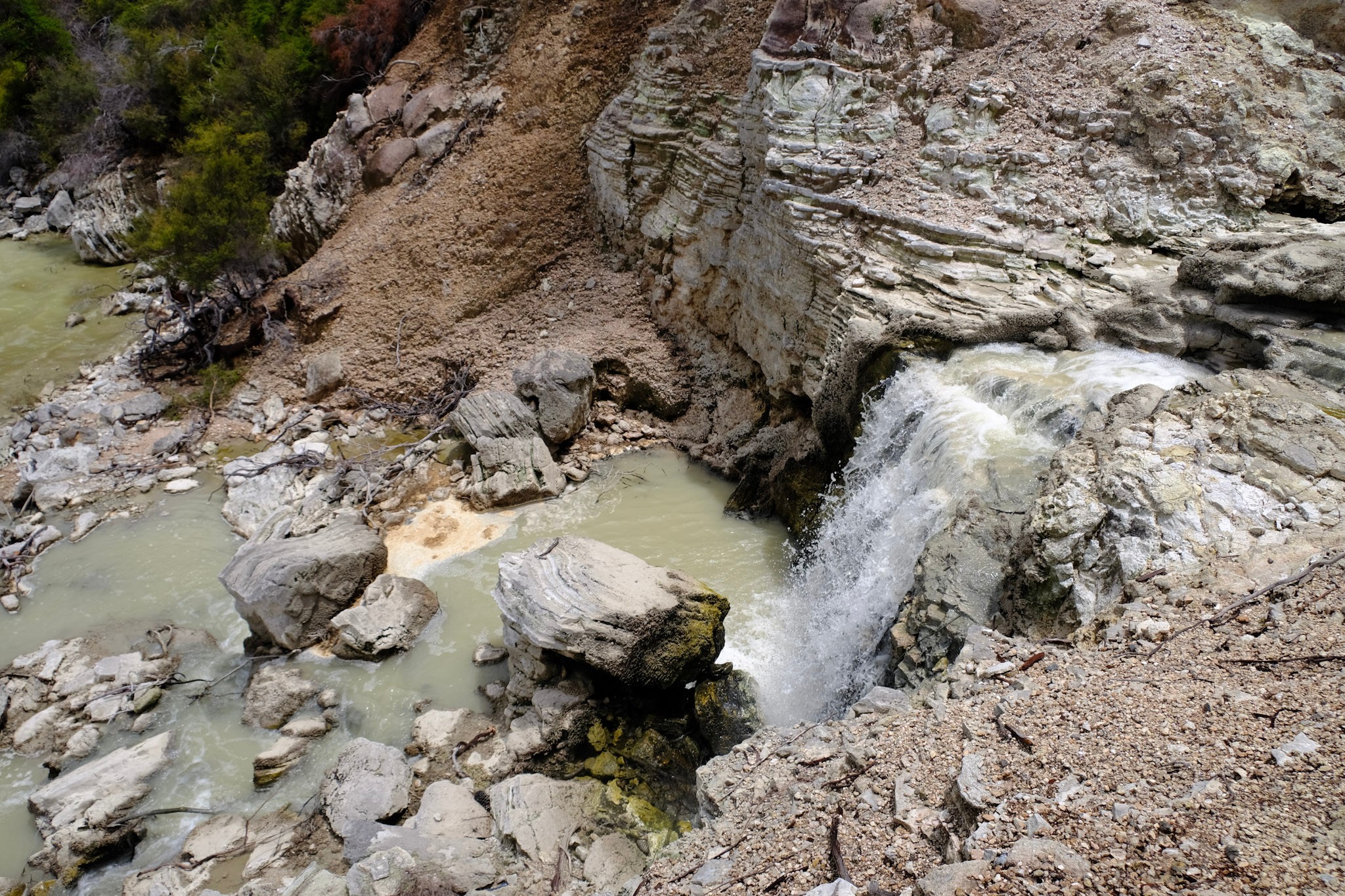 Ein weiterer Wasserfall Te Rer Arai Marena fliesst am Ende der Sinterterassen, auch dieser ist durch Algen und archaische Bakterien grün gefärbt.