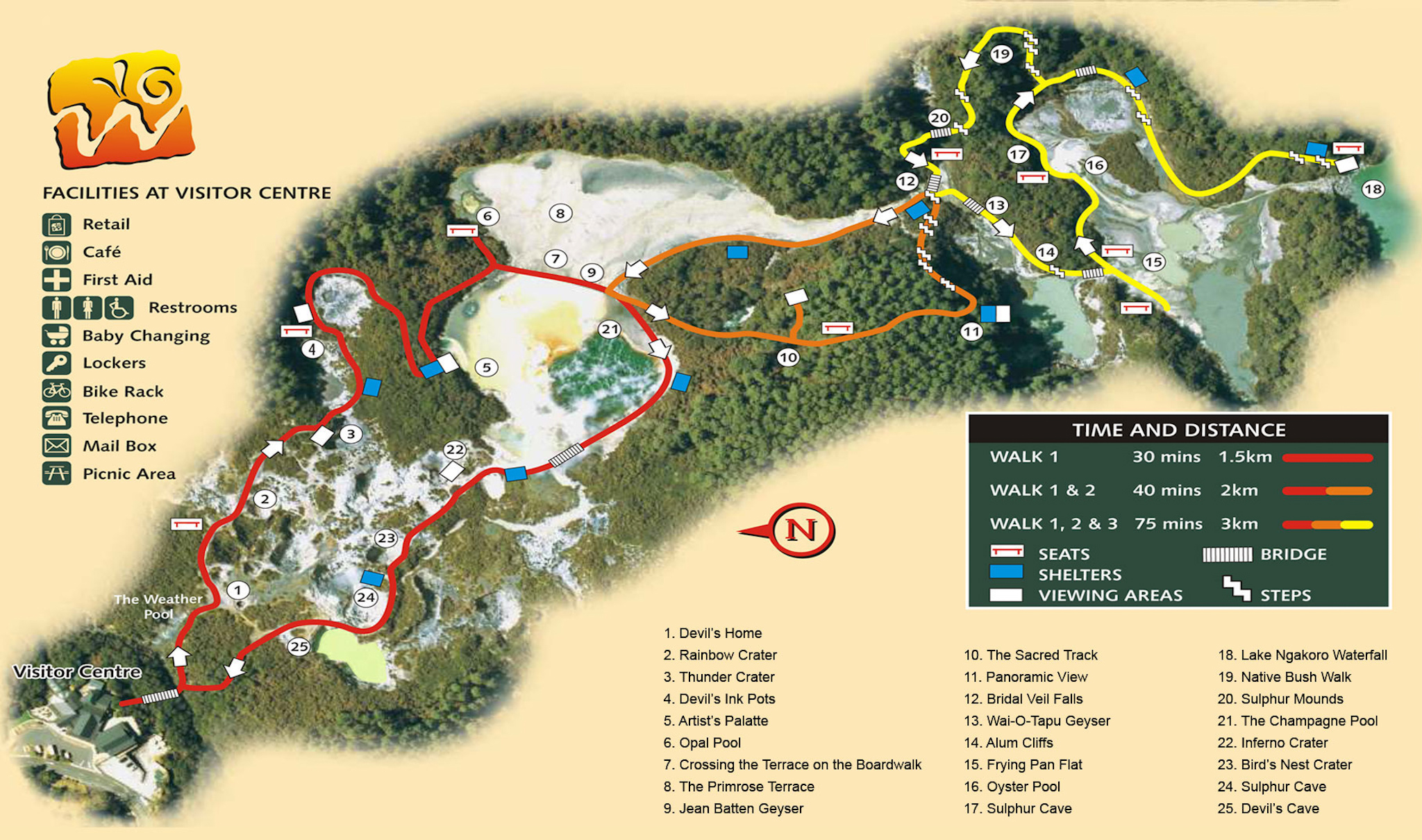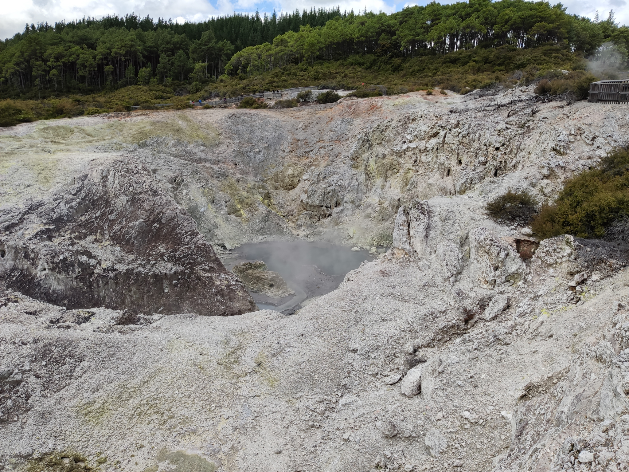 Entlang des Boardwalks kann man in zwölf kleinere Krater hinuntersehen und das Blubbern hören, den stinkenden Dampf einatmen und die Farben an den Wänden bestaunen. Die Krater haben einen Durchmesser von 5 bis 15 Metern und sind bis zu 20 Meter tief. Der neueste Krater ist Te Rua Whaitiri: Er wurde 1967 gebildet. Das Wasser in den Kratern ist bis zu 80°C heiss.