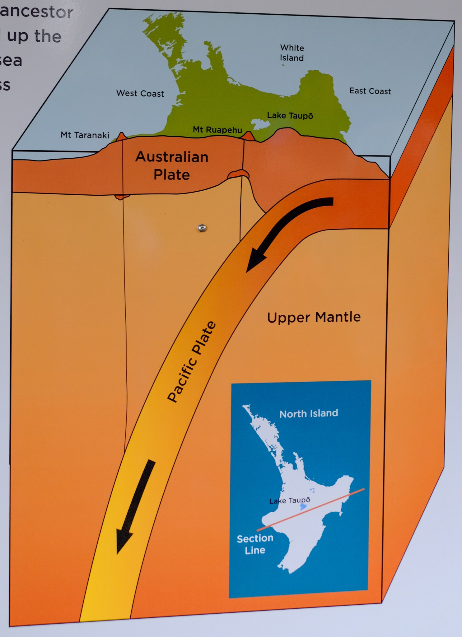 Als Teil des sogenannten pazifischen Ring of Fire schiebt sich vor der Nordinsel Neuseelands die Pazifische Platte von Osten her unter die Australische Platte und gleitet auf der Südinsel in der Alpine Fault in südliche Richtung an ihrem Rand vorbei. Auf der Nordinsel macht sich das durch die vulkanischen Aktivitäten von White Island, Mount Tongariro, Mount Ngauruhoe und Mount Ruapehu, den blubbernden Tümpeln von Rotorua und den Erhebungen der Ruahine Range, Tararua Range und der Rimutaka Range bemerkbar. Auf der Südinsel wird das durch die weiterhin andauernden Auffaltungen der bis zu 3’724 Meter aufsteigenden Neuseeländischen Alpen und dem höchsten Berg Neuseelands, dem Aoraki/Mount Cook sichtbar.