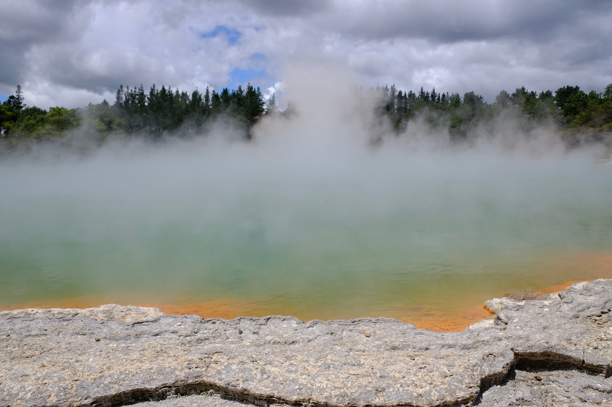 Das Highlight im Zentrum ist der Champagner-Pool. Der Name „Champagner-Pool“, welcher vor 700 Jahren durch einen geothermischen Ausbruch entstanden ist, ist auf das CO² zurückzuführen, das dazu führt, dass dieses erwärmte Gewässer ständig sprudelt. Es ist die grösste heisse Quelle Neuseelands: 65m Durchmesser und 62m Tiefe! Die Wassertemperatur im Pool beträgt ca. 74°C und die Bedingungen sind stark sauer – dies ist kein Wellnessbereich. Es ist jedoch fantastisch bunt aufgrund der verschiedenen Mineralien in seinem Wasser: Gold, Silber, Quecksilber, Schwefel, Arsen, Thallium und Antimon sind darin zu finden.