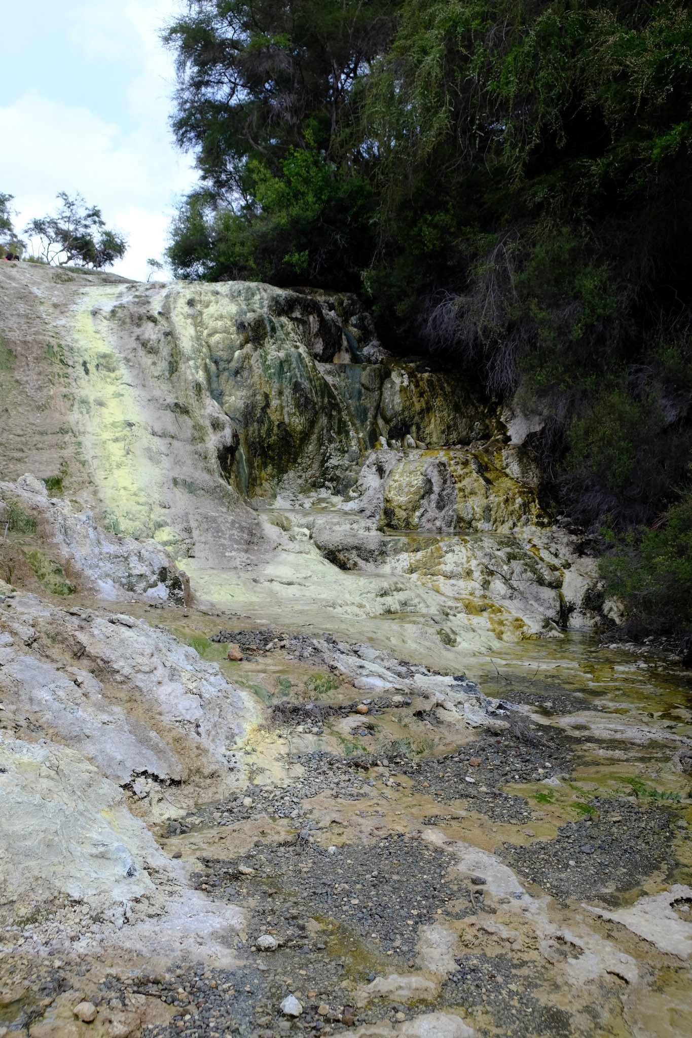 Ein weiterer Wasserfall Te Rer Arai Marena fliesst am Ende der Sinterterassen, auch dieser ist durch Algen und archaische Bakterien grün gefärbt.