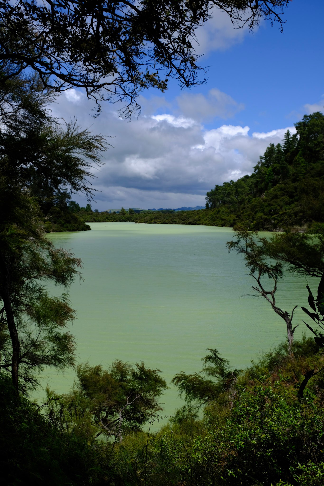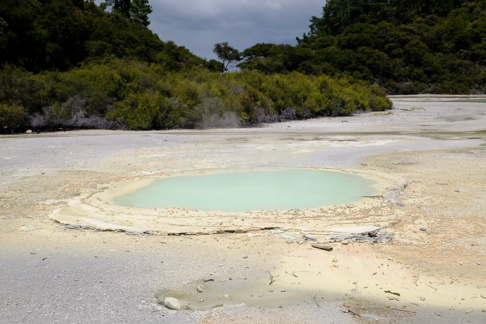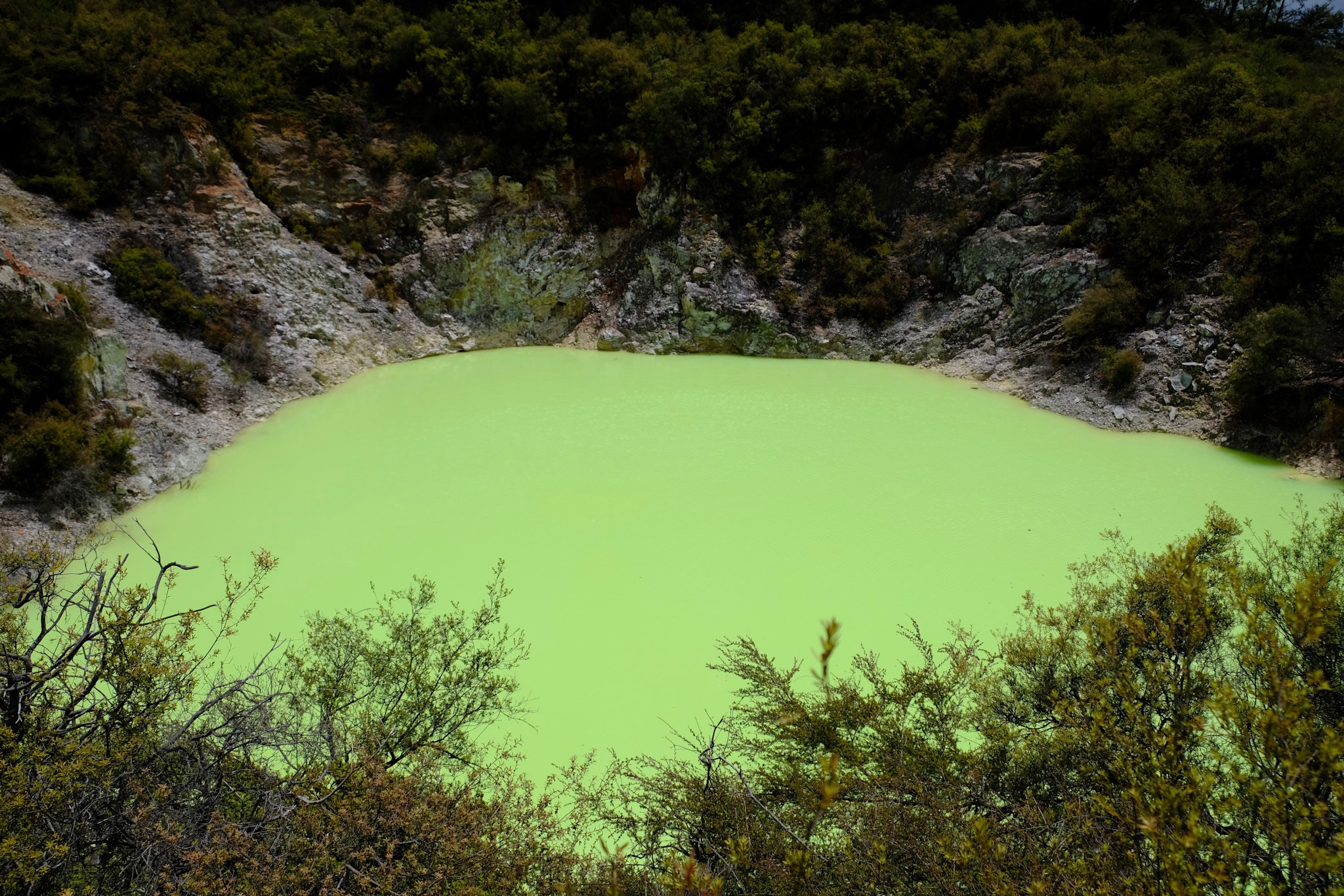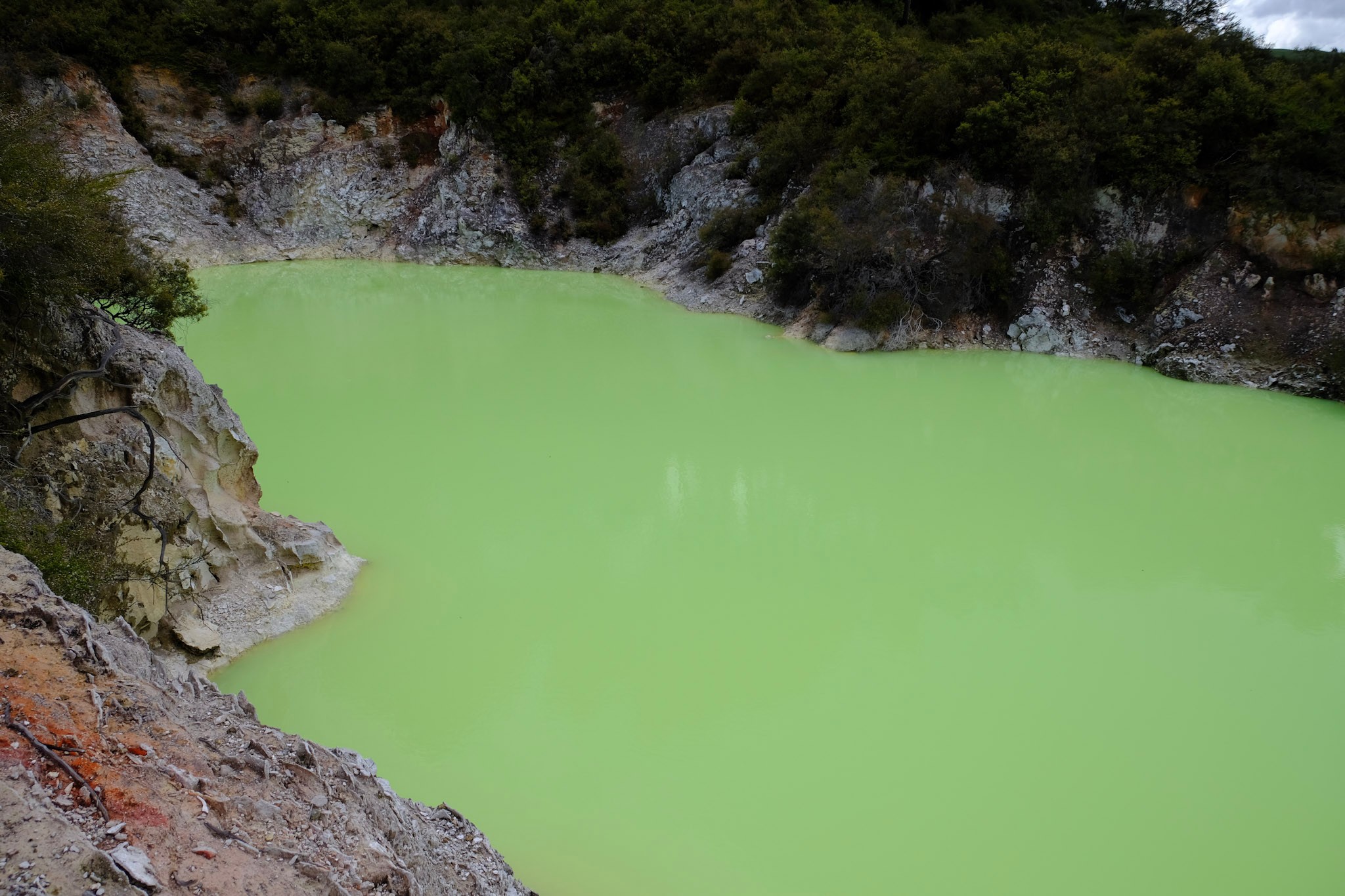 Der Krater Anga Whanariki hat schöne Schwefelkristallformationen an der Kraterwand, doch dann folgt nochmals ein farbliche Highlight zum Schluss des Weges: Roto Karikitea ist mit Wasser aus dem Champagner-Pool gefüllt und die übernatürliche wirkende Farbe stammt von Lichtbrechungen aufgelöster Mineralien im Wasser. Der Ph-Wert des Wasser ist 2, also extrem sauer. Die Wassertemperatur liegt bei rund 14°C.