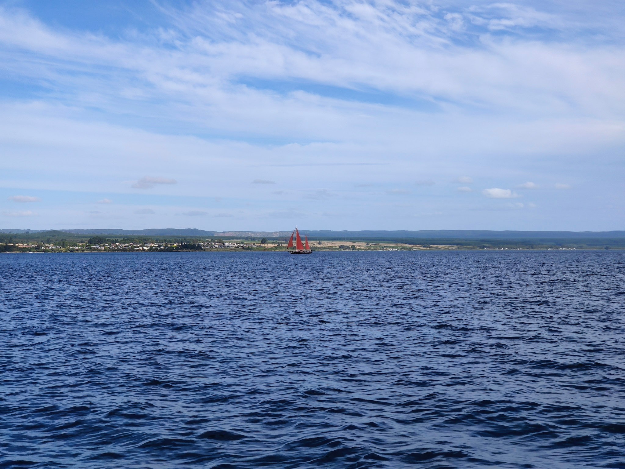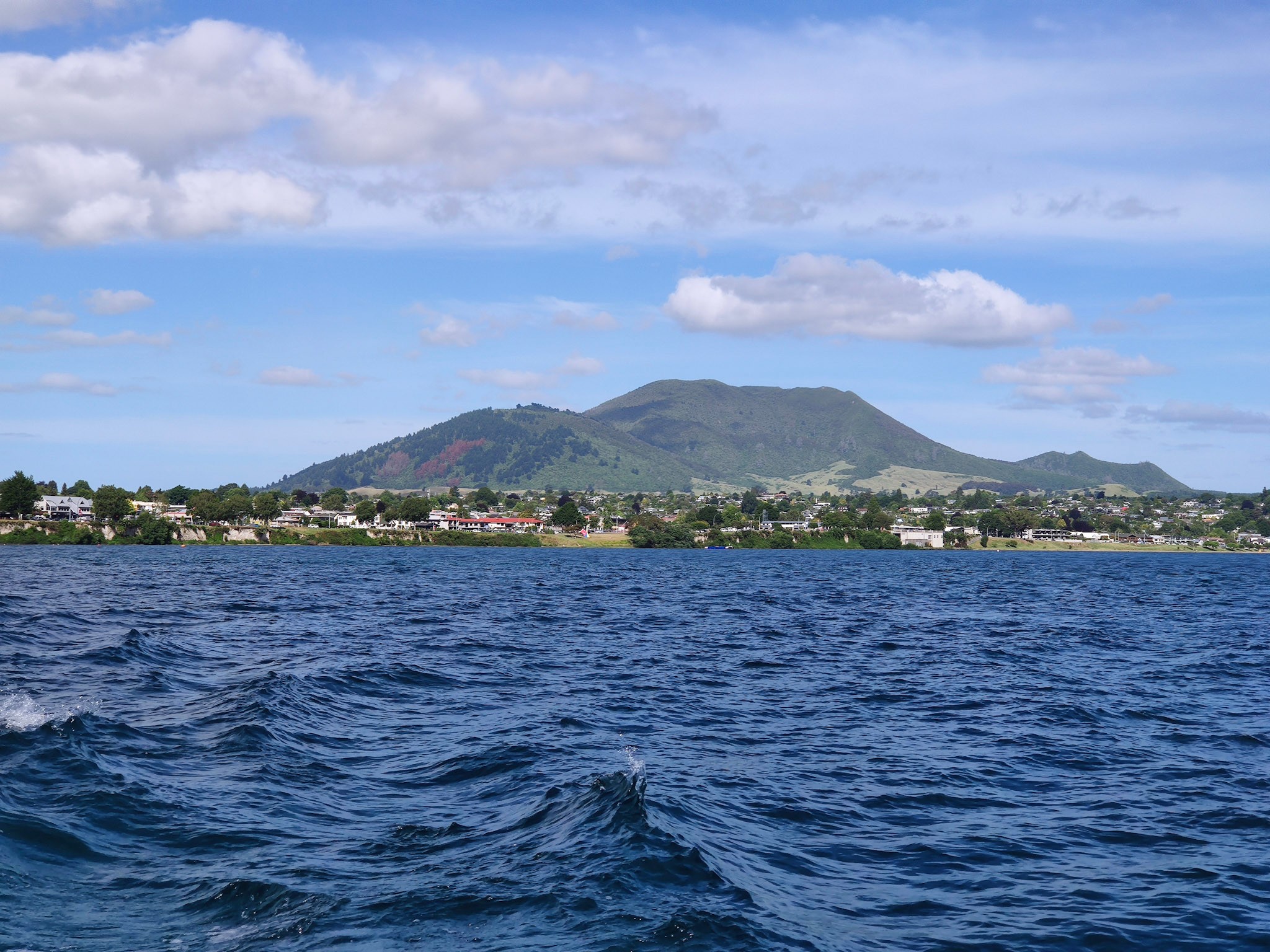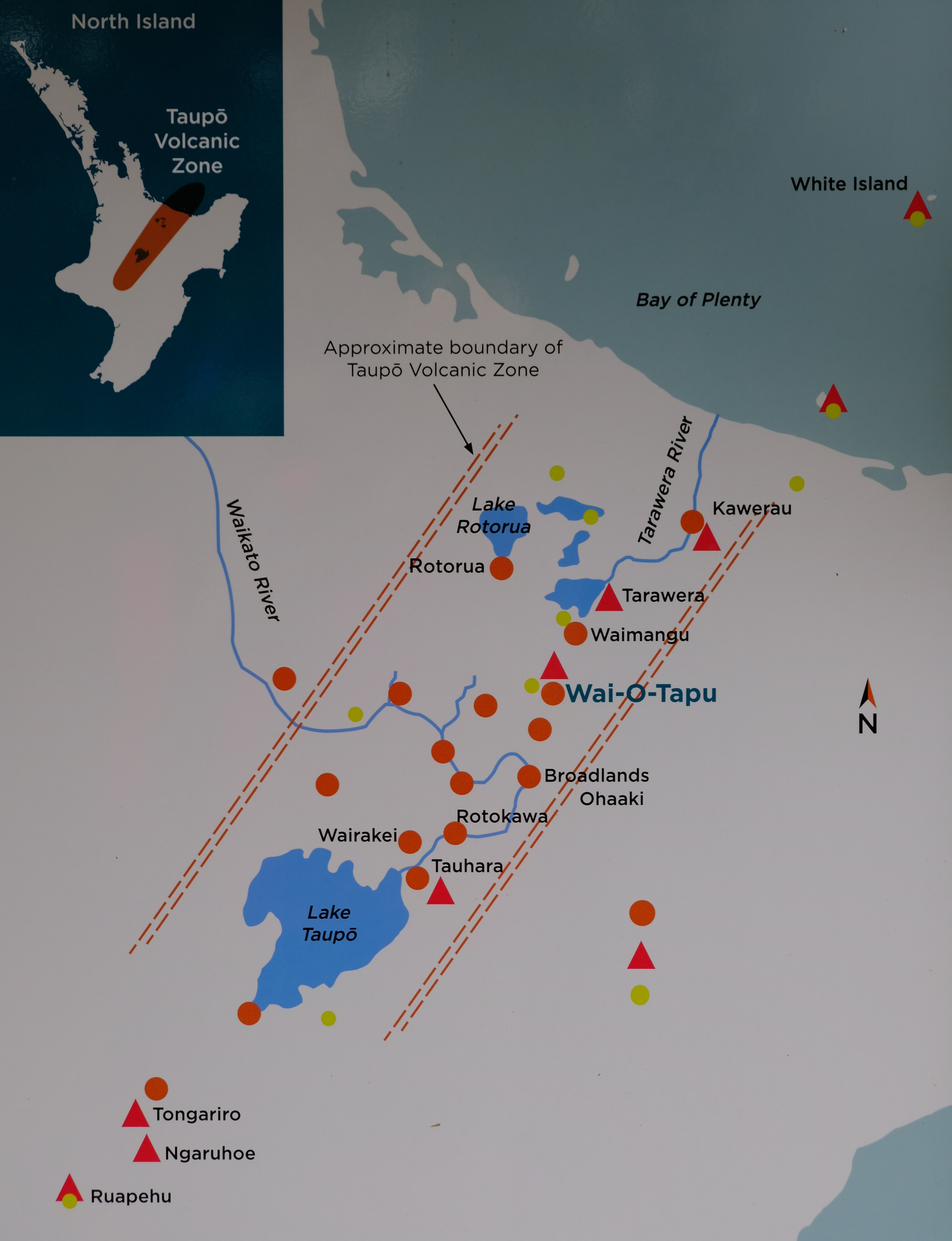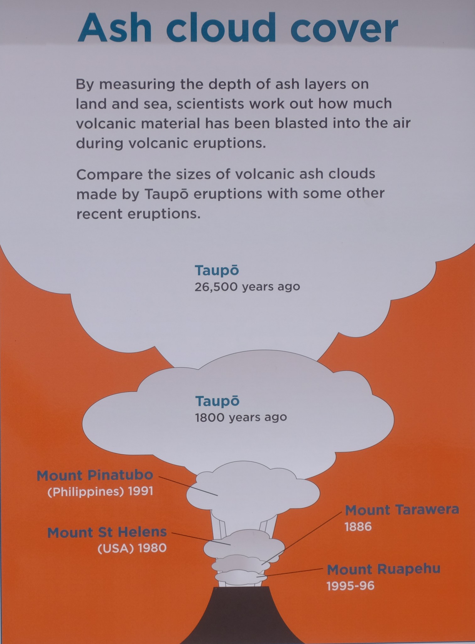Und nun war das Wetter wirklich toll. Der tiefe und grosse Taupō Kratersee hat beim ständig blasenden Wind sogar richtige Wellen und ein paar Schaumkronen. Die grüne Küste und die vielen Vulkanhügel, sowie die wunderbaren Villen entlang des Ufers machen den See extrem idyllisch. Diese Idylle trübt nur der Umstand, dass der Vulkan riesig und früher durchschnittlich etwa alle tausend Jahre ausgebrochen ist. Das letzte Mal vor 1’800 Jahren… Die Macht des Vulkans zeigt gut die Grafik mit den verschiedenen Grössen der Aschewolken aus, welche man aus Ablagerungen rekonstruiert hat.