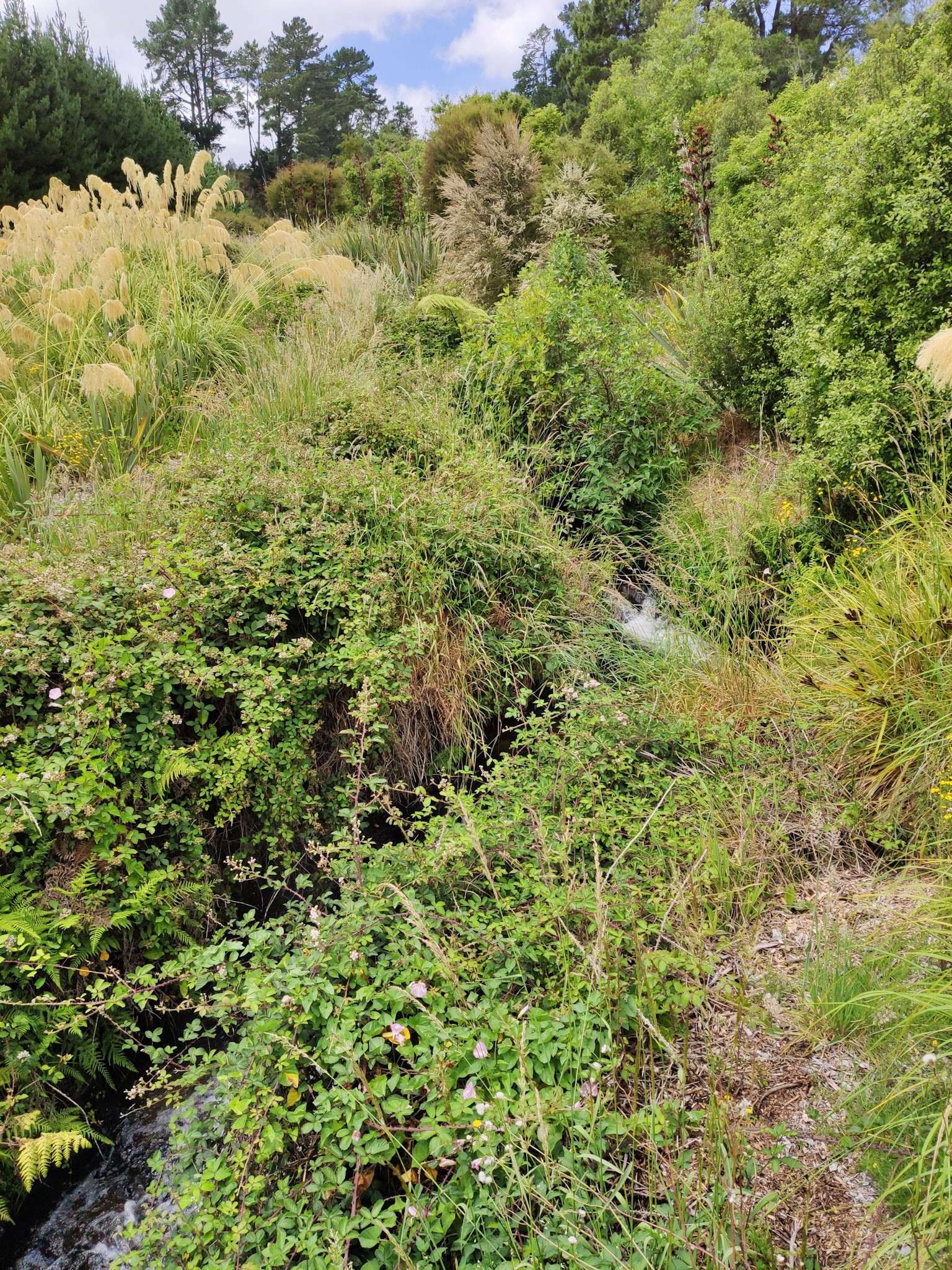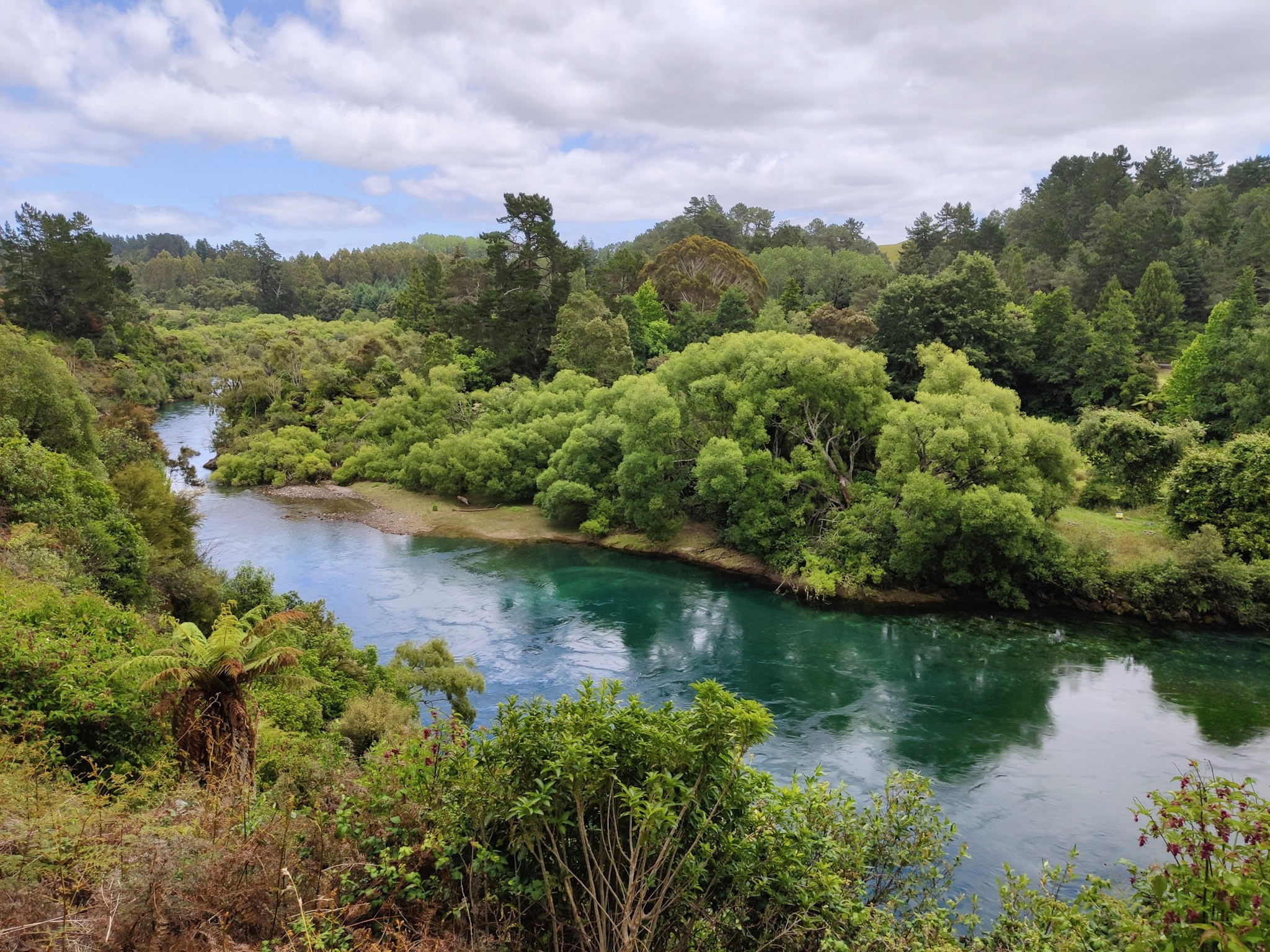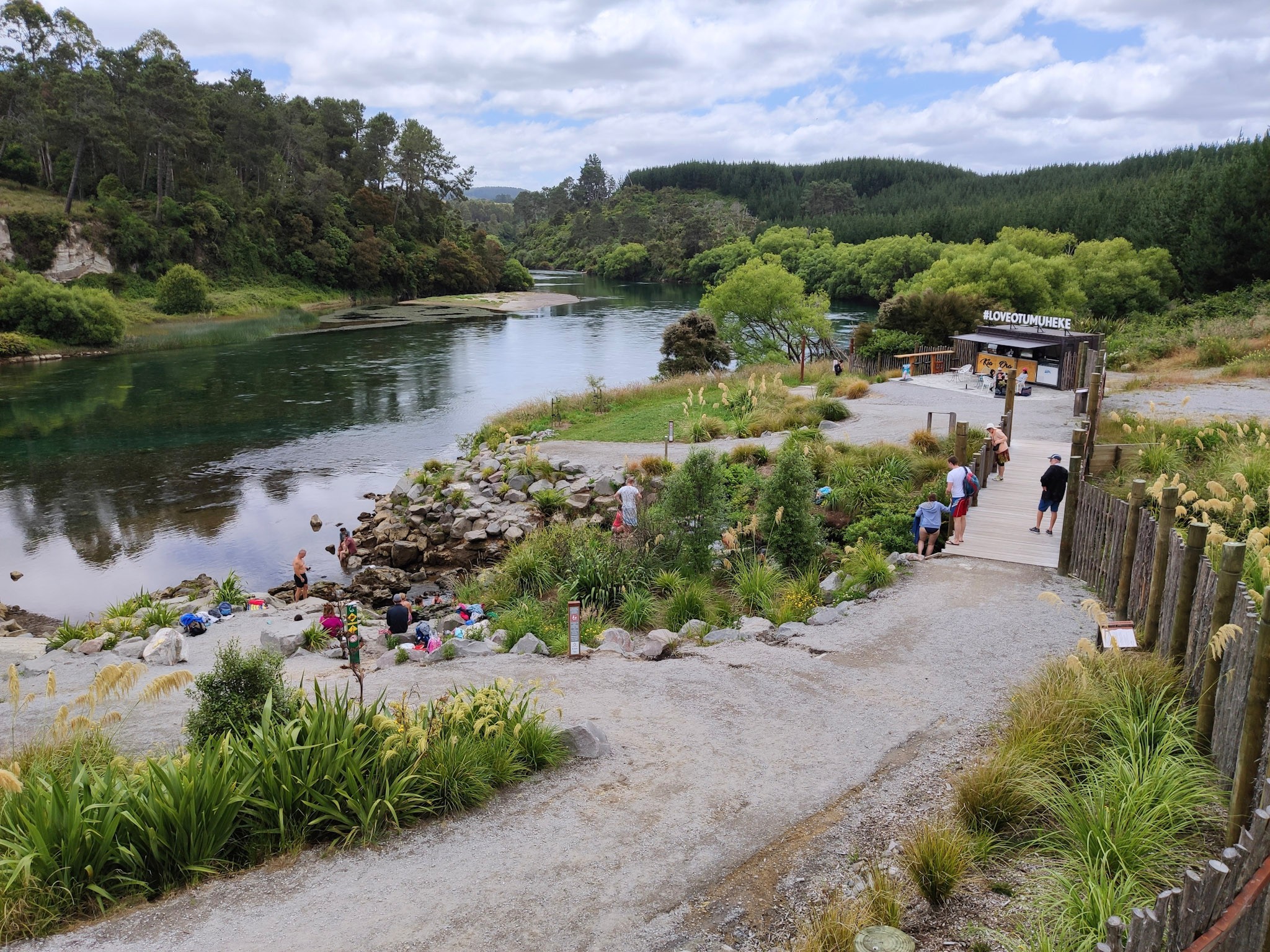 Heute Morgen habe ich einen kleinen Rucksack gepackt und habe vom Caravan Park aus eine 16km lange Wanderung entlang des Waikato River unternommen. Dabei kommt man zuerst am öffentlichen Thermalbad vorbei, welches aus kleinen Pools eines thermisch aufgewärmten Baches besteht, welche dann im grossen Fluss mündet. Das ist die ziemliche Attraktion für die Jugend des Ortes und auch für einige Touristen. Man hat moderne WC- und Umkleidekabinen gebaut und es steht auch ein kleines Café dort.