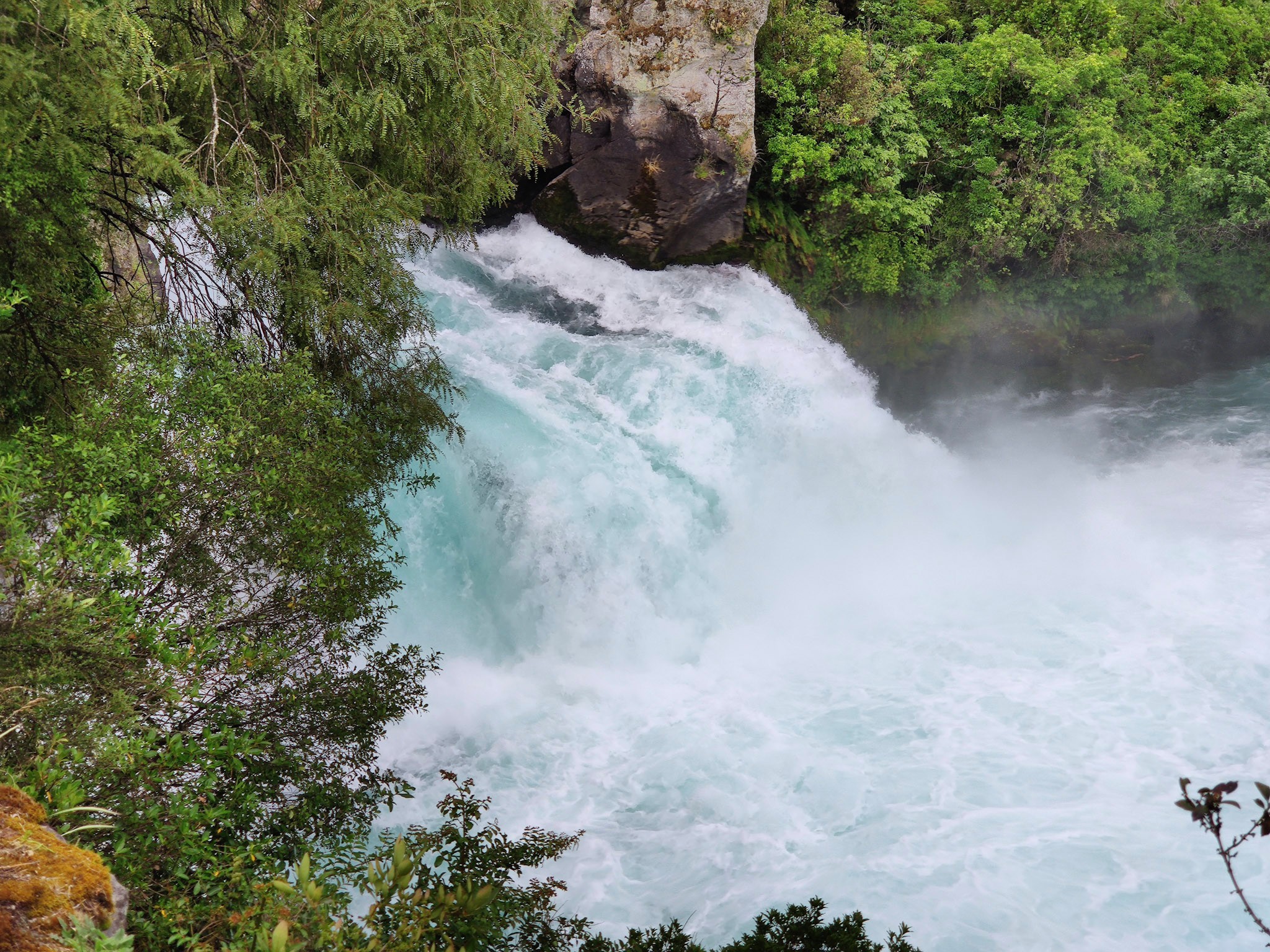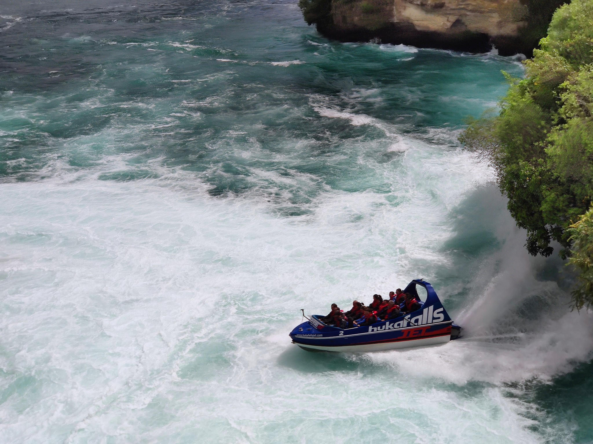 Rund 200’000 Liter Wasser stürzen pro Sekunde neun Meter über die mächtige Felswand der Huka-Fälle. Das würde pro Minute fünf olympische Schwimmbecken füllen. Solch ein gewaltiger Wasserfluss erzeugt eine sehr gefährliche Gegenströumg am Grund der Wasserfälle: Eine gefürchtete Wasserwalze. Diese hat sogar die tollkühnsten Flussfahrer davon abgehalten, die Wasserfälle zu befahren. Nur nach den Wasserfällen düst ein grosses Jetboot mit Besuchern durch das brodelnde Wasser. Vor den Wasserfällen ist der Waikato klar und und spiegelt das Ufer. Nachdem er über die Wasserfälle gestürzt ist, nimmt er eine Menge Luftblasen auf, welche atemberaubende Farben erzeugen und den Wasserfällen seinen Namen gemäss des Maori-Worts für „Schaum“ gegeben hat. Die Strömung über die Wasserfälle ist so stark, dass die Wanderung von Forellen und einheimischen Fischen wie Aalen verhindert wird. Deshalb leben im Tauposee keine Aale.