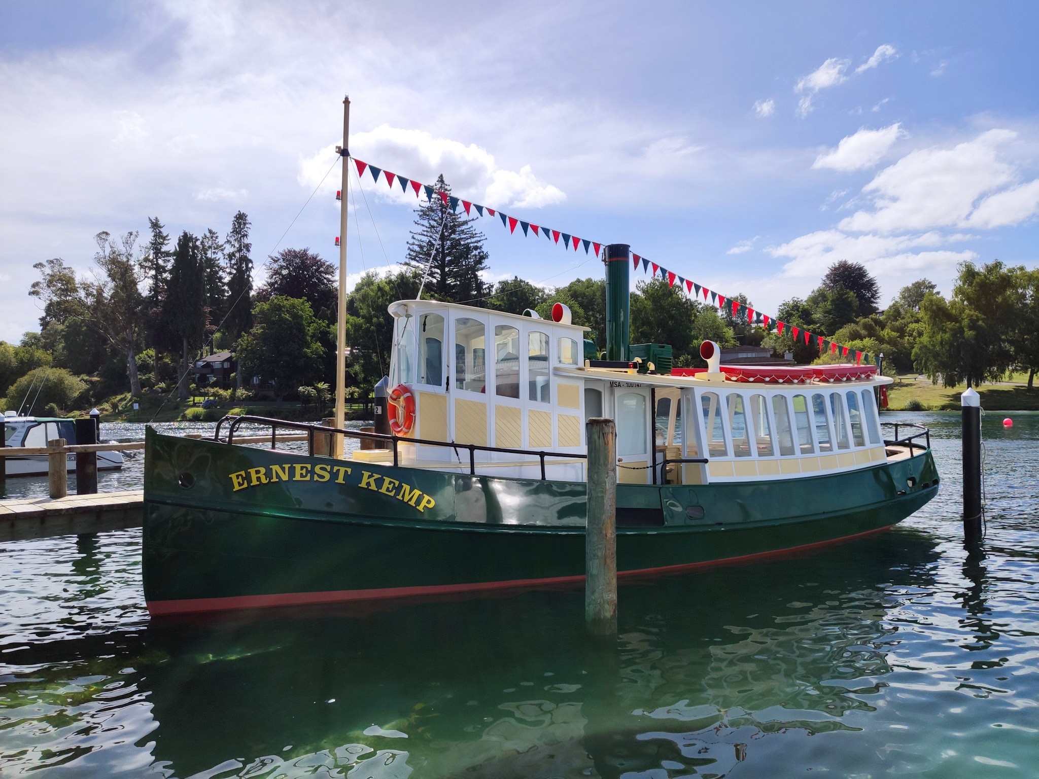 Dann musste ich noch kurz den Campervan reisebereit machen, denn da Wetterprognose für heute Abend das schönste Wetter voraussagt, hatte ich ab 17 Uhr eine zweistündige Cruise auf dem Replika-Dampfschiff Ernest Kemp gebucht. Die rund 4km zum Bootshafen wollte ich mit dem Camper fahren. Für nur NZD 47 kriegt man auf dem Schiff in den lauschigen Abendstunden zusätzlich zur Aussicht noch Wein oder Bier (2x) sowie mehr als genug Pizza und am Schluss noch Kaffee oder Tee serviert.