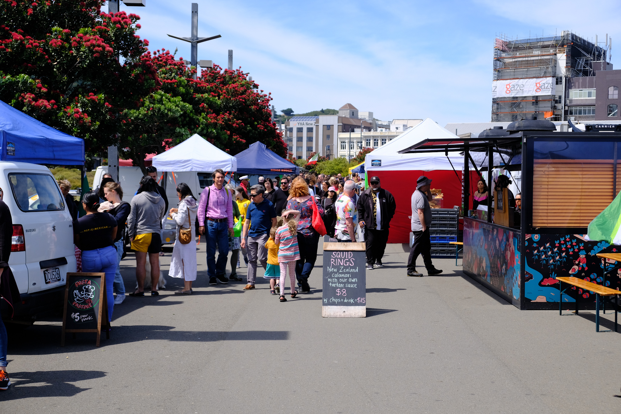 Ich nehme den Cable Train mitten in das CBD und erkunde die Stadt (Hin- und Rückfahrt nzd 9). An der schön ausgebauten Wharf empfängt mich nicht nur der kalte Wind, sondern auch der sonntägliche Farmers Market und viele Street Food Wagen aus alle Weltregionen. Ich entscheide mich für griechischen Fast Food und schaue, dass mir das Essen nicht aus der Hand gewindet wird.