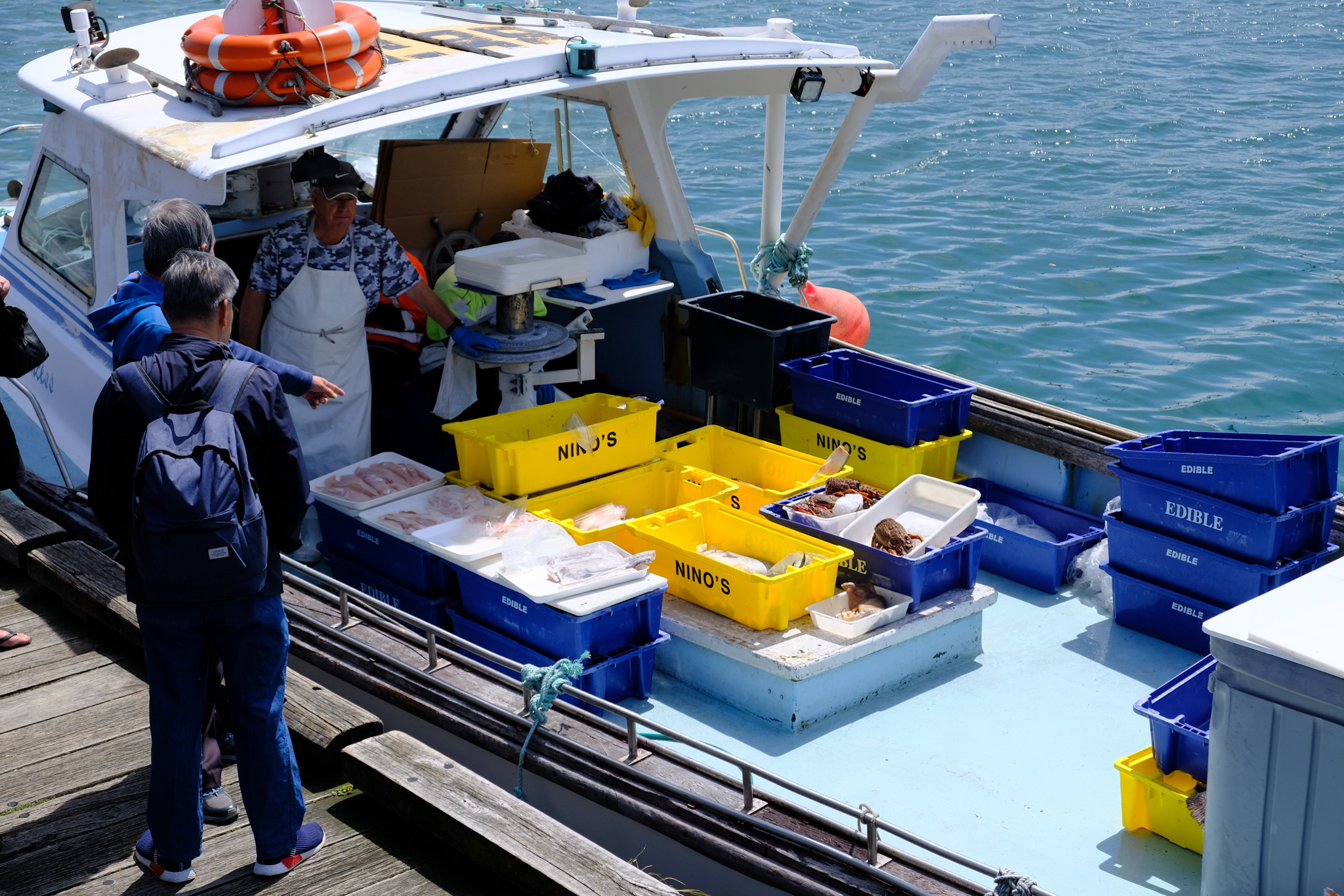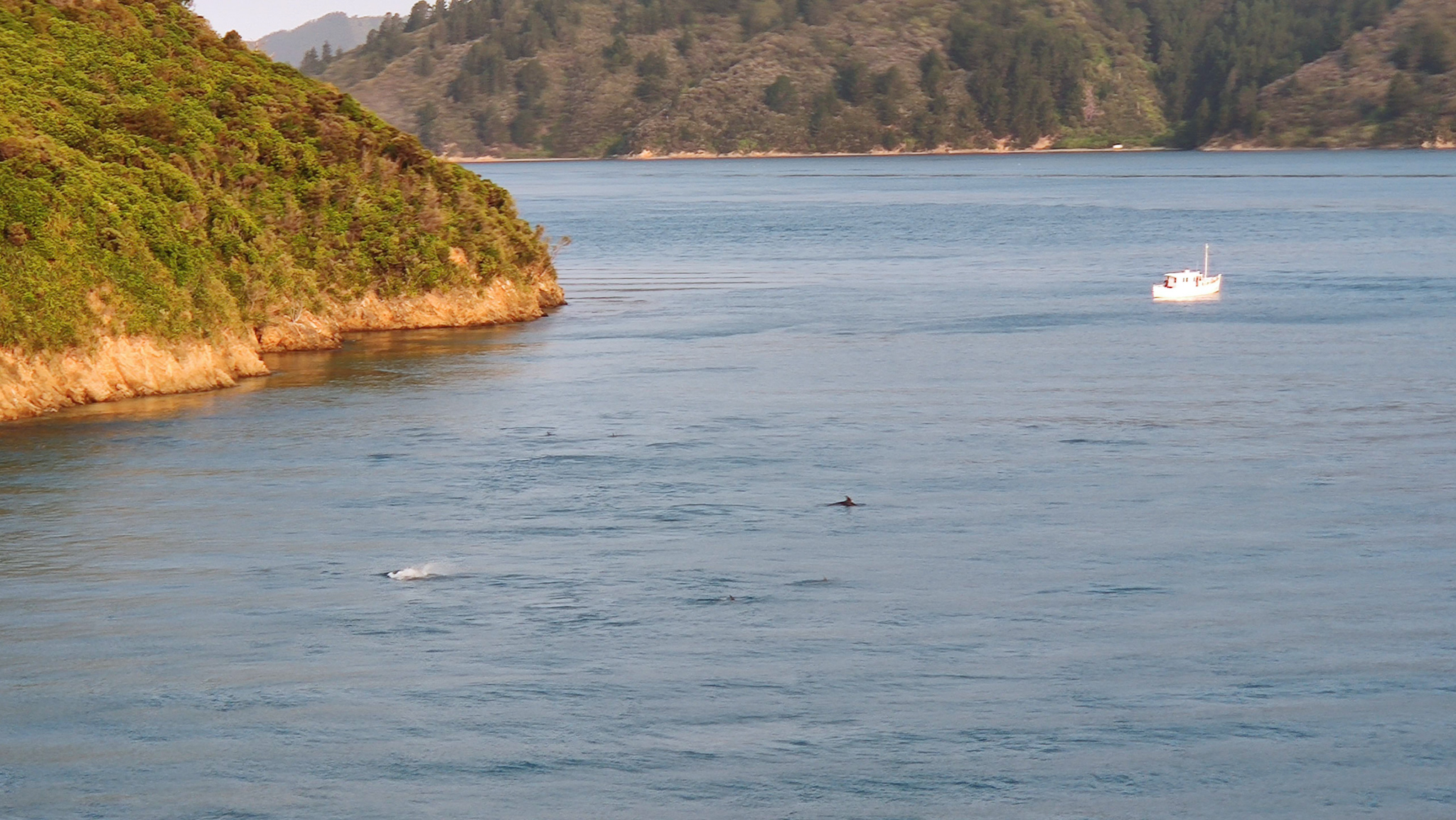 Der Wind wird von den Hügeln abgehalten, als kann ich auf dem Observation Deck, pendelnd zwischen beiden Seiten, die faszinierende Landschaft in mich aufsaugen. Wir fahren langsam und fast lautlos durch diese enge Wasserstrasse. Bei einem Fischerboot entdecken wir sogar nochmals eine grosse Gruppe Delfine im Wasser (siehe Bild).