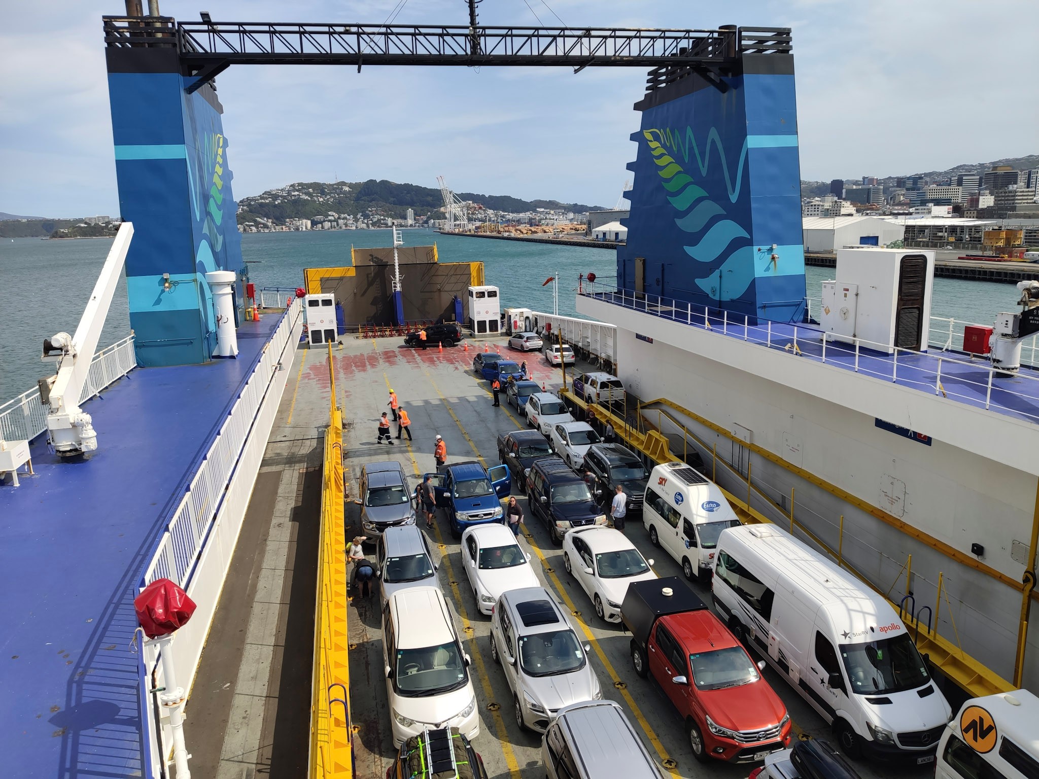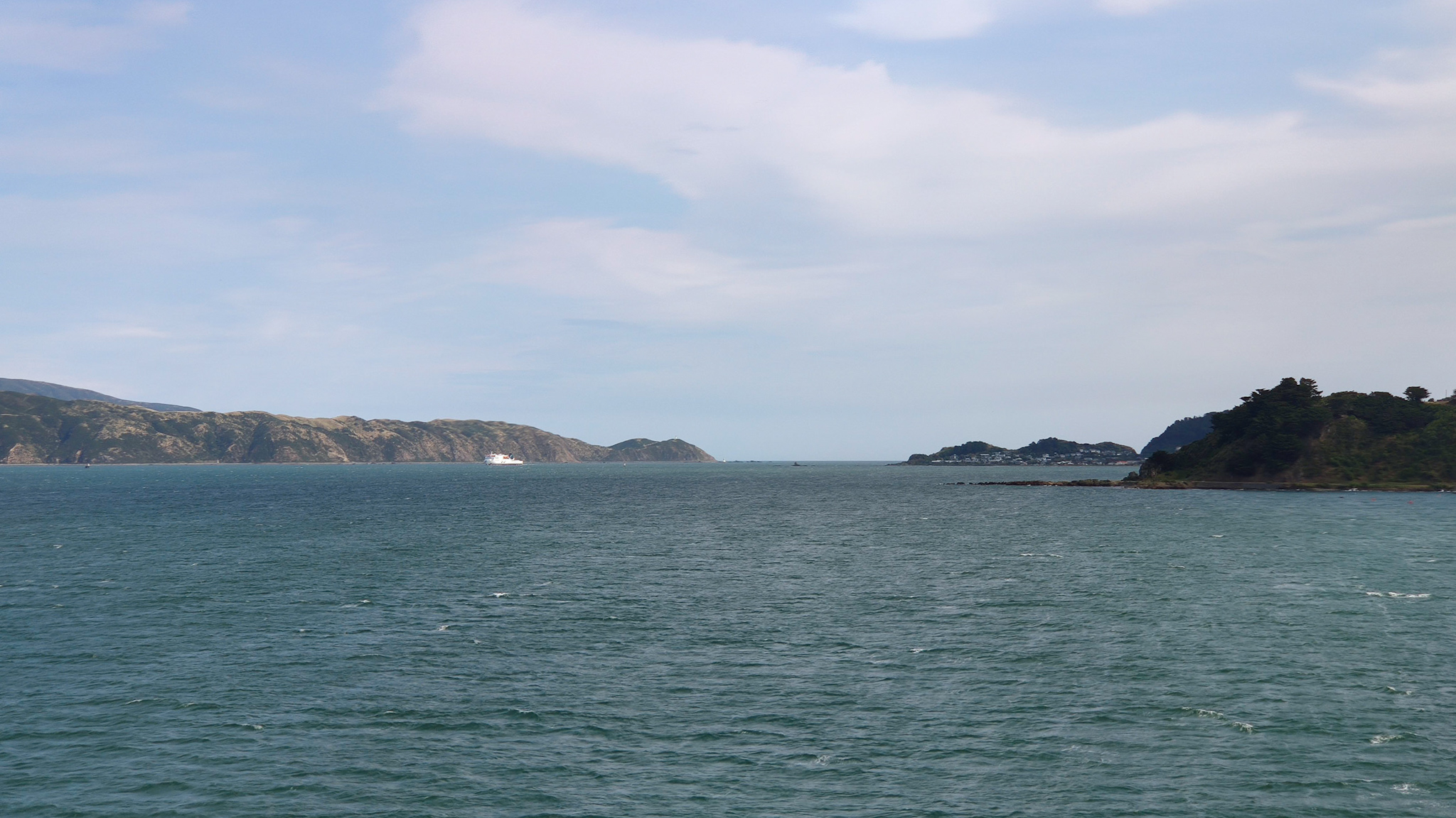 Um 15 Uhr bin ich beim Terminal, die Abfertigung geht sehr rasch und professionell und schon steht mein Campervan auf dem obersten von drei Fahrzeugdecks. Eine halbe Stunde früher (um 16:30) fährt die Fähre schon ab. Nach relativ kurzer Zeit sind wir aus dem geschützten Hafengebiet raus und befinden und auf der Cook Strait. Obwohl heute ein sehr ruhiger Tag ist, bläst der Wind auf dem offenen Observation Deck recht heftig und das Schiff fängt an zu rollen. Die Gischt spritzt bis hier oben.