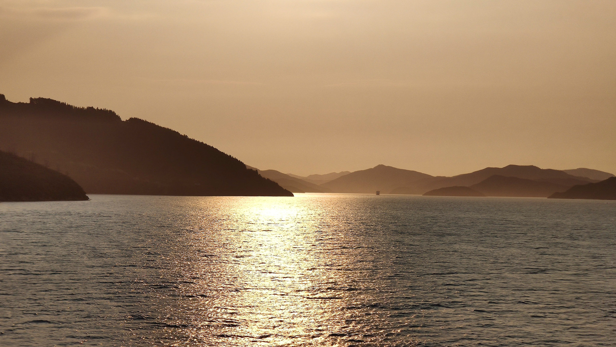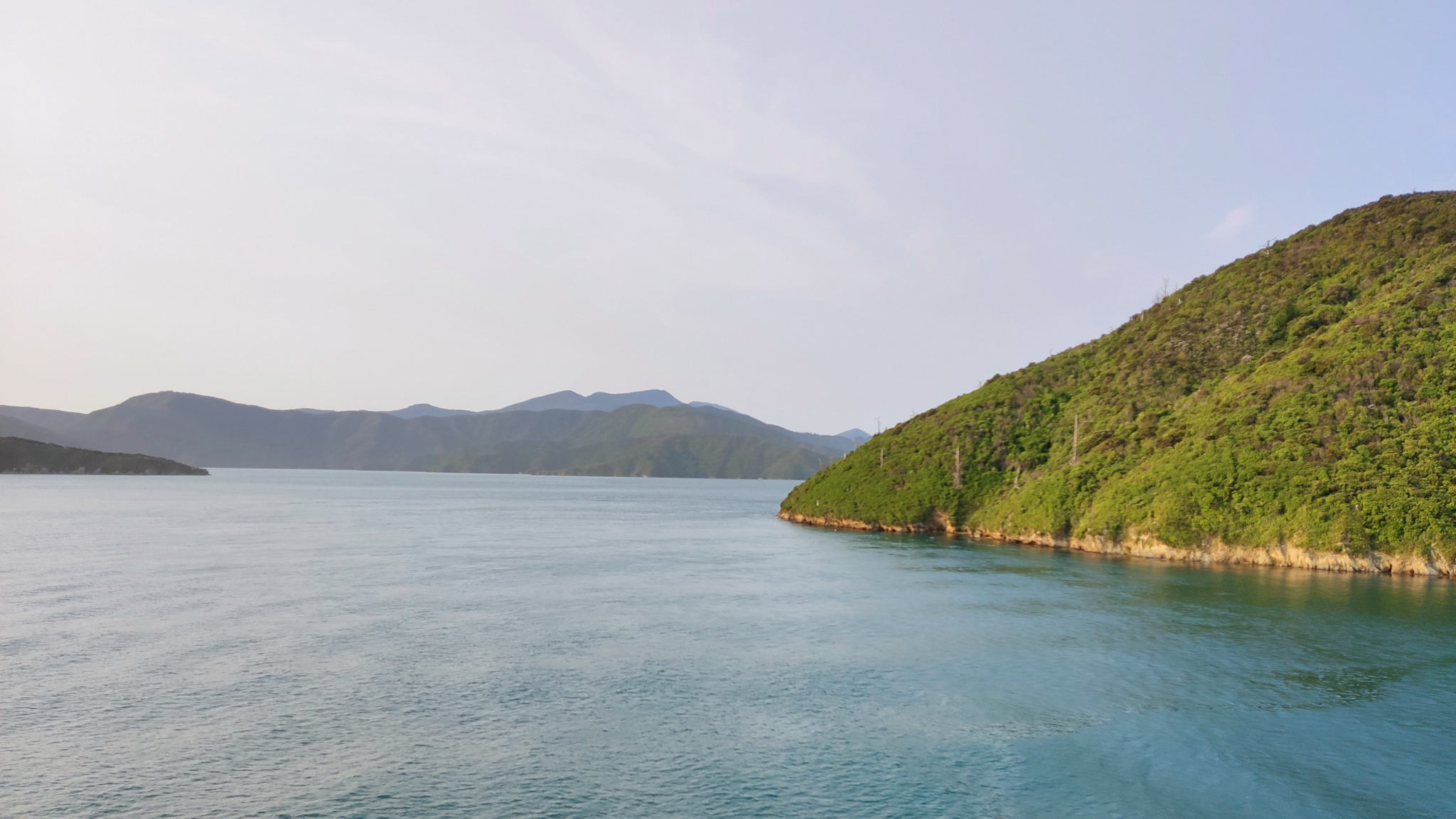 Ich verziehe mich nach unten und finde nach einiger Suche noch einen leeren Sessel zuvorderst am Fenster. Schnell etwas zu Essen im Restaurant geholt (es wackelt ganz schön), dieses gegessen und dann den Wellen zugeschaut. Da habe ich sogar eine Gruppe Delfine entdeckt! Nach etwa 2h haben wir schon die Südinsel erreicht und sind wir dann in die Queen Charlotte Strait eingebogen. Jetzt fängt eine faszinierend Reise im Abendlicht durch eine schmale Wasserstrasse bis nach Picton an. Diese Fahrt geht nochmals eine Stunde!