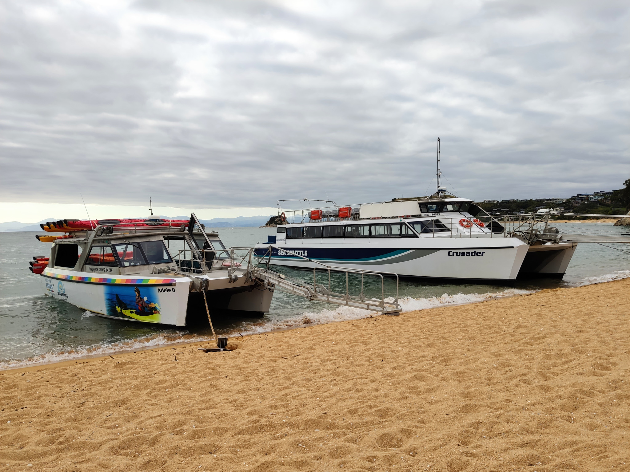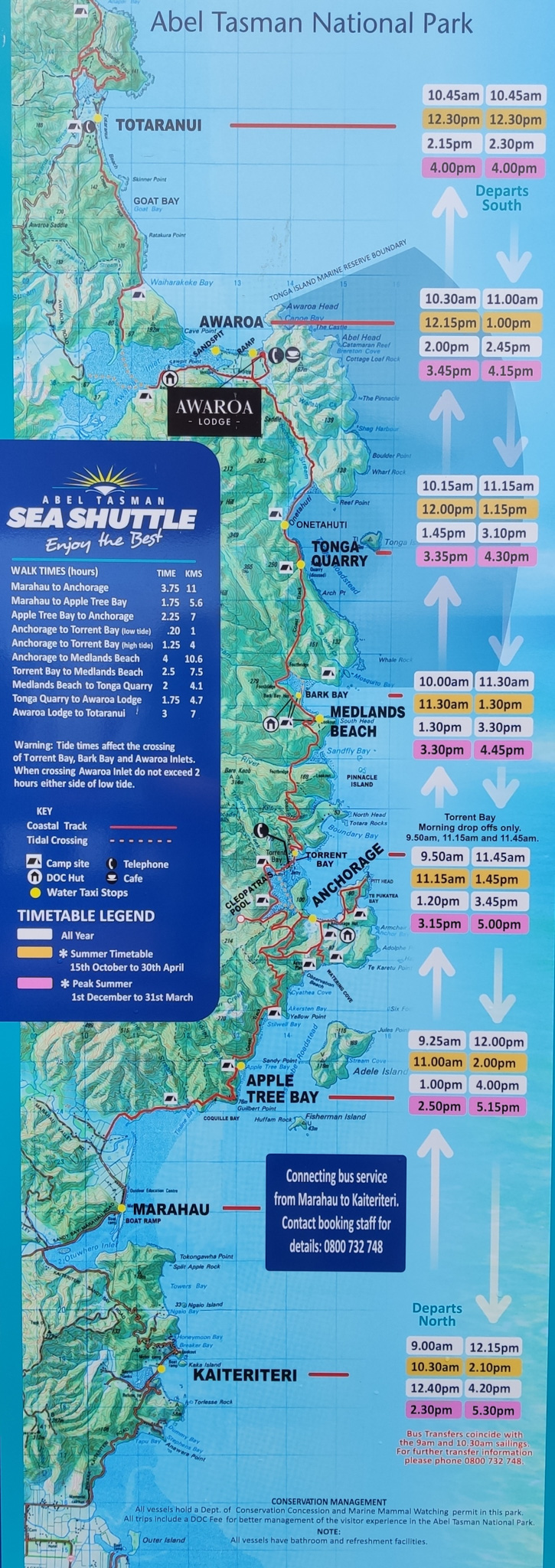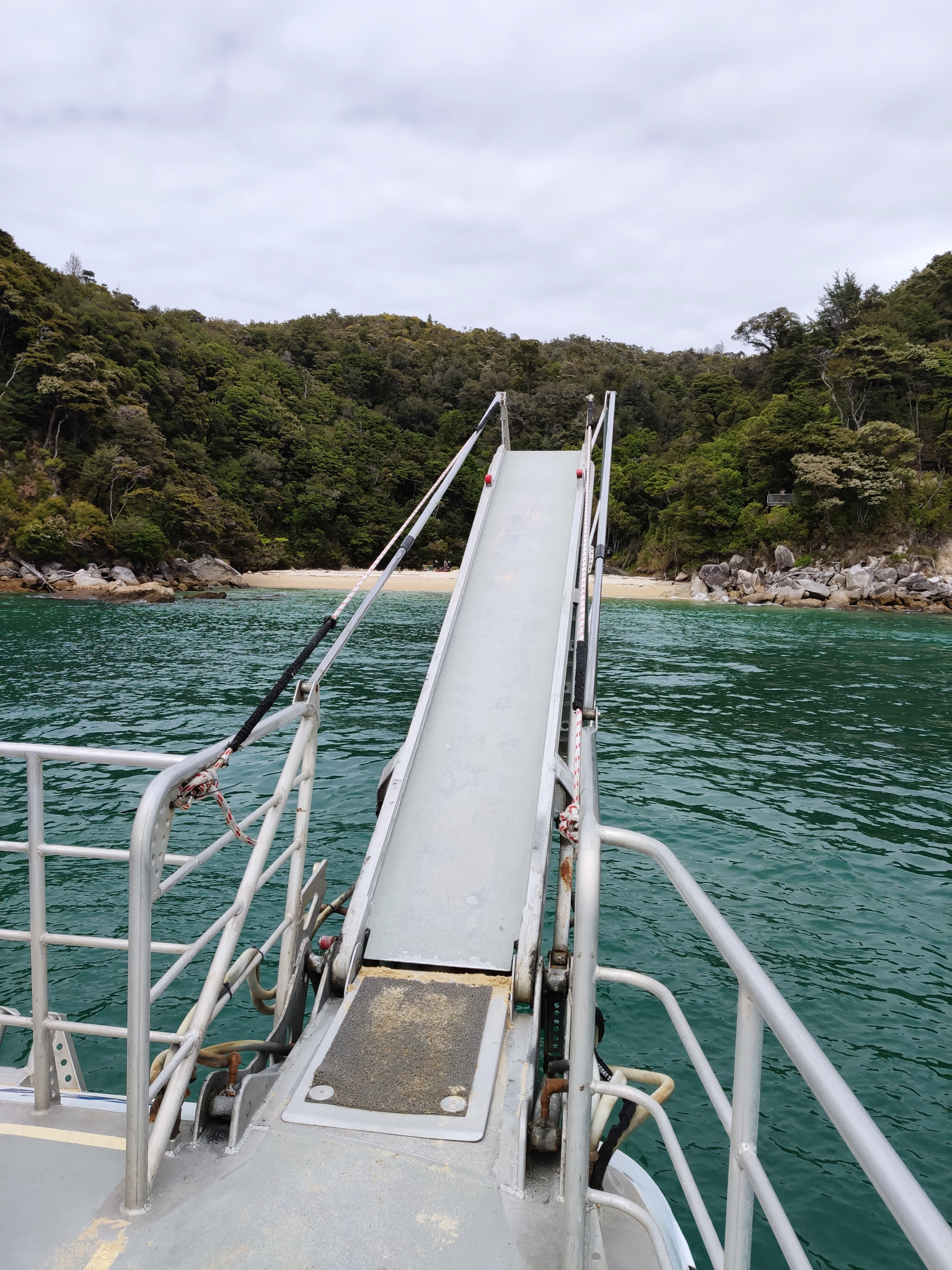 Ich habe mich für einen rund 11km langen Walk von Medlands Beach nach Anchorage entschieden. Das nach einem festen Fahrplan fahrende Schiff fährt einen Rundkurs entlang der Küste des Nationalparks. Der erste Kurs startet um 9 Uhr in Keiteriteri und hält auf der Rückfahrt um 11:30 in Medlands Beach. Um 15:45 nehme ich den zweitletzten Kurs (des Sommerfahrplans), welcher um 16:20 wieder in Keiteriteri anlegt.