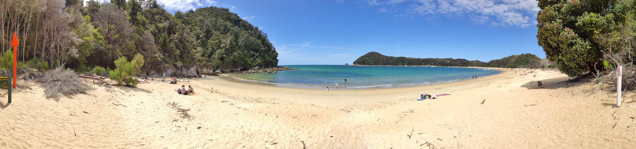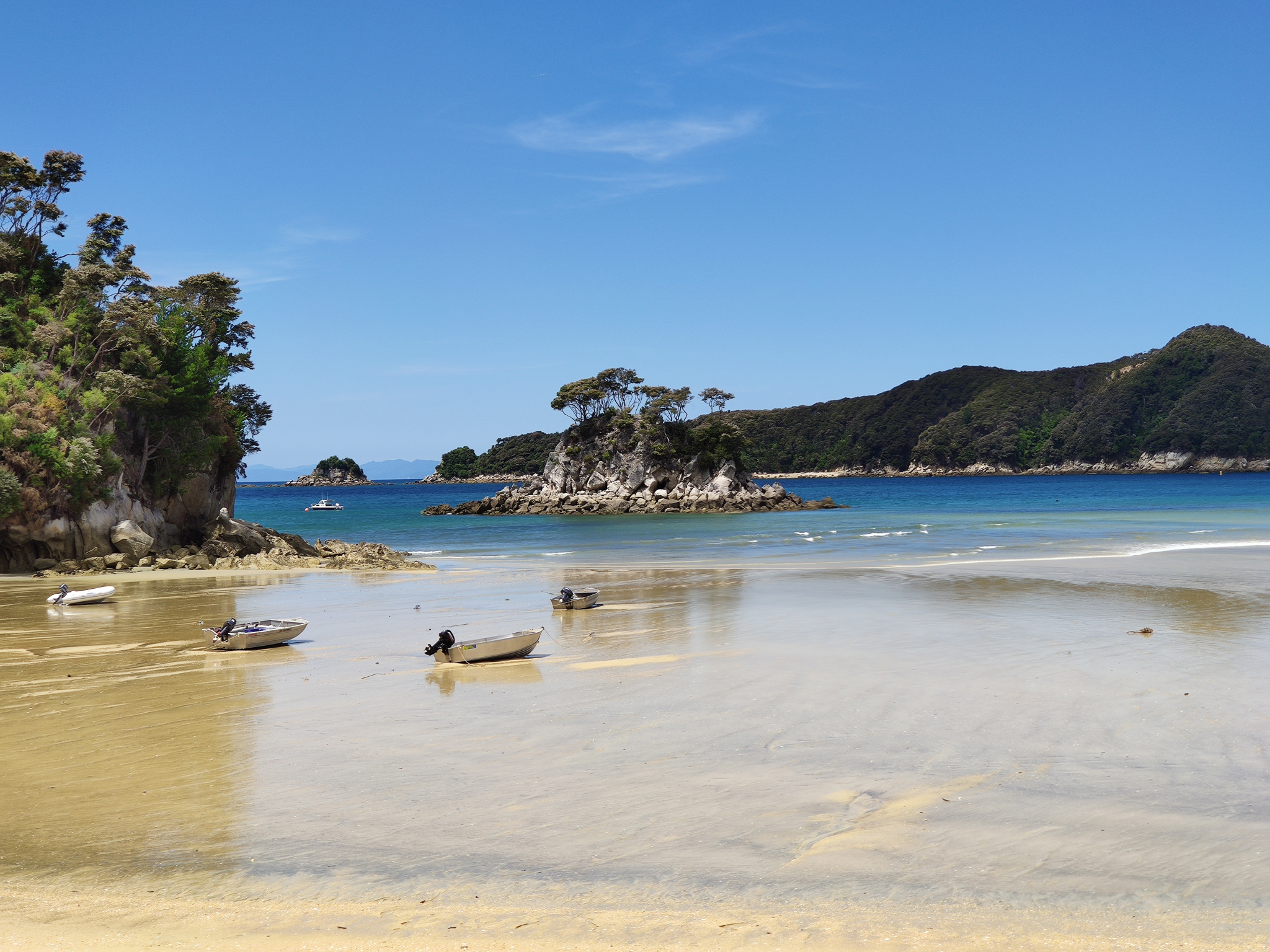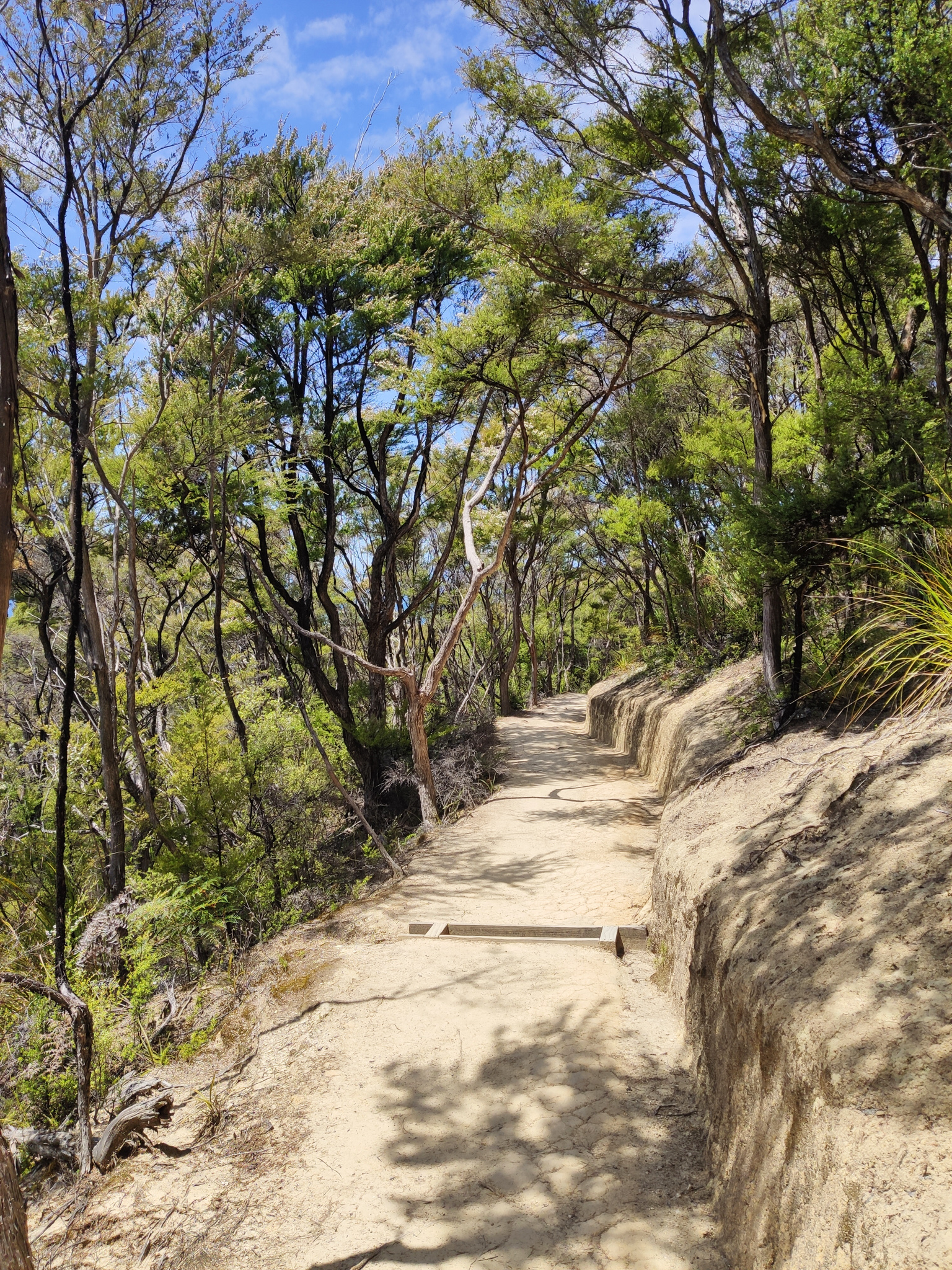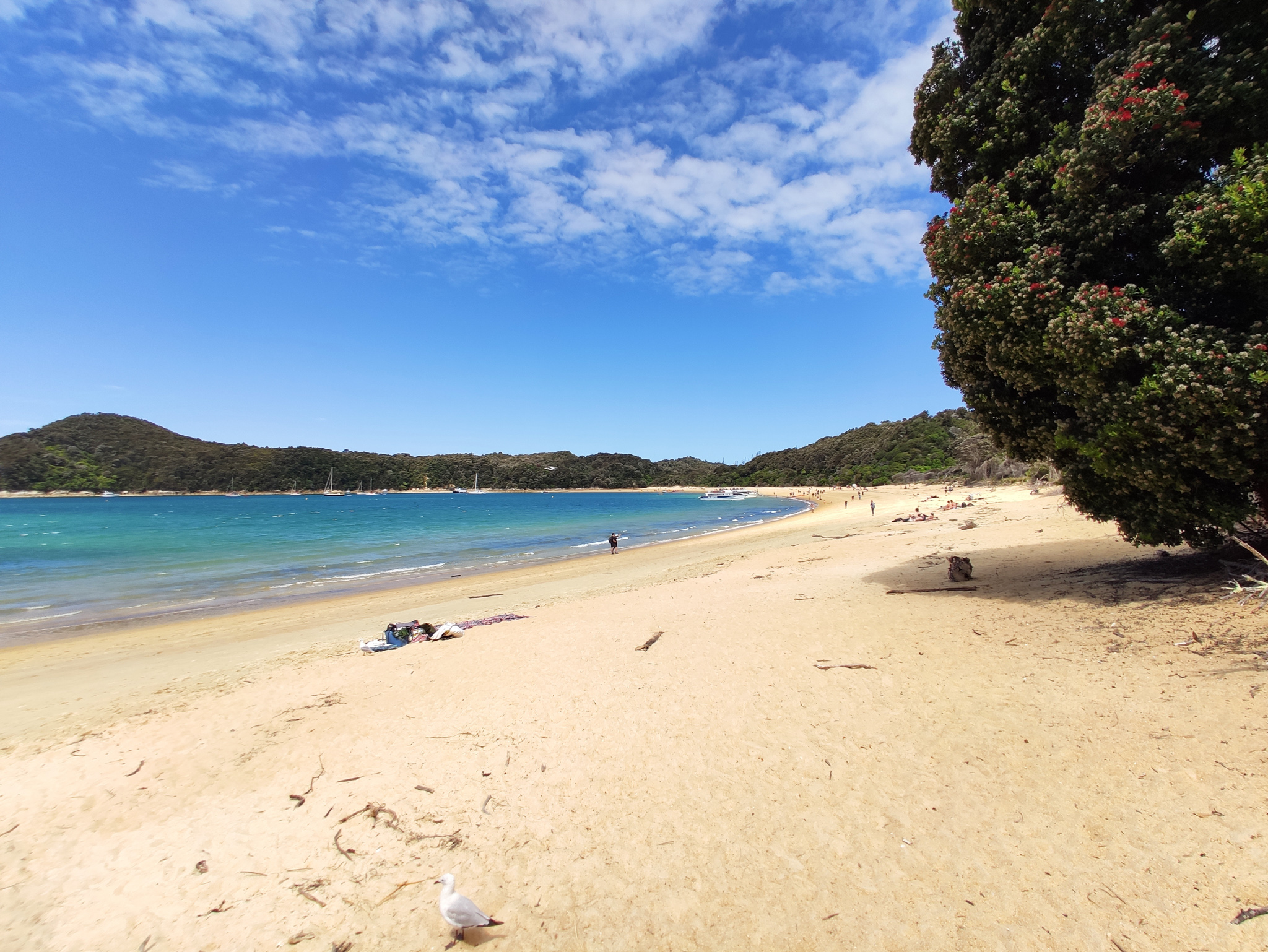 Zurück zur Weggabelung hatte ich dann noch knapp eine Stunde (bis zur Ablegezeit) für die letzten 2.7km bis zur Anlegestelle am Strand von Anchorage. Es hiess also, etwas Tempo aufzunehmen auf dem langen Aufstieg zum letzten Hügel vor dem Strand. Notfalls würde aber (im Sommer) noch ein letzter Kurs um 5pm fahren. Aber den gebuchten Termin schaffte ich natürlich nach Plan und hatte am paradiesischen Strand dann noch knapp eine halbe Stunde zum Ausruhen, bis das Schiff nach Kaiteriteri auslief.