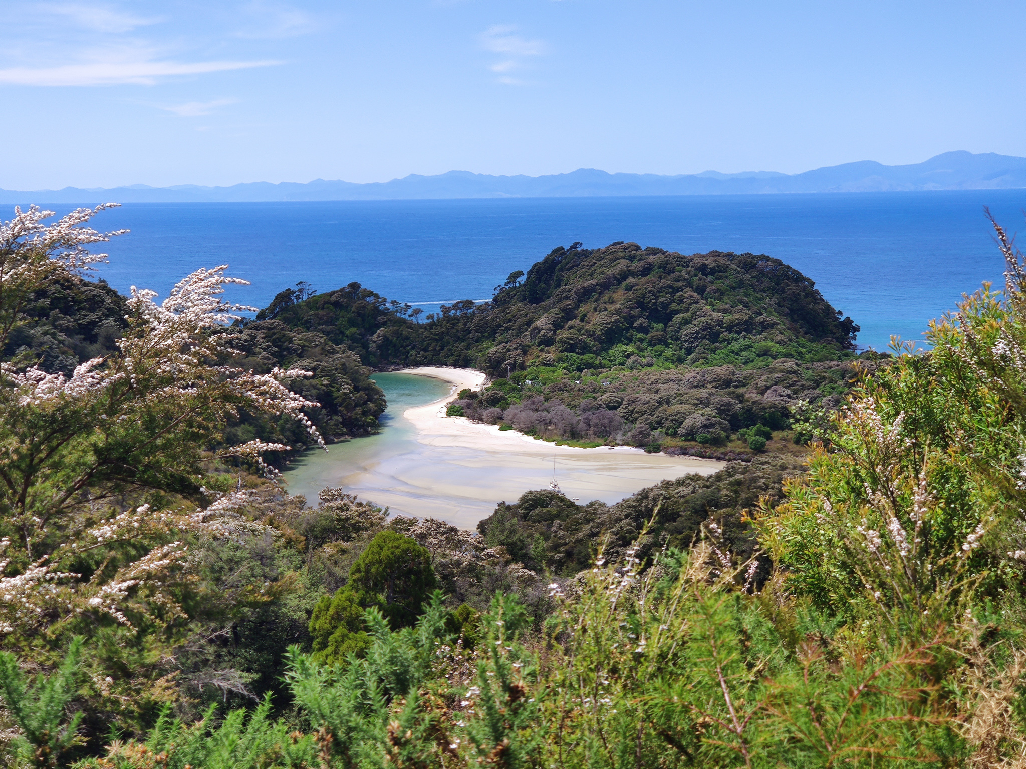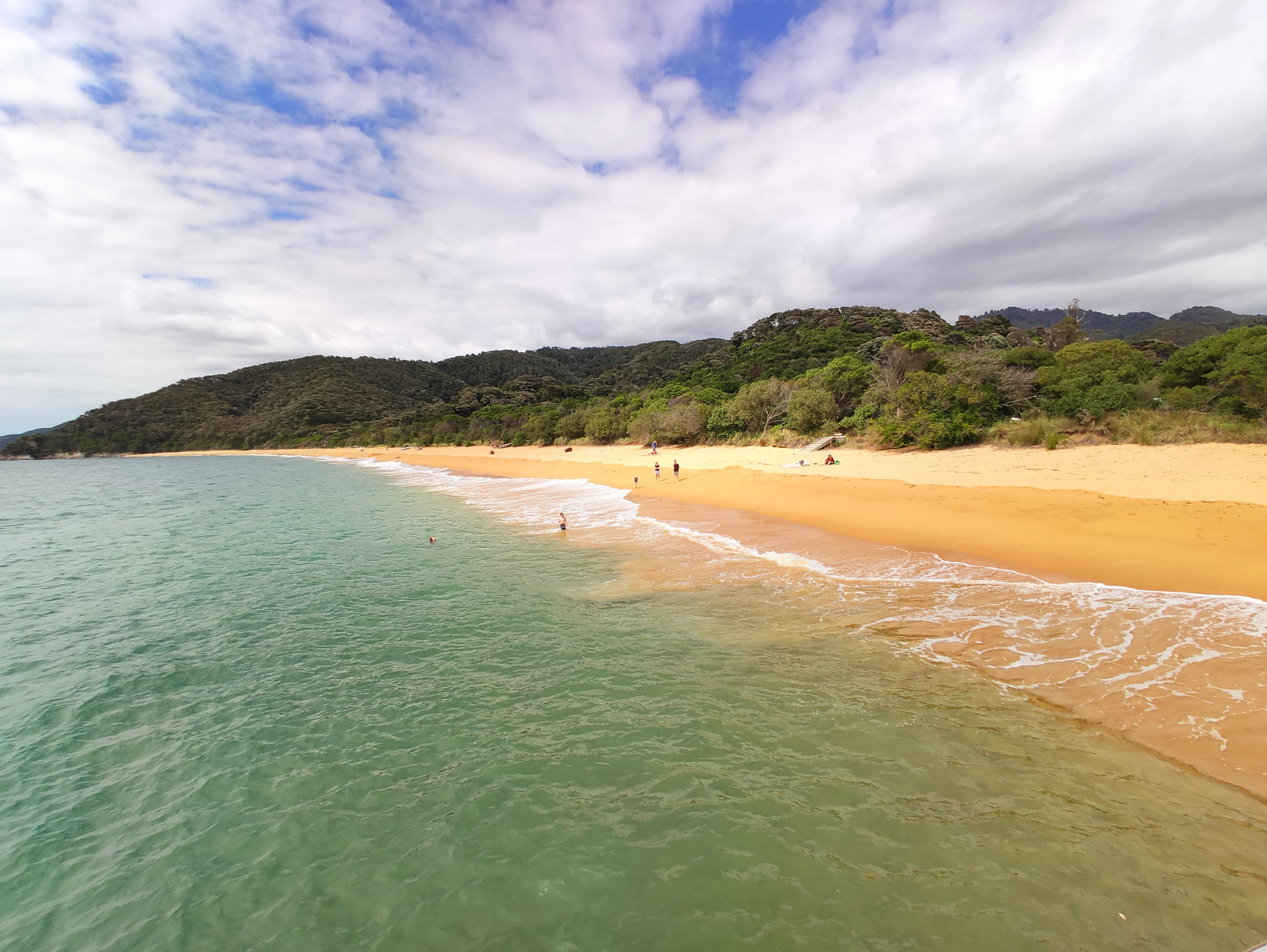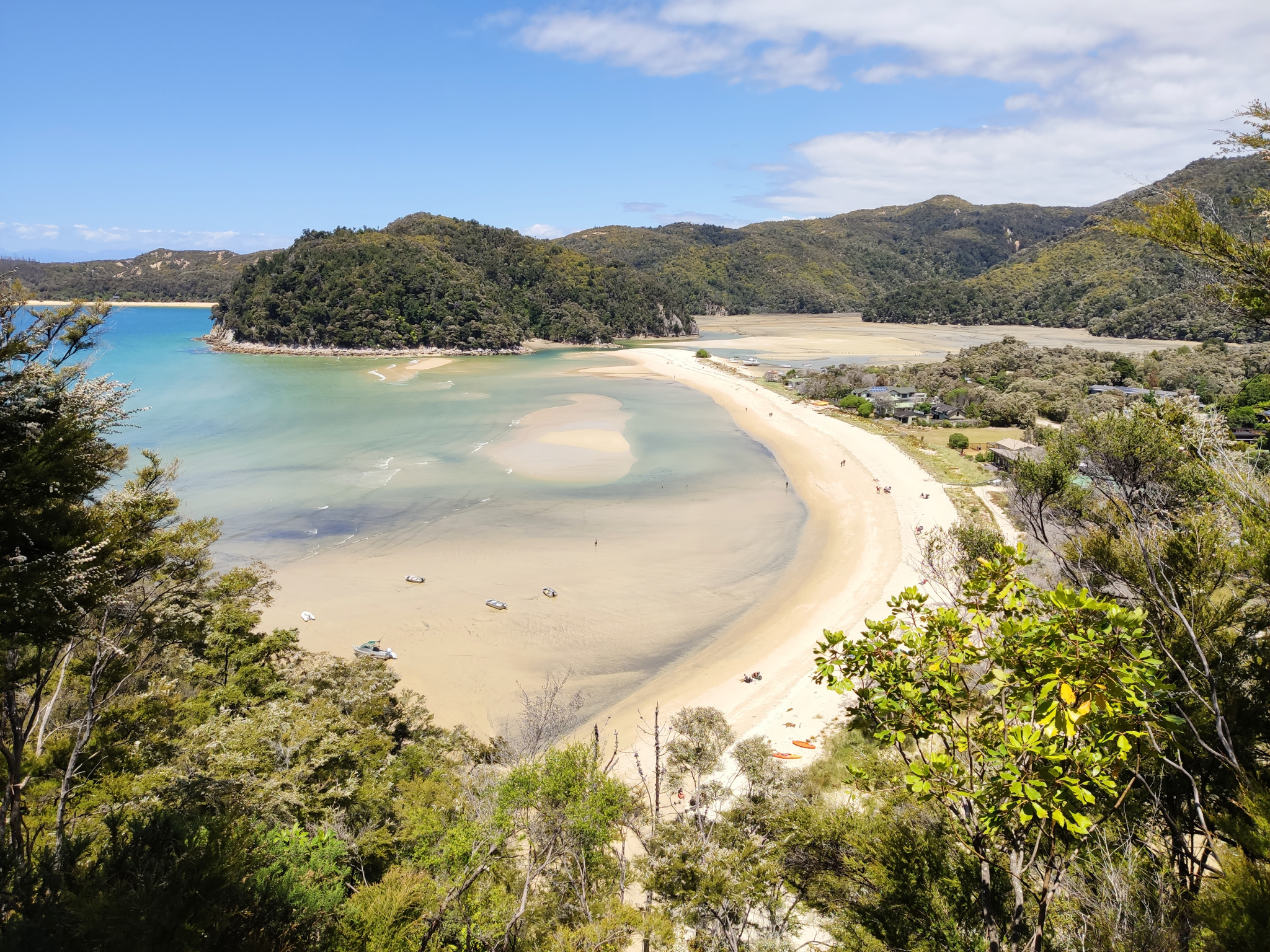 Zurück zur Weggabelung hatte ich dann noch knapp eine Stunde (bis zur Ablegezeit) für die letzten 2.7km bis zur Anlegestelle am Strand von Anchorage. Es hiess also, etwas Tempo aufzunehmen auf dem langen Aufstieg zum letzten Hügel vor dem Strand. Notfalls würde aber (im Sommer) noch ein letzter Kurs um 5pm fahren. Aber den gebuchten Termin schaffte ich natürlich nach Plan und hatte am paradiesischen Strand dann noch knapp eine halbe Stunde zum Ausruhen, bis das Schiff nach Kaiteriteri auslief.