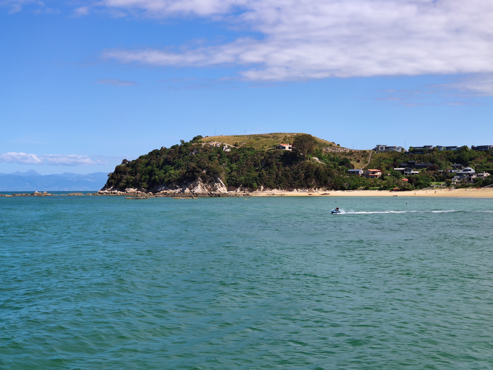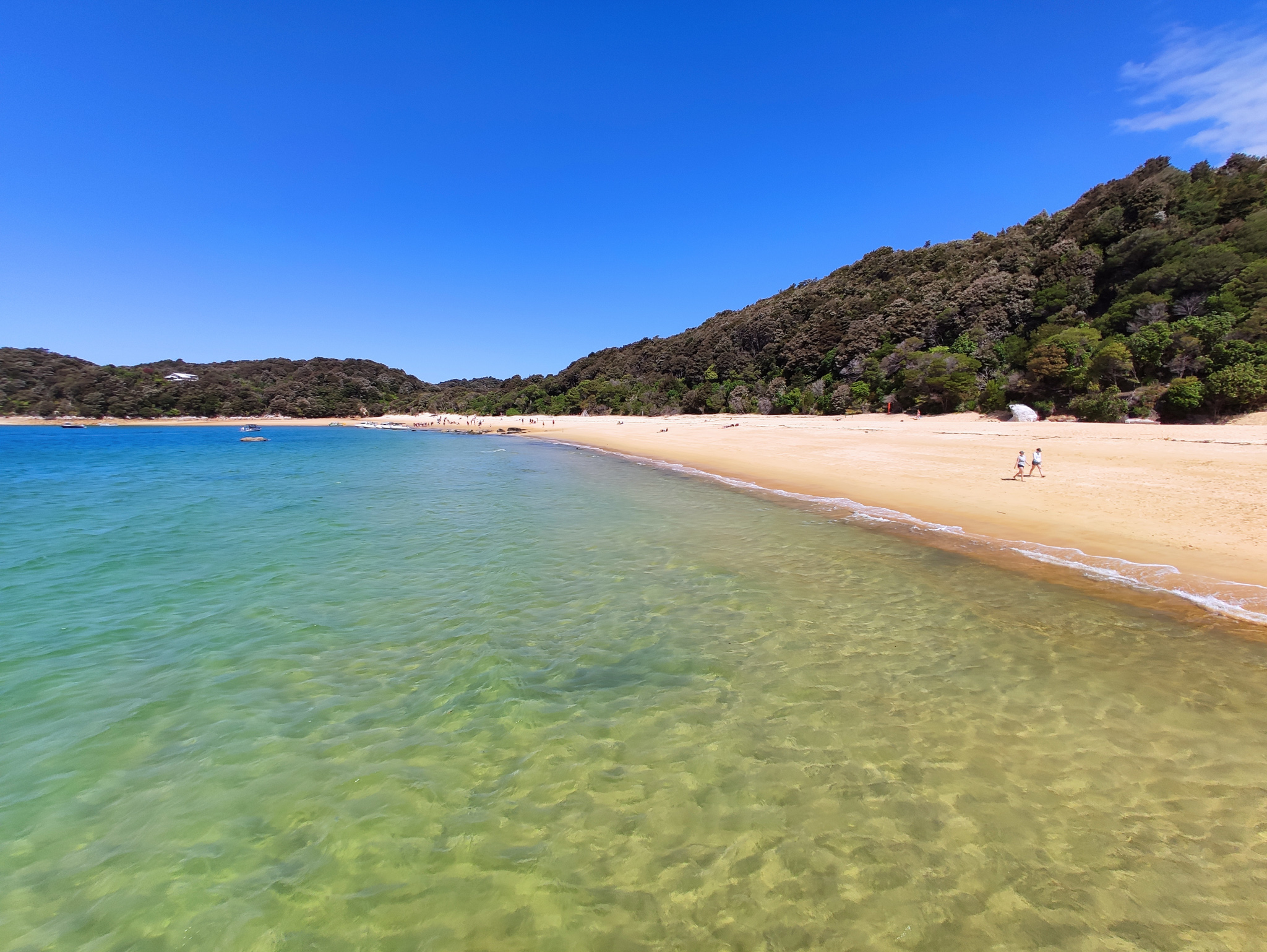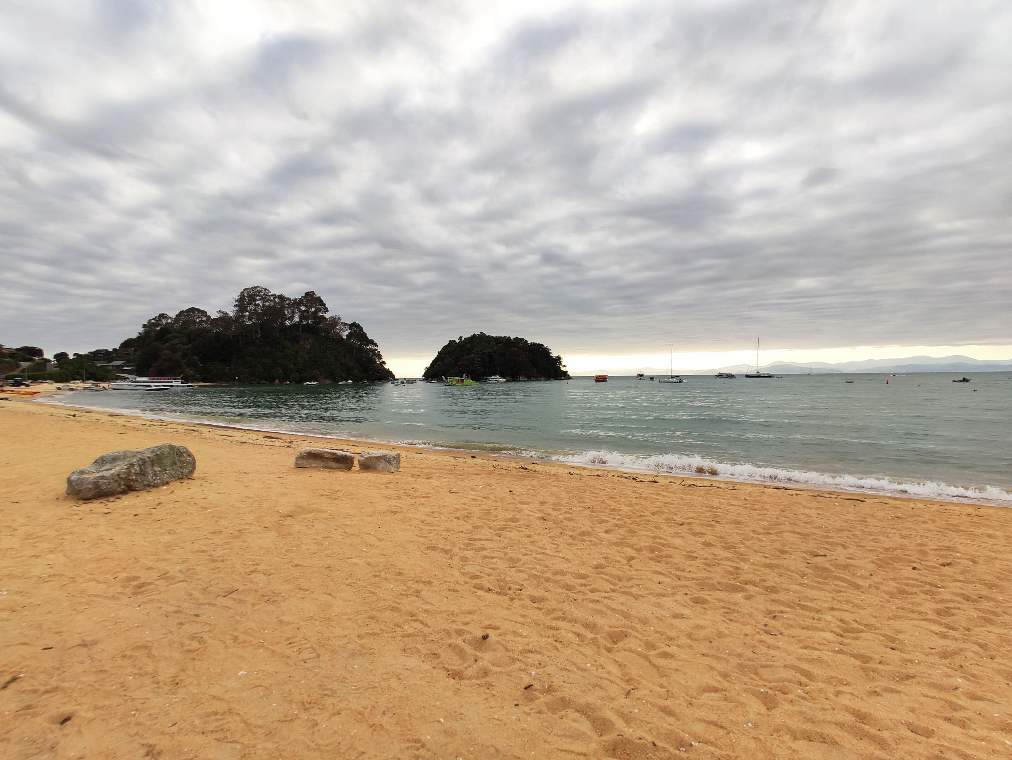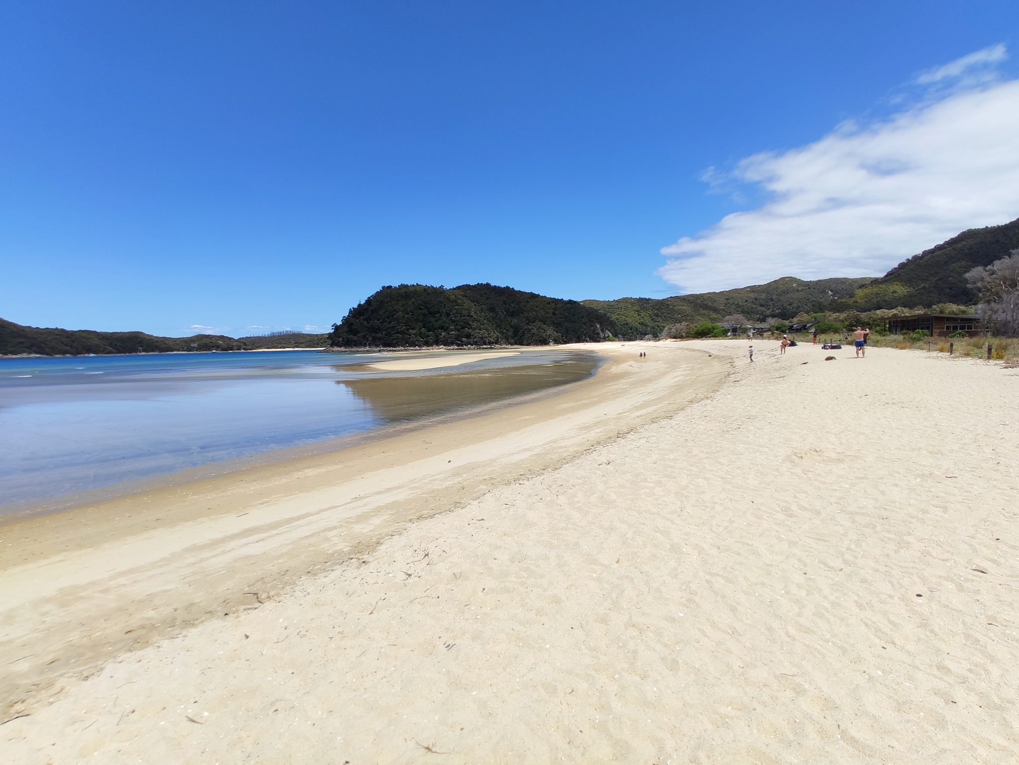 Zurück zur Weggabelung hatte ich dann noch knapp eine Stunde (bis zur Ablegezeit) für die letzten 2.7km bis zur Anlegestelle am Strand von Anchorage. Es hiess also, etwas Tempo aufzunehmen auf dem langen Aufstieg zum letzten Hügel vor dem Strand. Notfalls würde aber (im Sommer) noch ein letzter Kurs um 5pm fahren. Aber den gebuchten Termin schaffte ich natürlich nach Plan und hatte am paradiesischen Strand dann noch knapp eine halbe Stunde zum Ausruhen, bis das Schiff nach Kaiteriteri auslief.