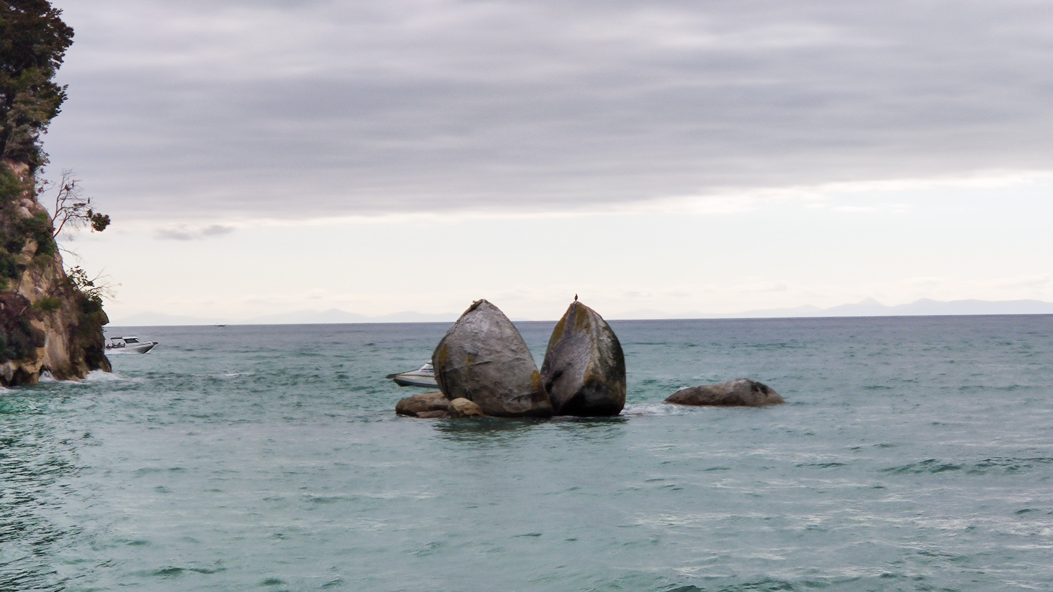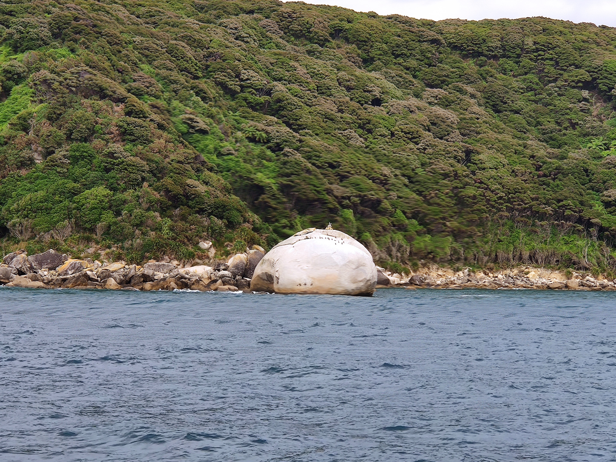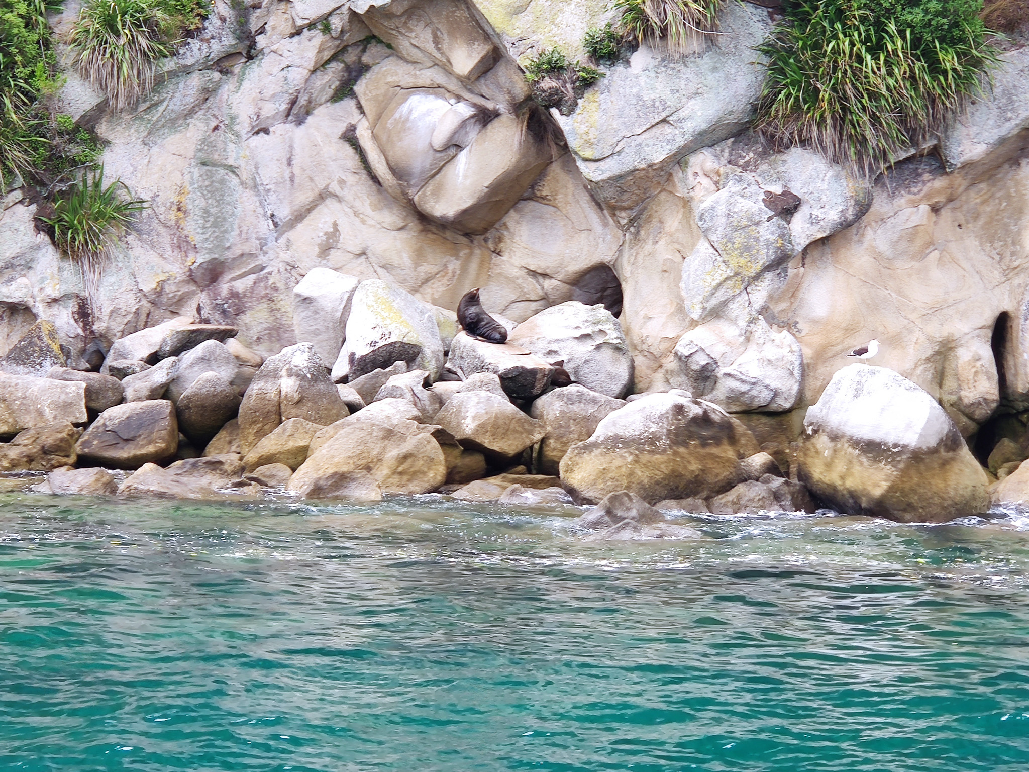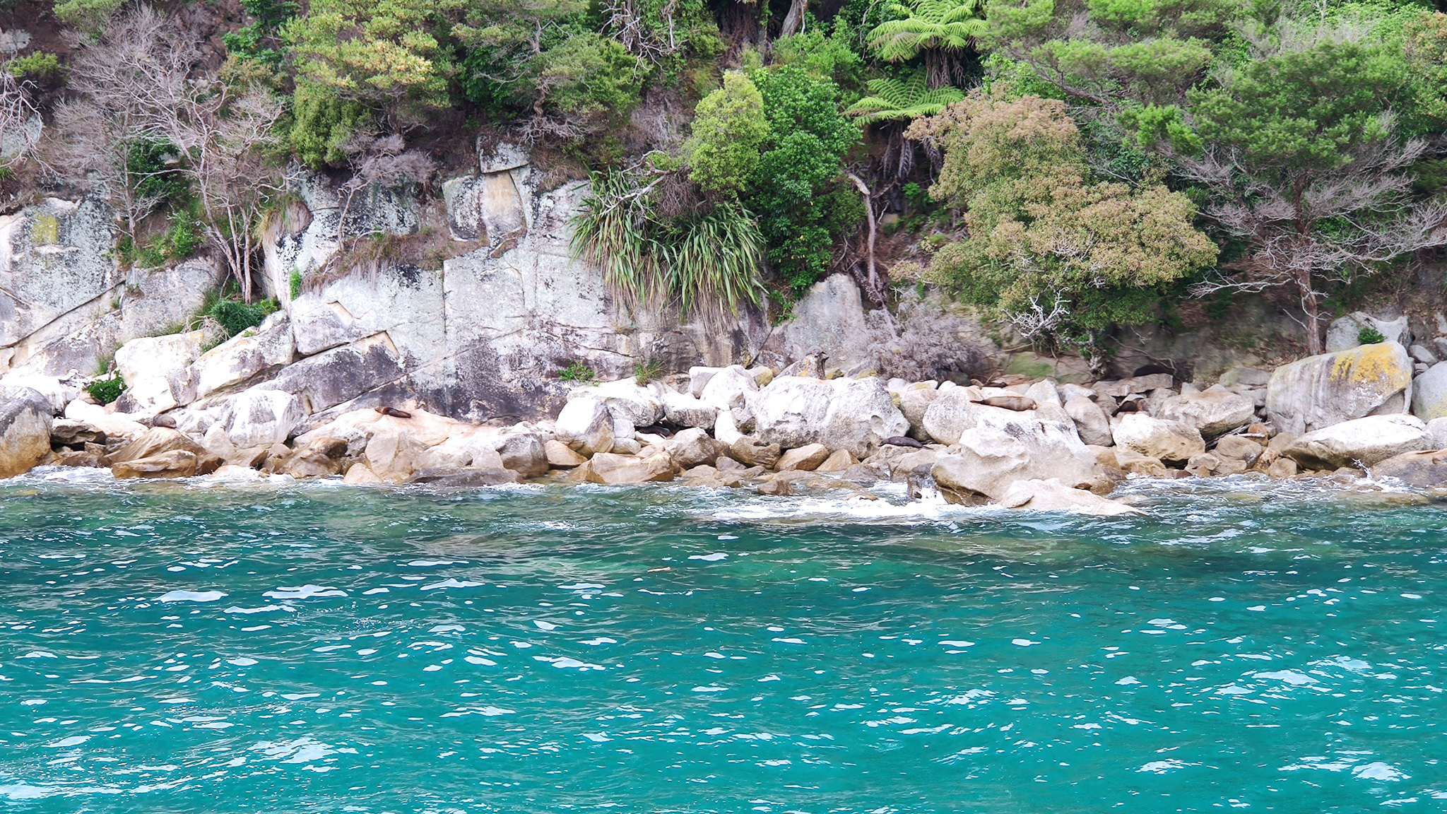 Zuerst sehen wir den Split Apple Rock, halten an der Apple Tree Bay (welche wegen einer ehemaligen Plantage so heisst, früher waren grosse Teile des NP privates Farmland) und sehen dann an der Küste von Adele Island die Seehund-Kolonie. Richtig herzig sind die vor ein paar Tagen geborenen, winzigen Seehundbabies.