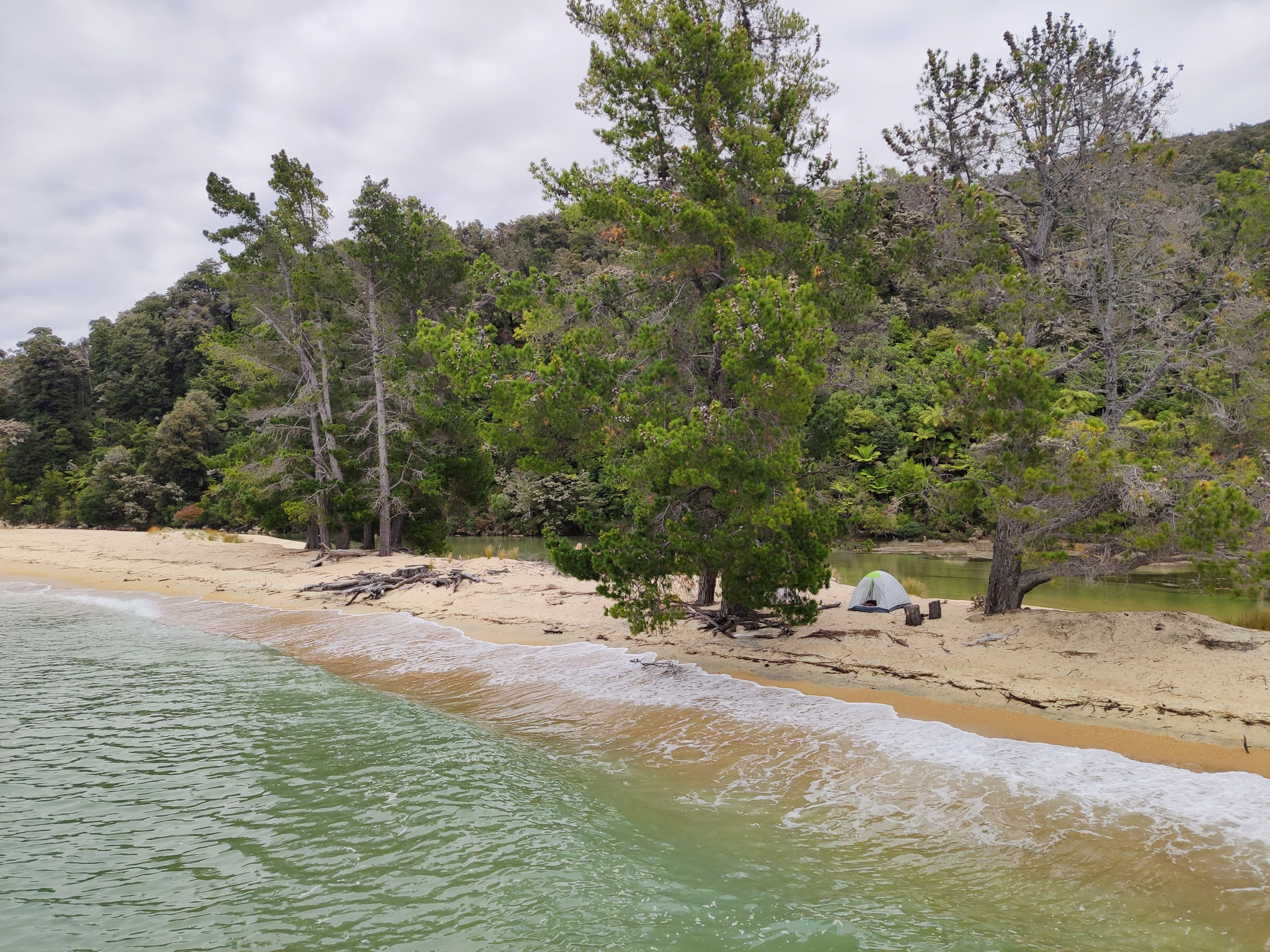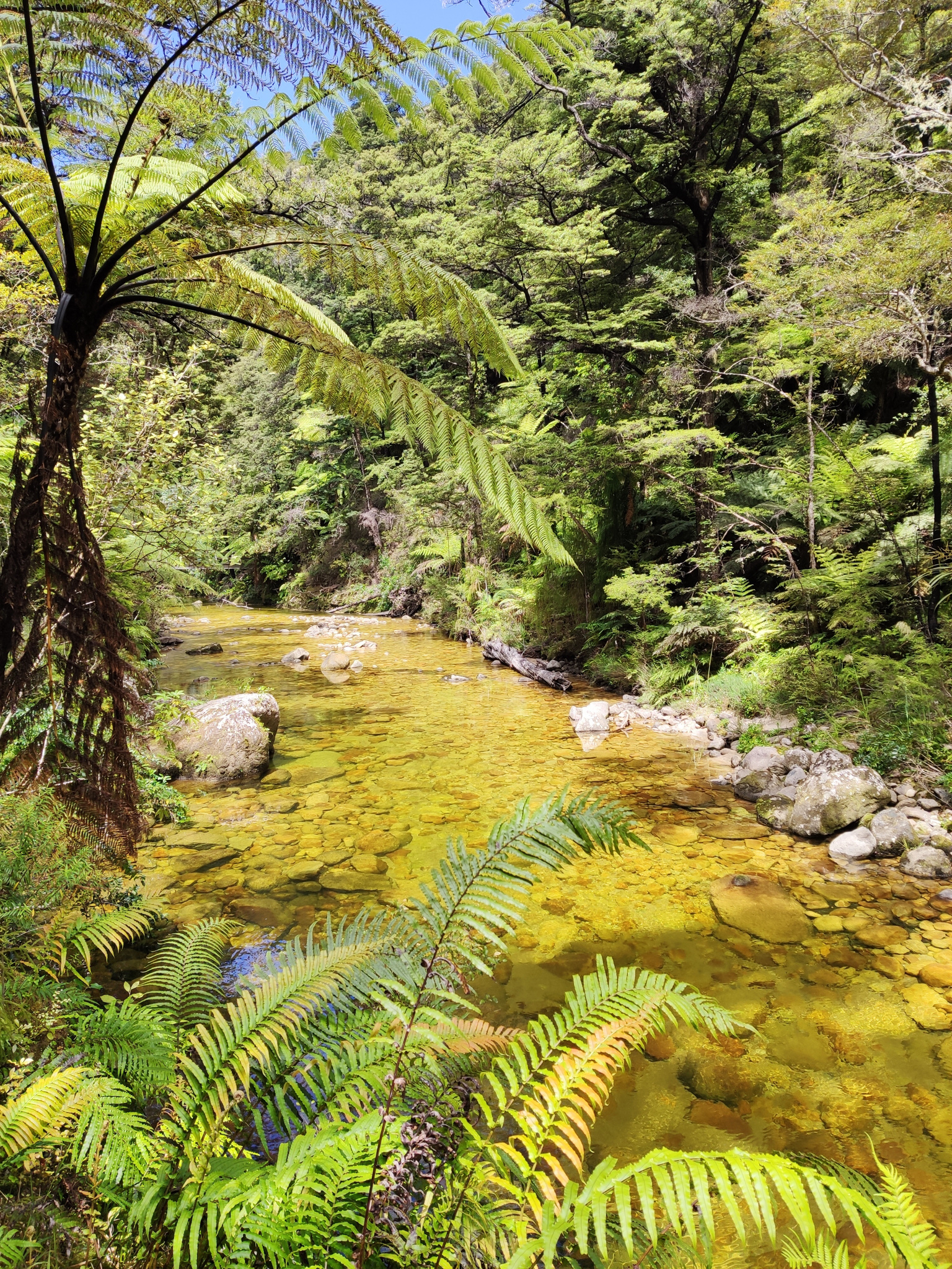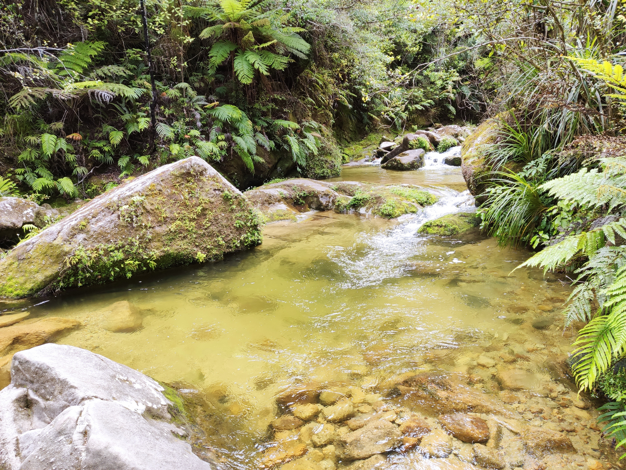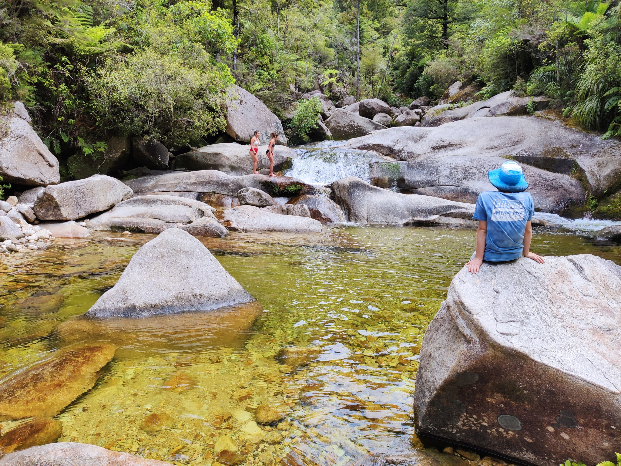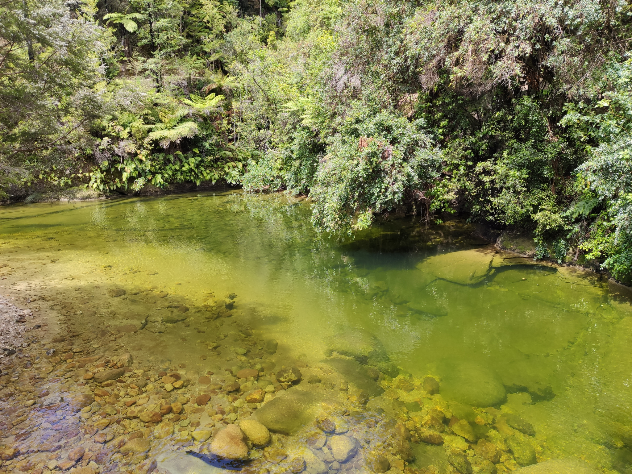 In Torrent Bay kann man rund um Niedrigwasser eine Abkürzung über den freigelegten Sand nach Anchorage nehmen, welcher den Weg um etwa 3km abkürzt. Aber ich war ja zum Wandern hier und nahm den längeren Weg hinten durch, entlang der Küste. Der erlaubt es nämlich auch, einen Abstecher (rund 1km hin- und zurück) zu Cleopatras Pool zu machen. Der Weg entlang des grünen Baches war fast schöner als der Pool selbst. Der animiert aber die jungen Leute zu einem Sprung ins kühle Nass.
