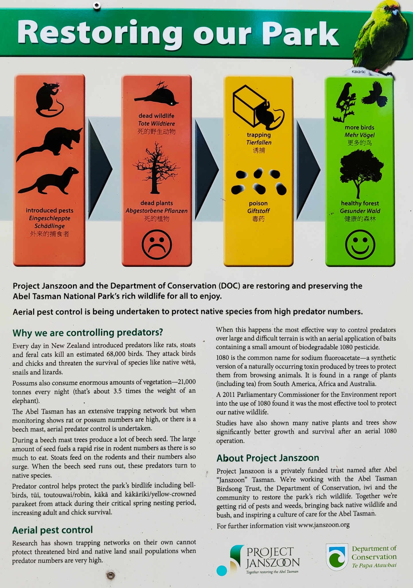 Dieses Privileg haben fremde Pflanzen und Tiere im NP nicht: Sie werden systematisch ausgerottet. So viele markierte Bäume, Insekten- und Kleintierfallen habe ich noch nie gesehen. Man sieht überall tote Pinien aus den Küstenwäldern ragen. Das zeigt aber Wirkung und man konnte schon wieder gefährdete Vogelarten erfolgreich auswildern.