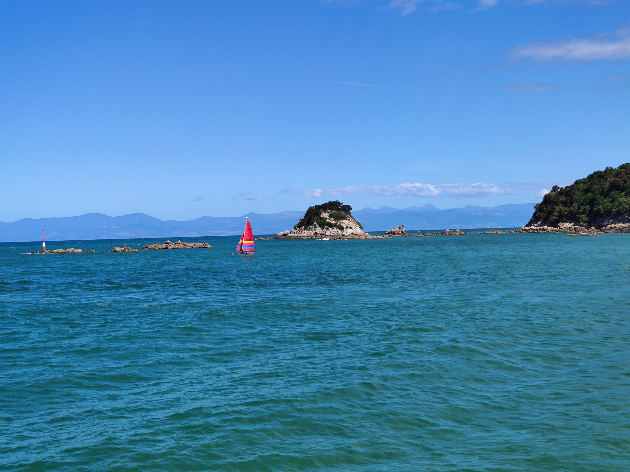 Mit dem kalten Wind im Rücken war es auf dem Oberdeck etwas wärmer und wir konnten noch einmal die nun im Sonnenschein leuchtende Küste bewundern. Und schon landeten wir am Strand von Kaiteriteri.