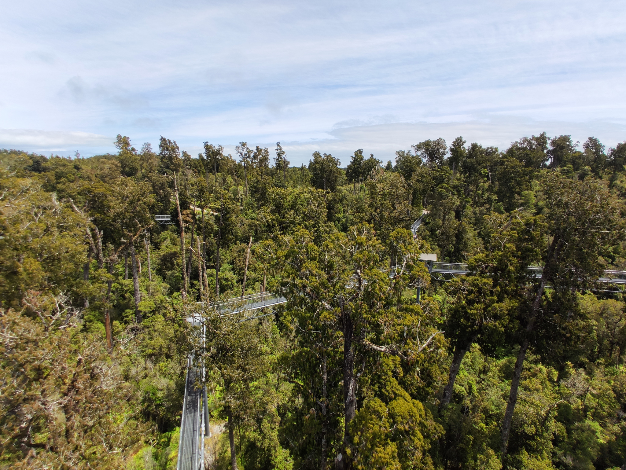 Wenn man den Steg raufgeht, erwartet einem ein tolles Abenteuer mitten in den Giganten des gemässigten Regenwaldes. Man kommt sich vor wie ein Vogel in den Baumkronen von alten Rimu und Kamahi-Bäumen. Die stählernen Brücken und Plattformen befinden sich auf einer Höhe von 20m und überbrücken ganze 450 Meter. Wer noch etwas mehr Herzklopfen erleben möchte, klettert dann wie ich die 107 Treppenstufen auf den Hokitika-Turm, wo man heute bei klarer Sicht auf 47 Metern über dem Waldboden die sensationelle Aussicht bis in die majestätischen, schneebedeckten Gipfel der südlichen Alpen und bis zur Tasmanischen See geniessen kann.