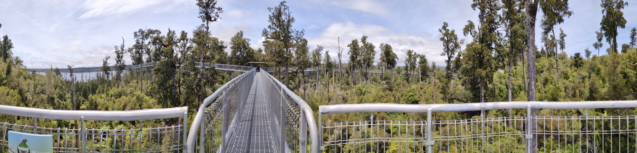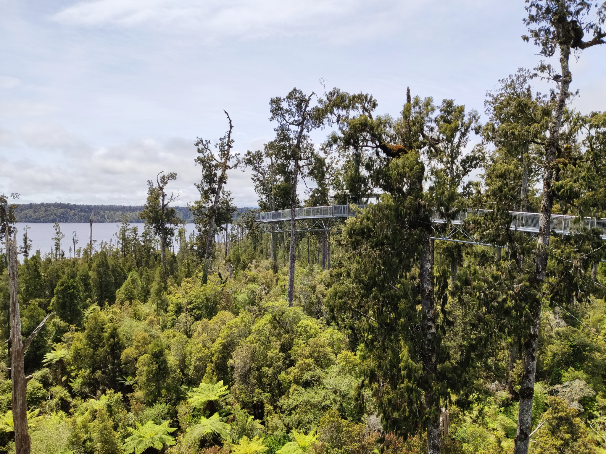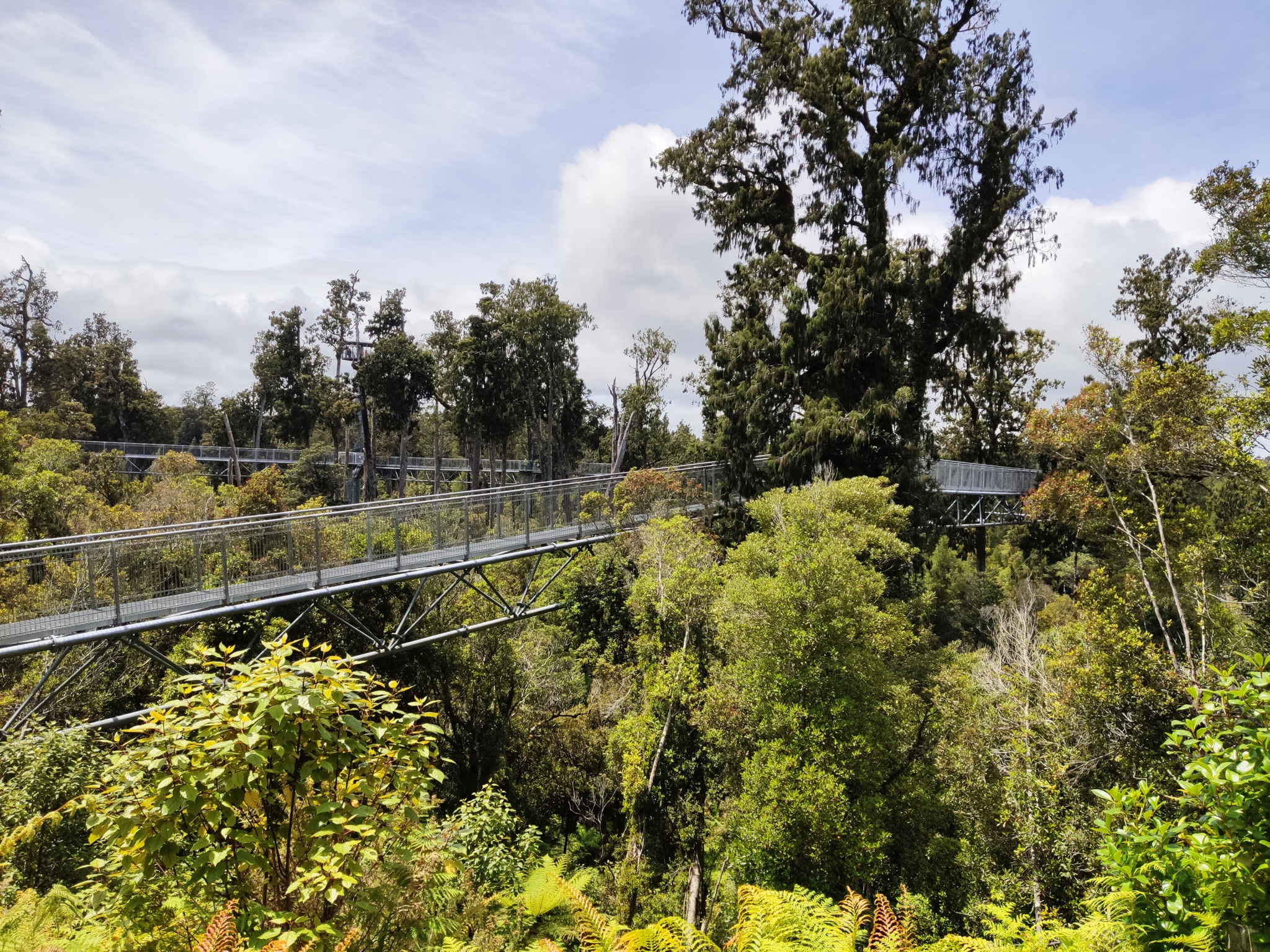 Wenn man den Steg raufgeht, erwartet einem ein tolles Abenteuer mitten in den Giganten des gemässigten Regenwaldes. Man kommt sich vor wie ein Vogel in den Baumkronen von alten Rimu und Kamahi-Bäumen. Die stählernen Brücken und Plattformen befinden sich auf einer Höhe von 20m und überbrücken ganze 450 Meter. Wer noch etwas mehr Herzklopfen erleben möchte, klettert dann wie ich die 107 Treppenstufen auf den Hokitika-Turm, wo man heute bei klarer Sicht auf 47 Metern über dem Waldboden die sensationelle Aussicht bis in die majestätischen, schneebedeckten Gipfel der südlichen Alpen und bis zur Tasmanischen See geniessen kann.