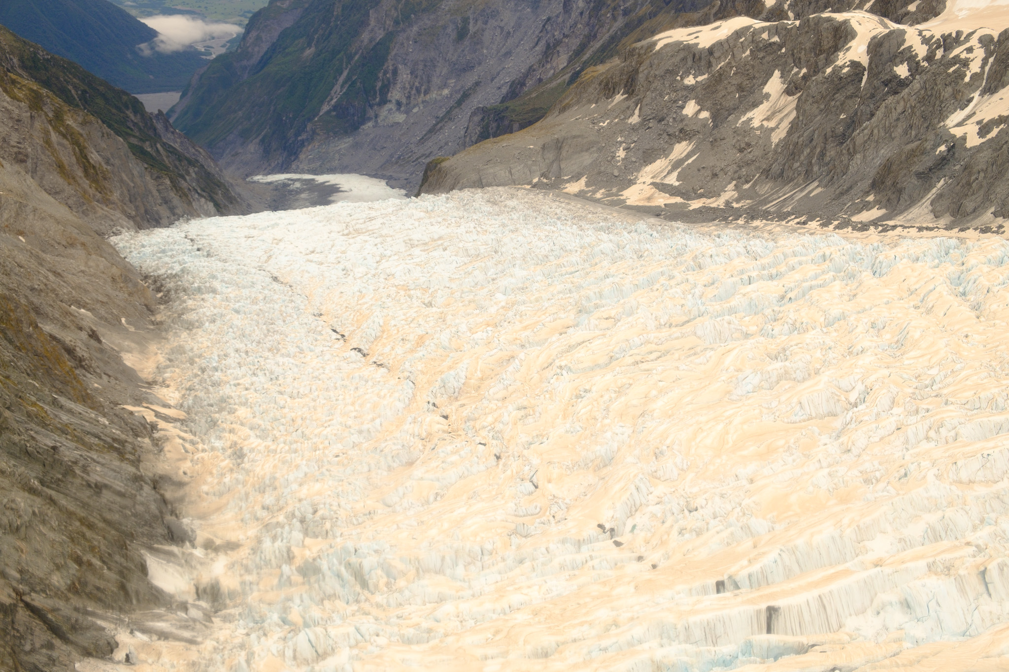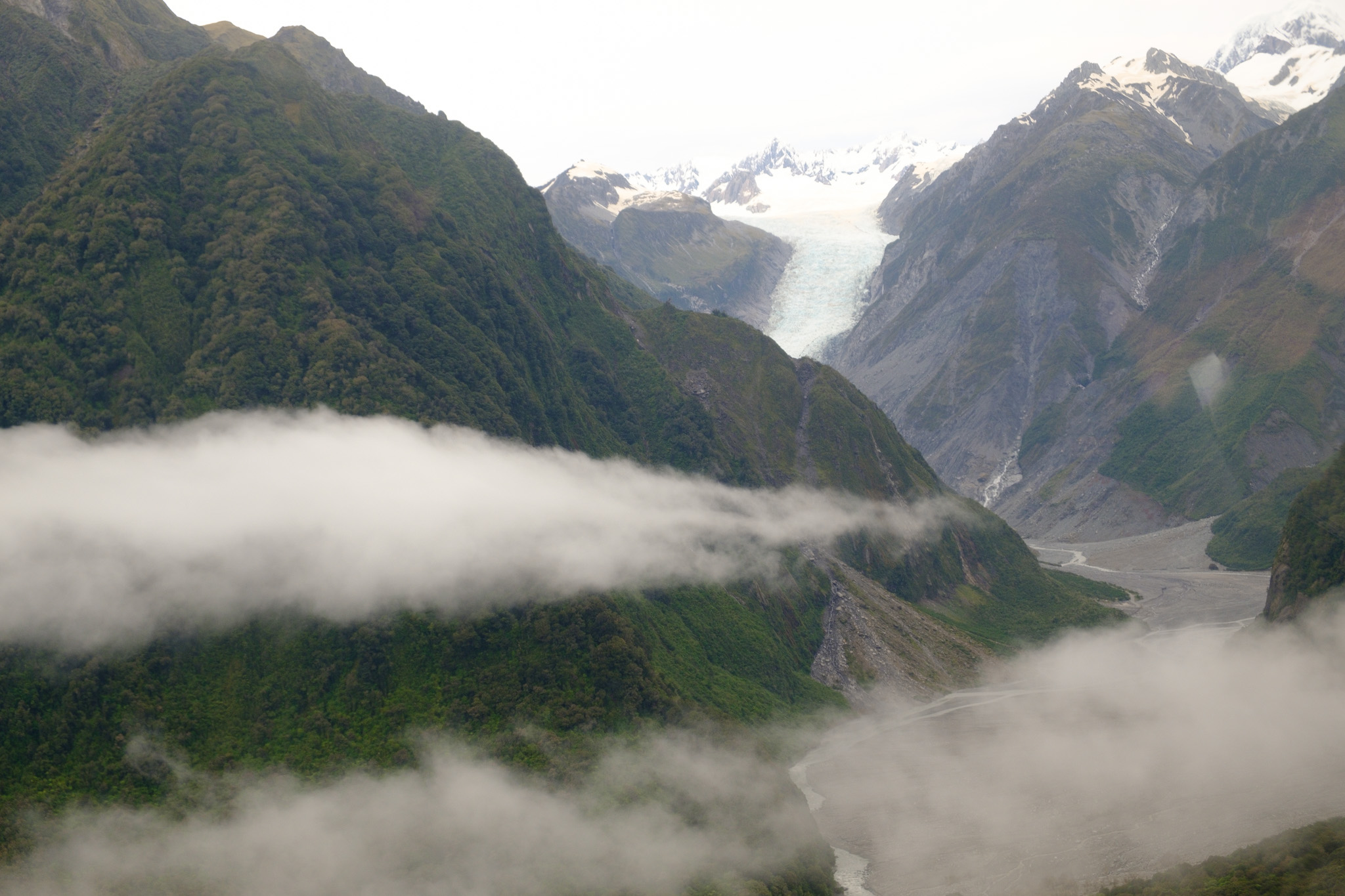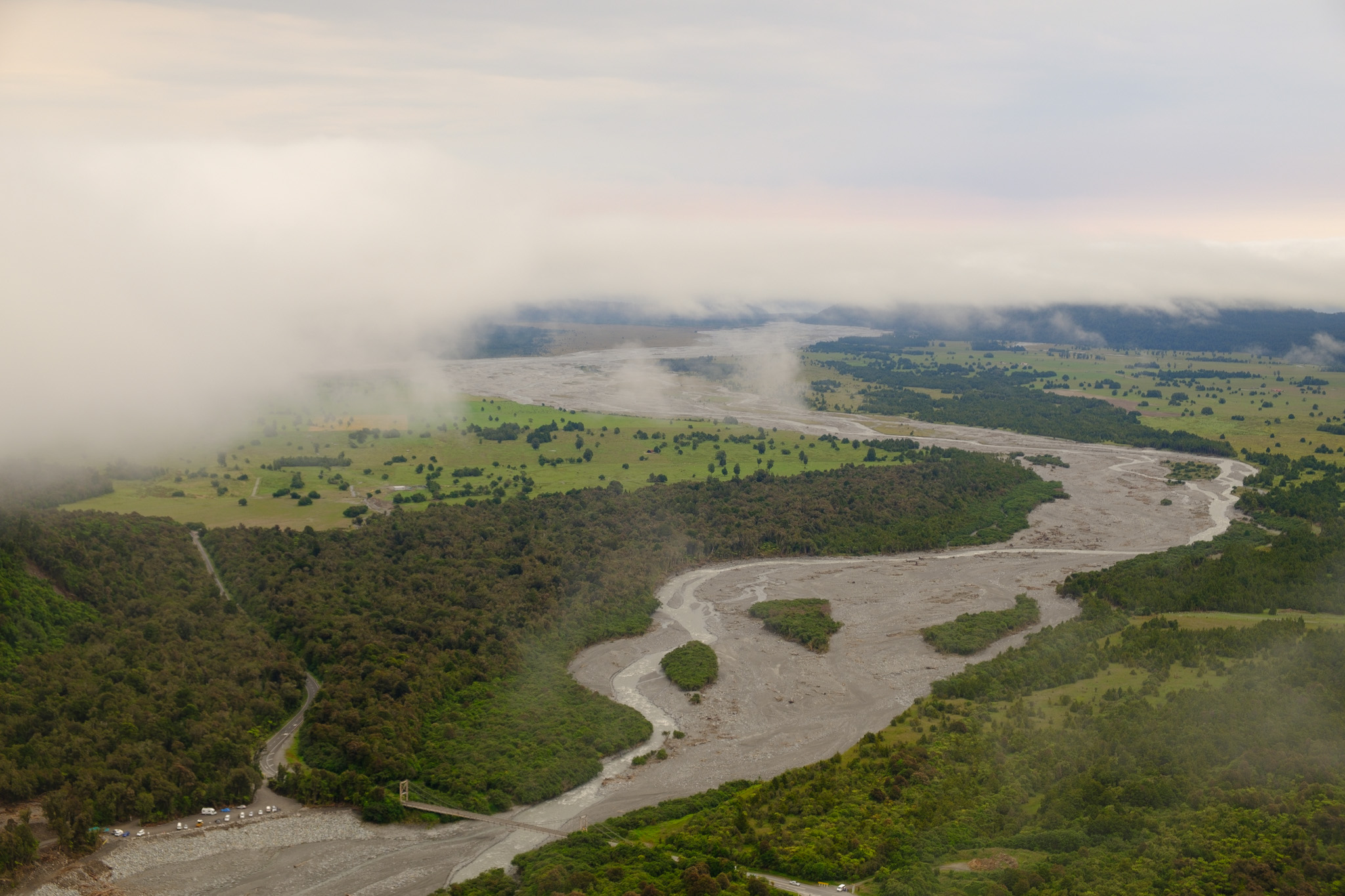 Dieses Jahr sind aber die Wetterbedingungen sehr speziell. Im März ging ein riesiges Unwetter nieder, welches eine wichtige Brücke auf dem SH6 beschädigte. Dann folgte am 7. Dezember eine weitere Flut, welche den SH6 erheblich beschädigte und den Ort Fox Glacier von der Umwelt abschnitt. Es gab 3 Tage keinen Strom, sehr viele Touristen waren eine Woche eingeschlossen und wurden danach in einem Convoy von der Polizei aus dem Gebiet eskortiert. Der SH6 wurde rasch wieder instand gestellt (allerdings nur tagsüber befahrbar), damit die Hochsaison ab Weihnachten nicht gefährdet war. Allerdings gab es im Dezember nur 6 Tage, an denen Helikopterflüge ab Fox Glacier möglich waren.