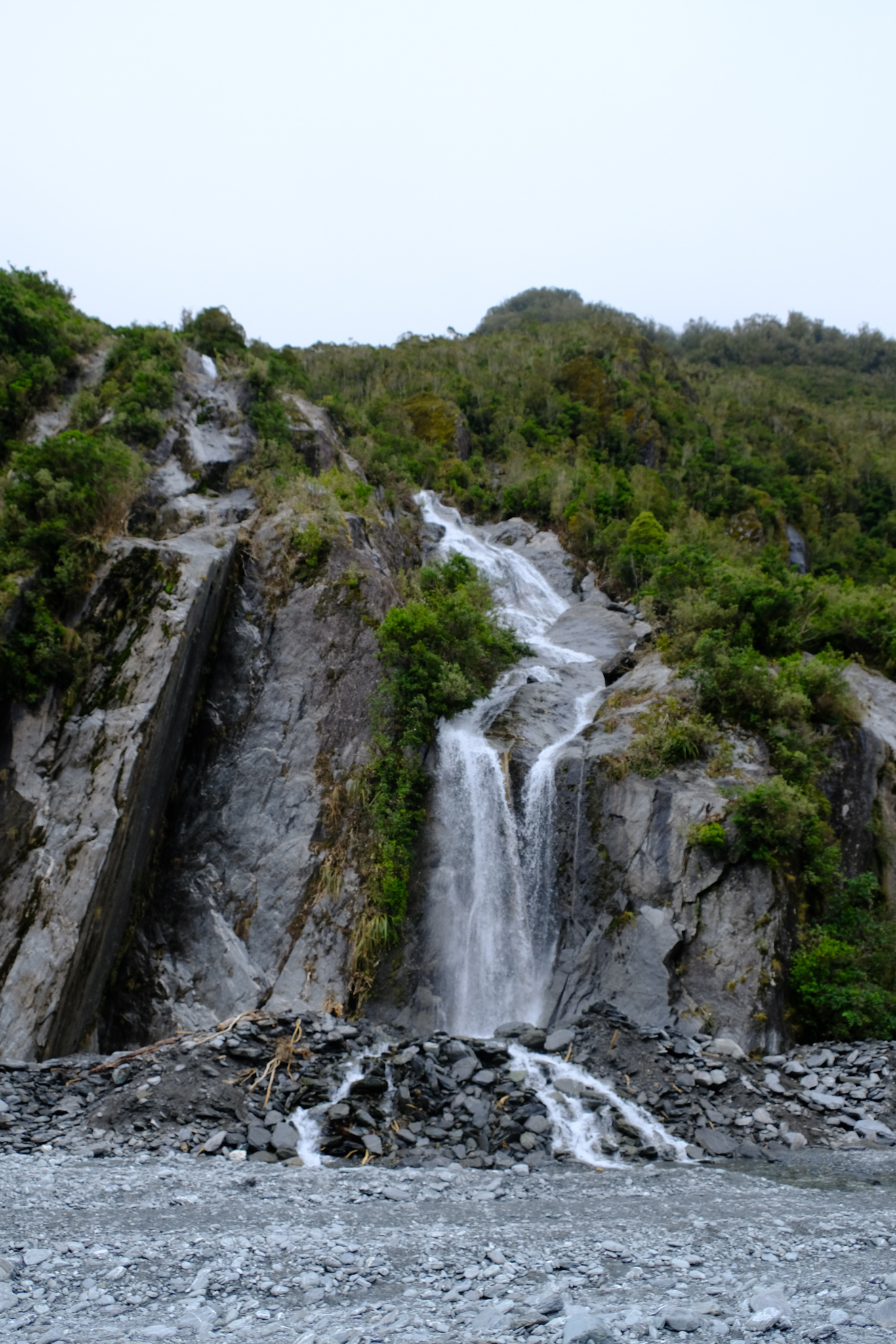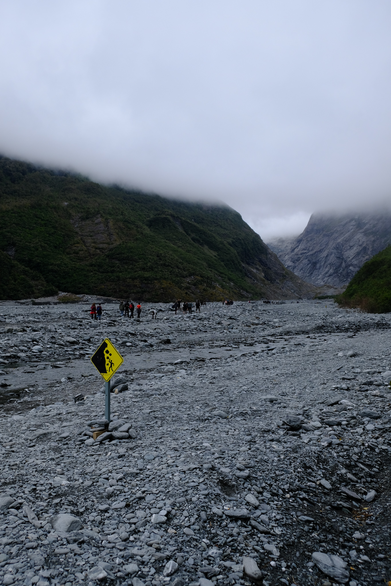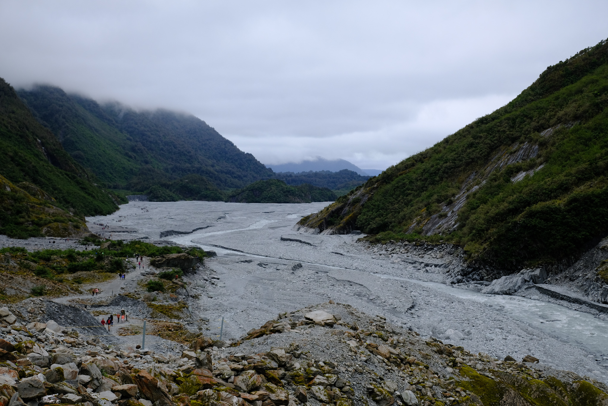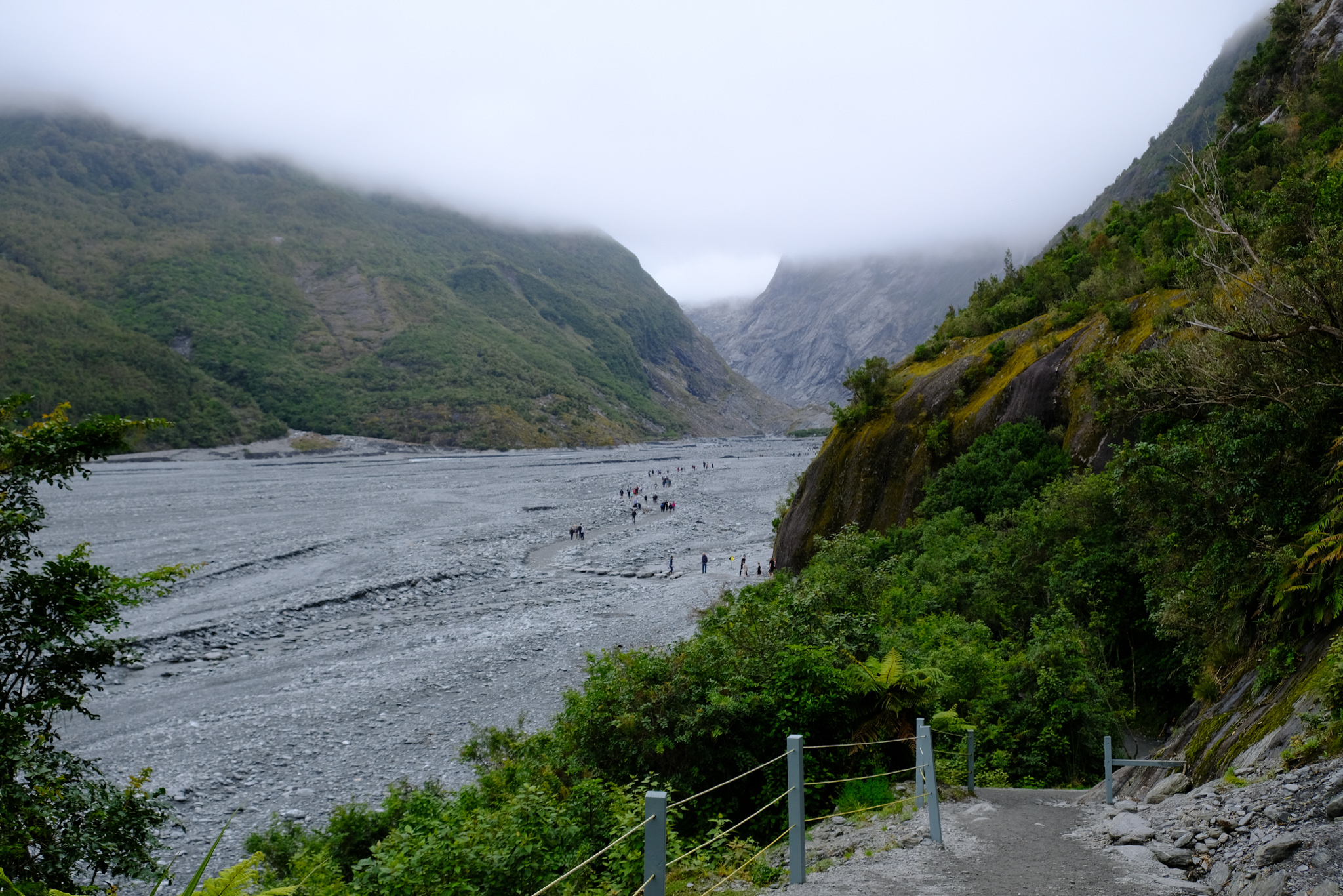 Da auf meinem (verregneten) Weg zuerst Franz Josef lag, habe ich mich entschlossen, die 4km lange Stichstrasse zum Parkplatz zu fahren und die 2.7km lange Wanderung durch das steinige und beeindruckende Tal des Gletscherflusses zu absolvieren. Da wusste ich noch gar nicht, dass man den Fox Gletscher gar nicht mehr zu Fuss erreichen kann. Wäre ich den Reiseführern gefolgt, hätte ich eher Fox besuchen sollen.
