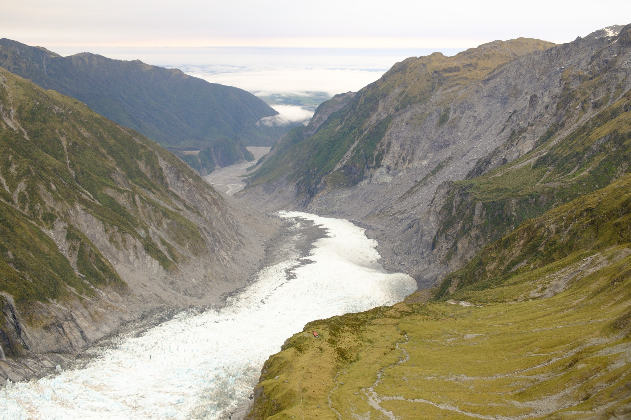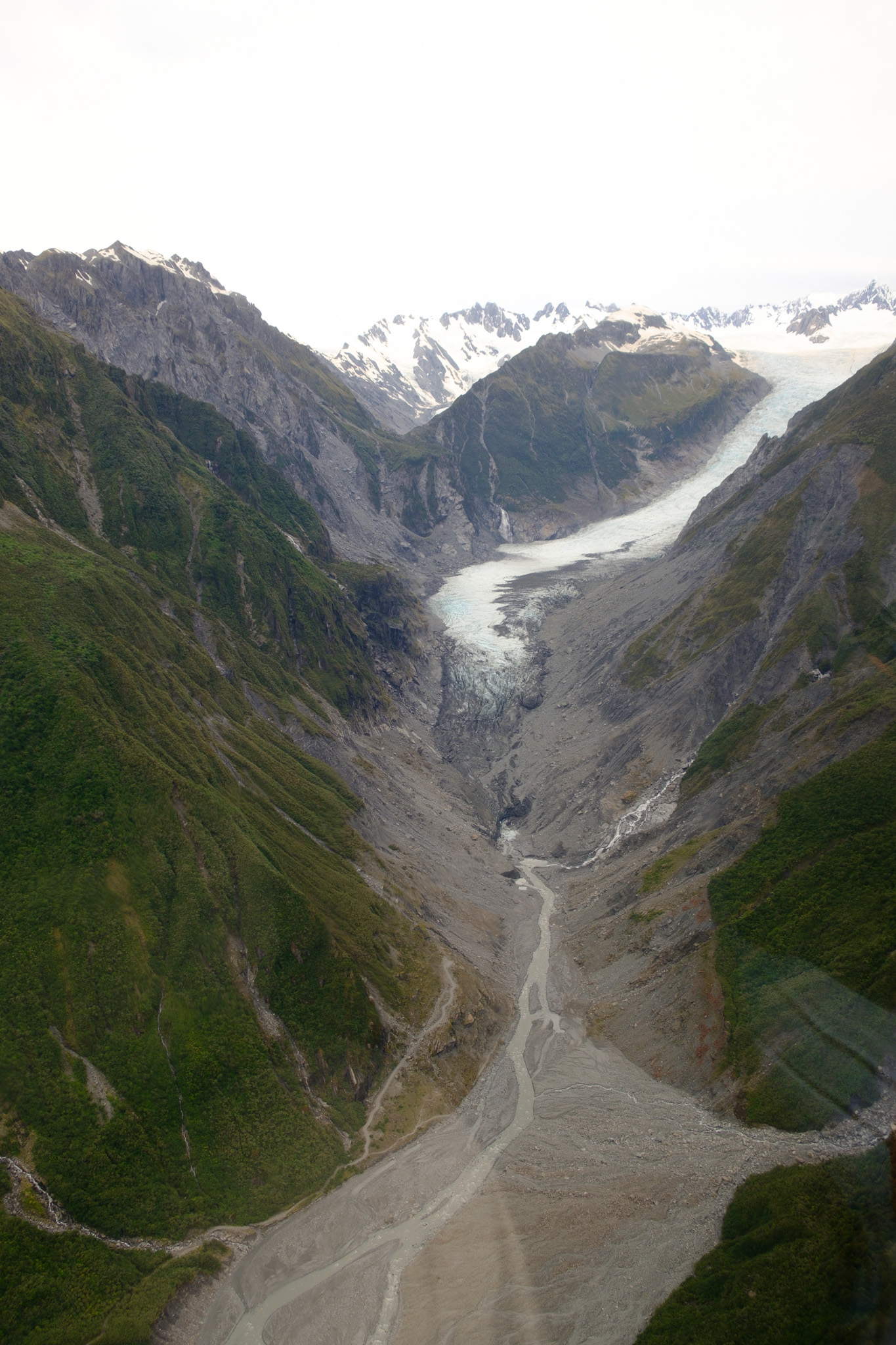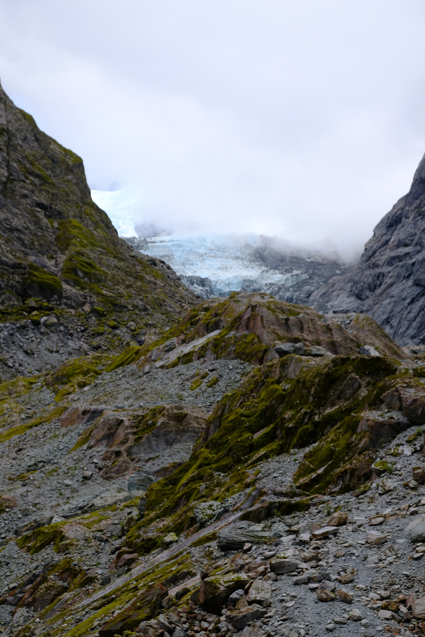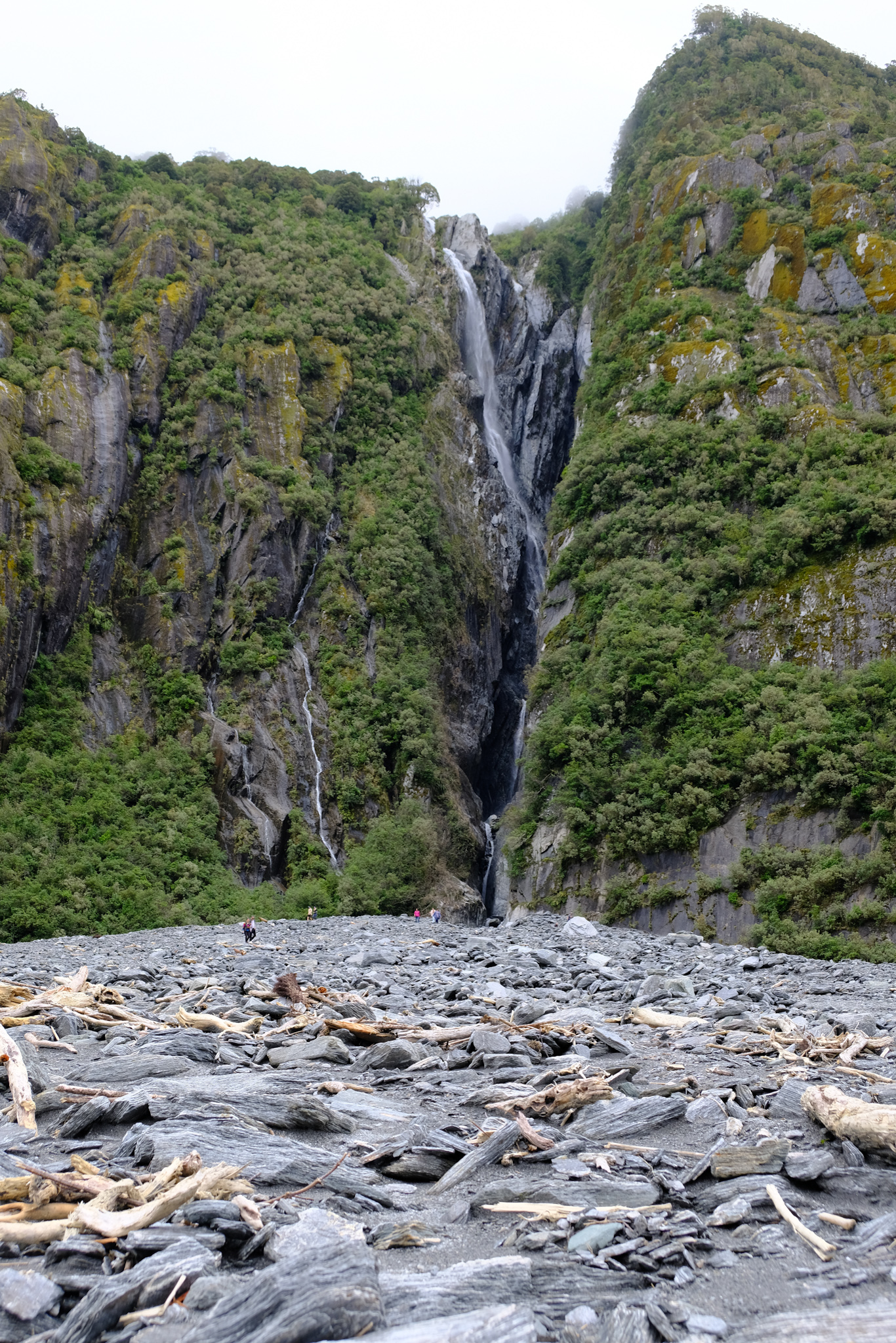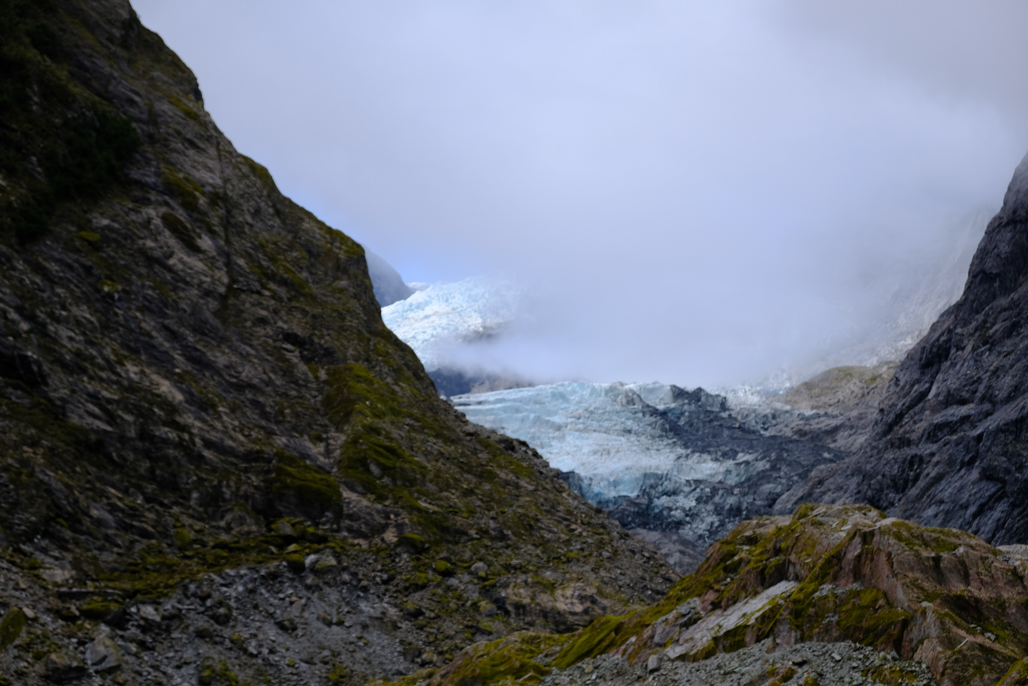 Da auf meinem (verregneten) Weg zuerst Franz Josef lag, habe ich mich entschlossen, die 4km lange Stichstrasse zum Parkplatz zu fahren und die 2.7km lange Wanderung durch das steinige und beeindruckende Tal des Gletscherflusses zu absolvieren. Da wusste ich noch gar nicht, dass man den Fox Gletscher gar nicht mehr zu Fuss erreichen kann. Wäre ich den Reiseführern gefolgt, hätte ich eher Fox besuchen sollen.