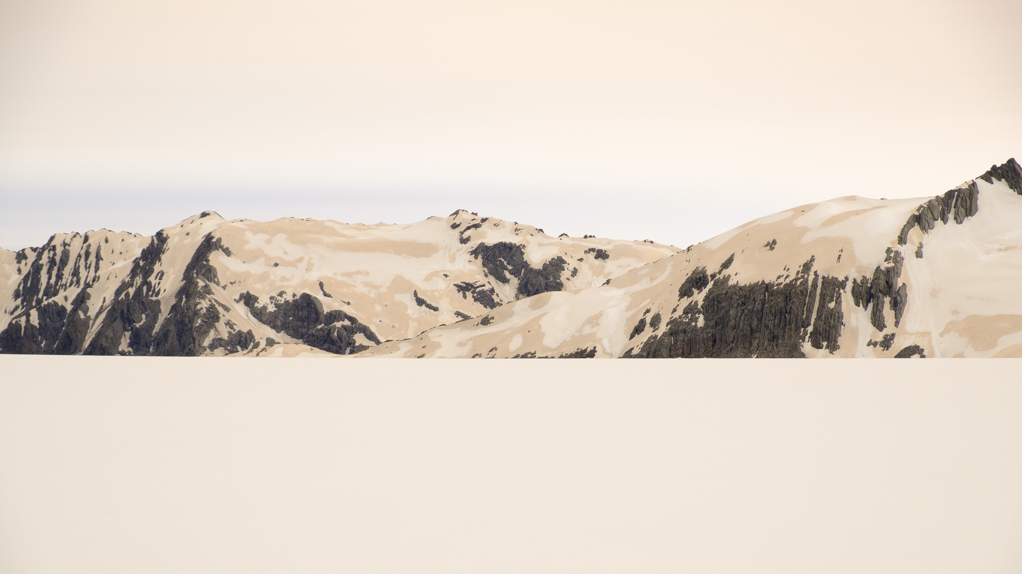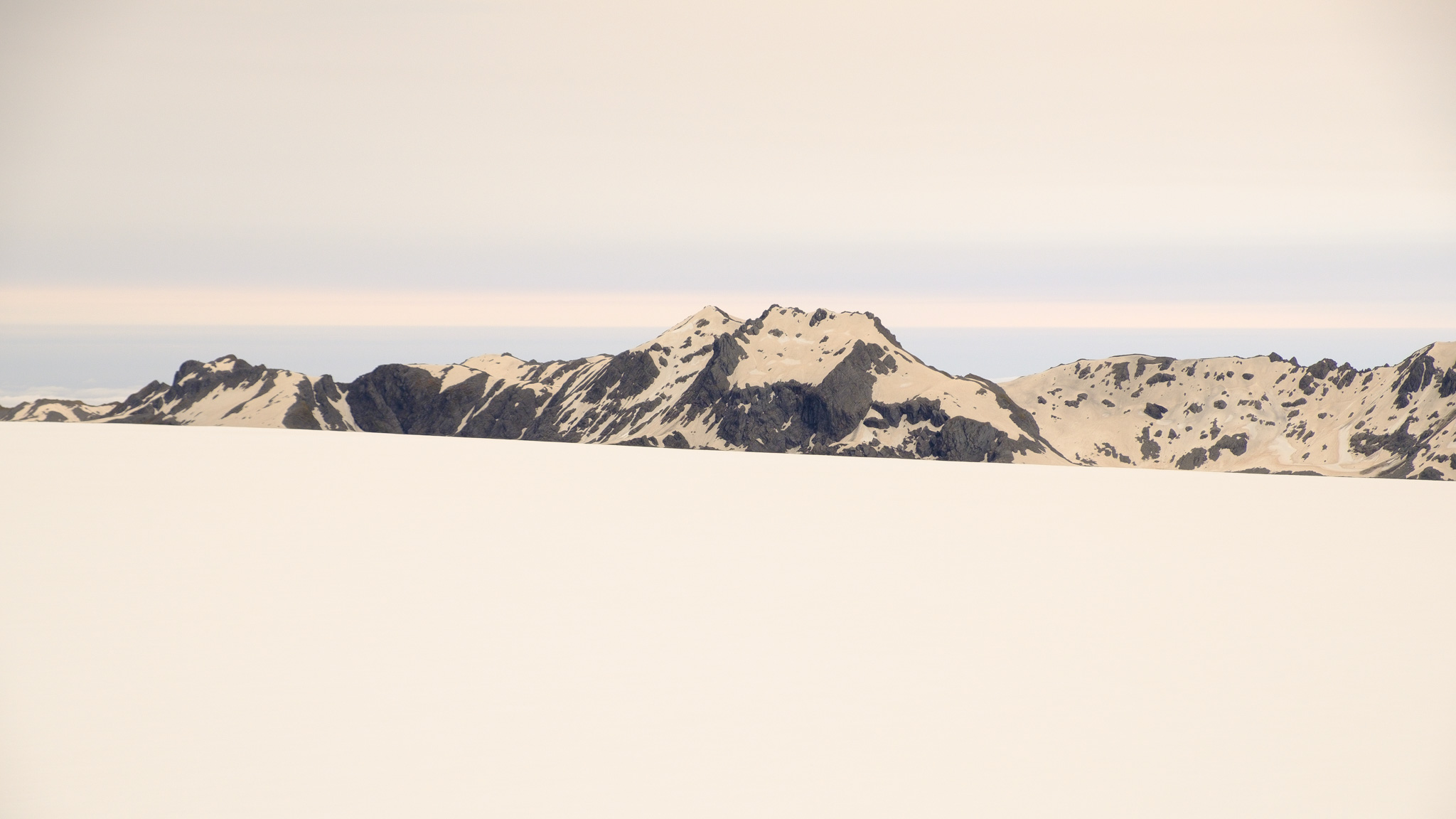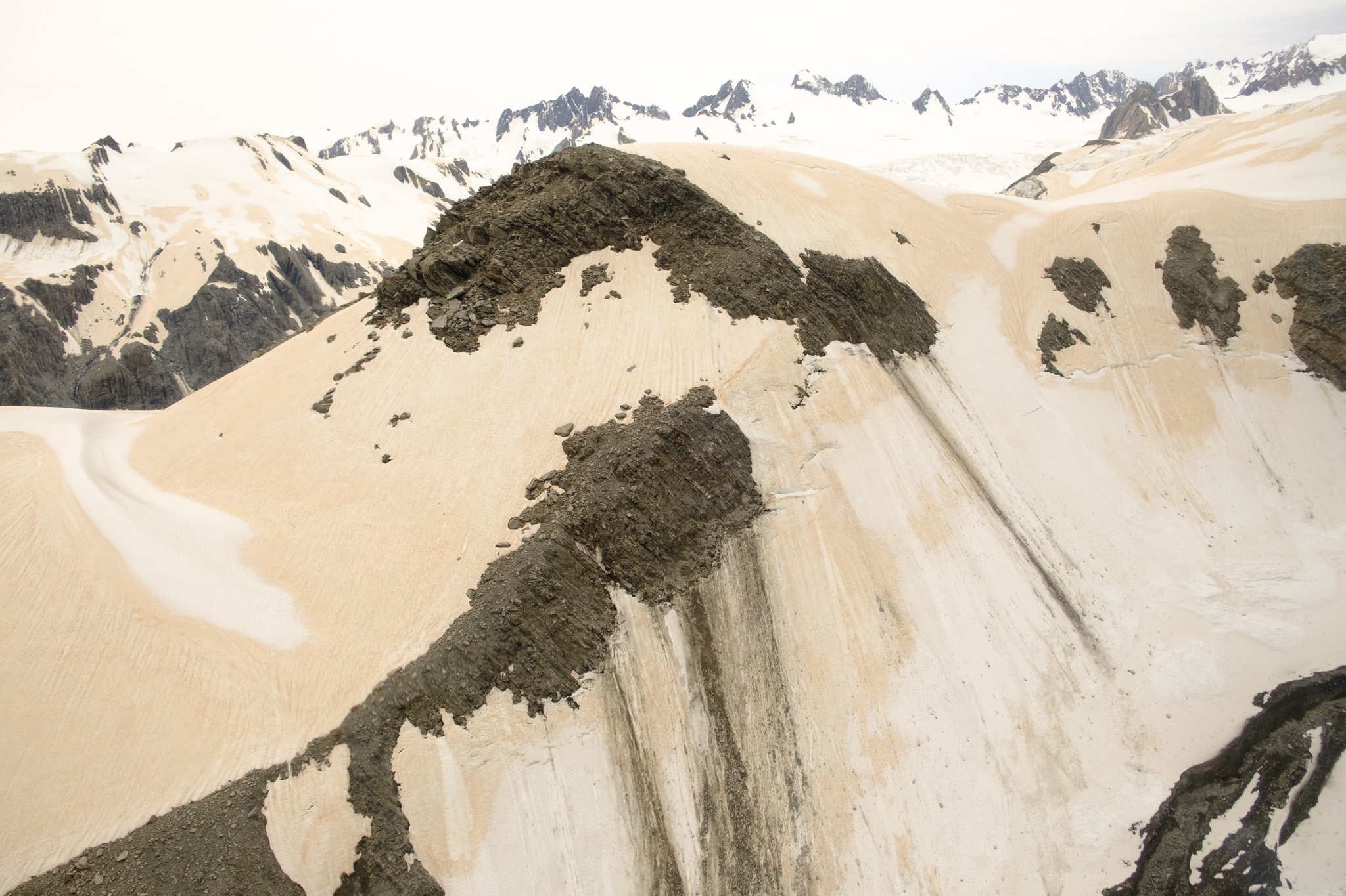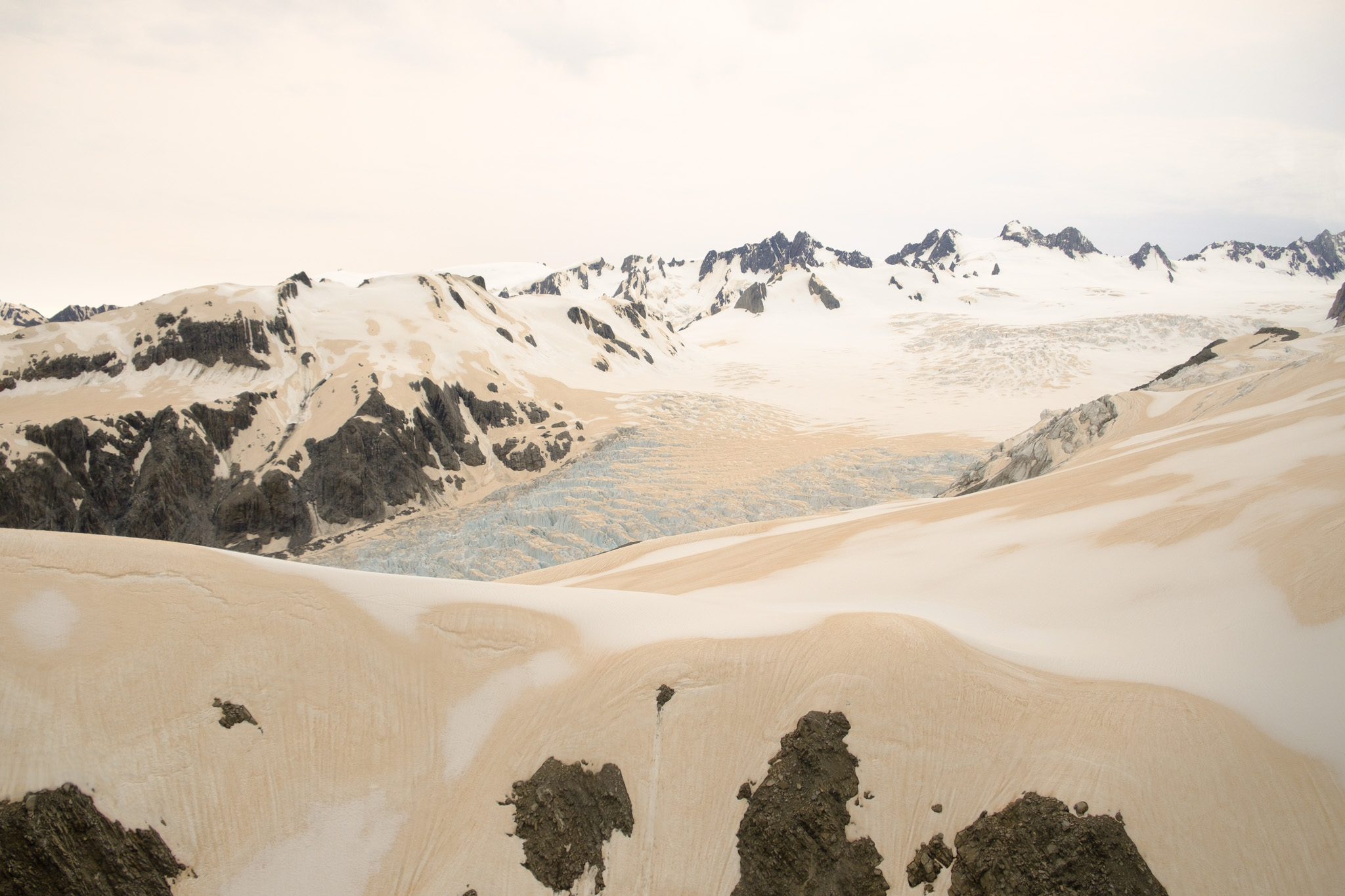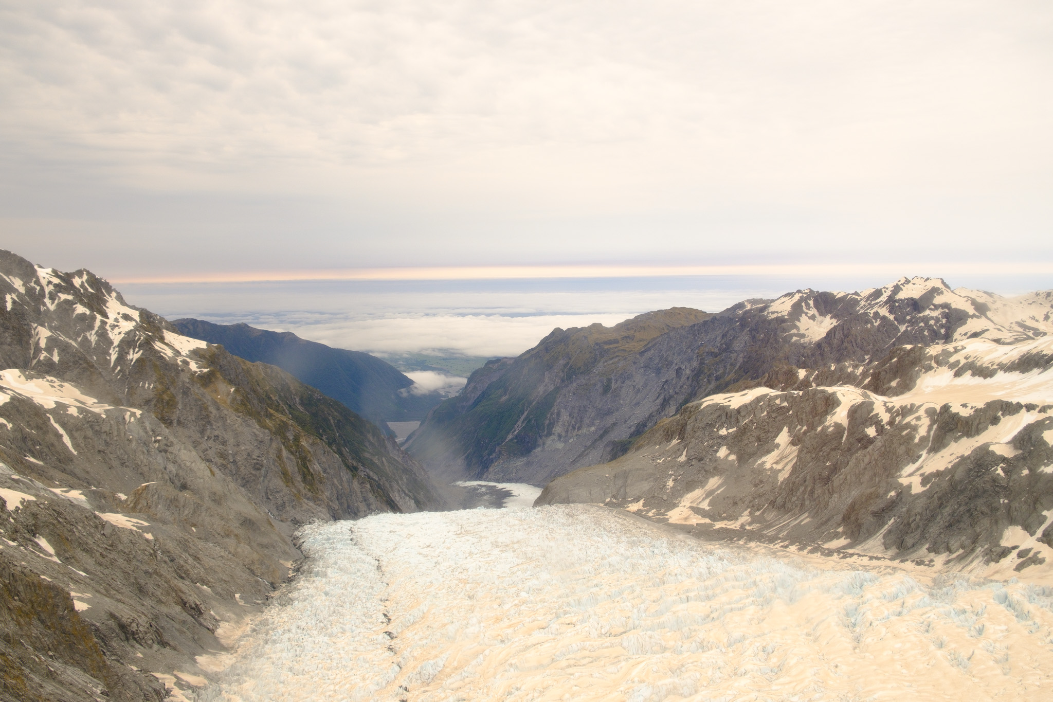 Dann ging es los! Entlang der nördlichen Talseite flogen wir zum Gletscher. Was für eine geniale Aussicht. Die Farben! Die Formen! Das sehr angenehme Schweben des Helikopters! Auf dem Gletschereis sind sehr gut die braunen Ablagerungen des Staubs von den Buschfeuern in Australien zu sehen. Und ich denke, dass der rosa-braune Farbstreifen am Horizont auch davon stammt.