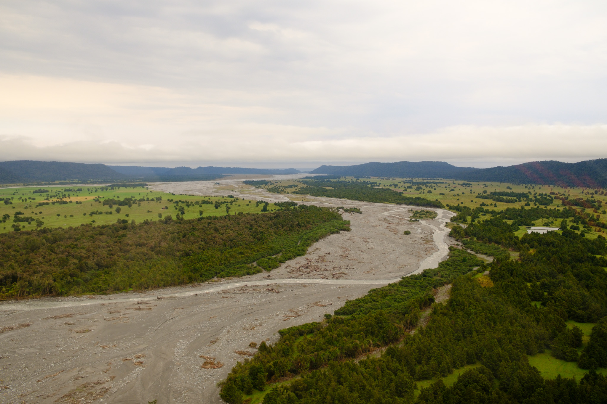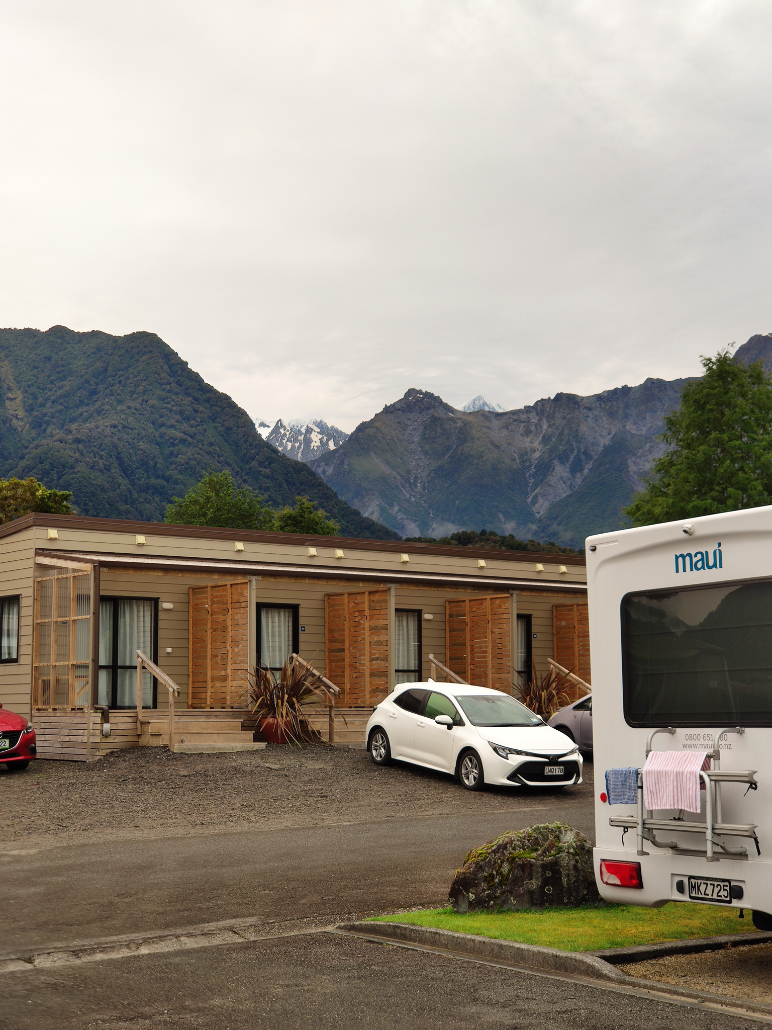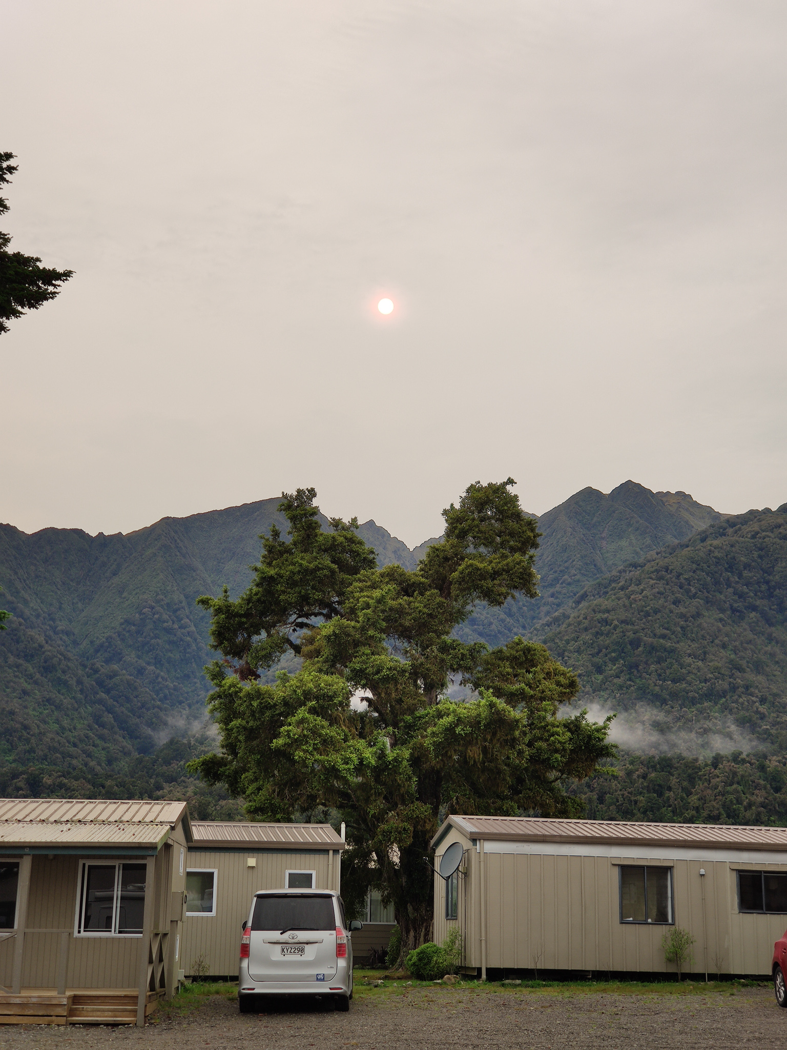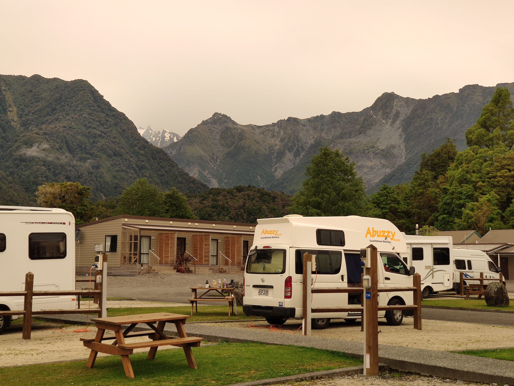 Wie auf Wolken schwebend ging ich wieder zurück zum Campingplatz. Dort zeigte sich, dass das Flugwetter schon wieder beendet war. Wolken versperrten erneut das Gletschertal. So blieb es dann auch den ganzen Tag. Es hoben nur etwa 2-4 weitere Helikopter im Ort ab, die vielleicht mal den Franz Josef Gletscher anflogen und ein eventuell ein weiteres wolkenfreies Fenster am Nachmittag nutzten.